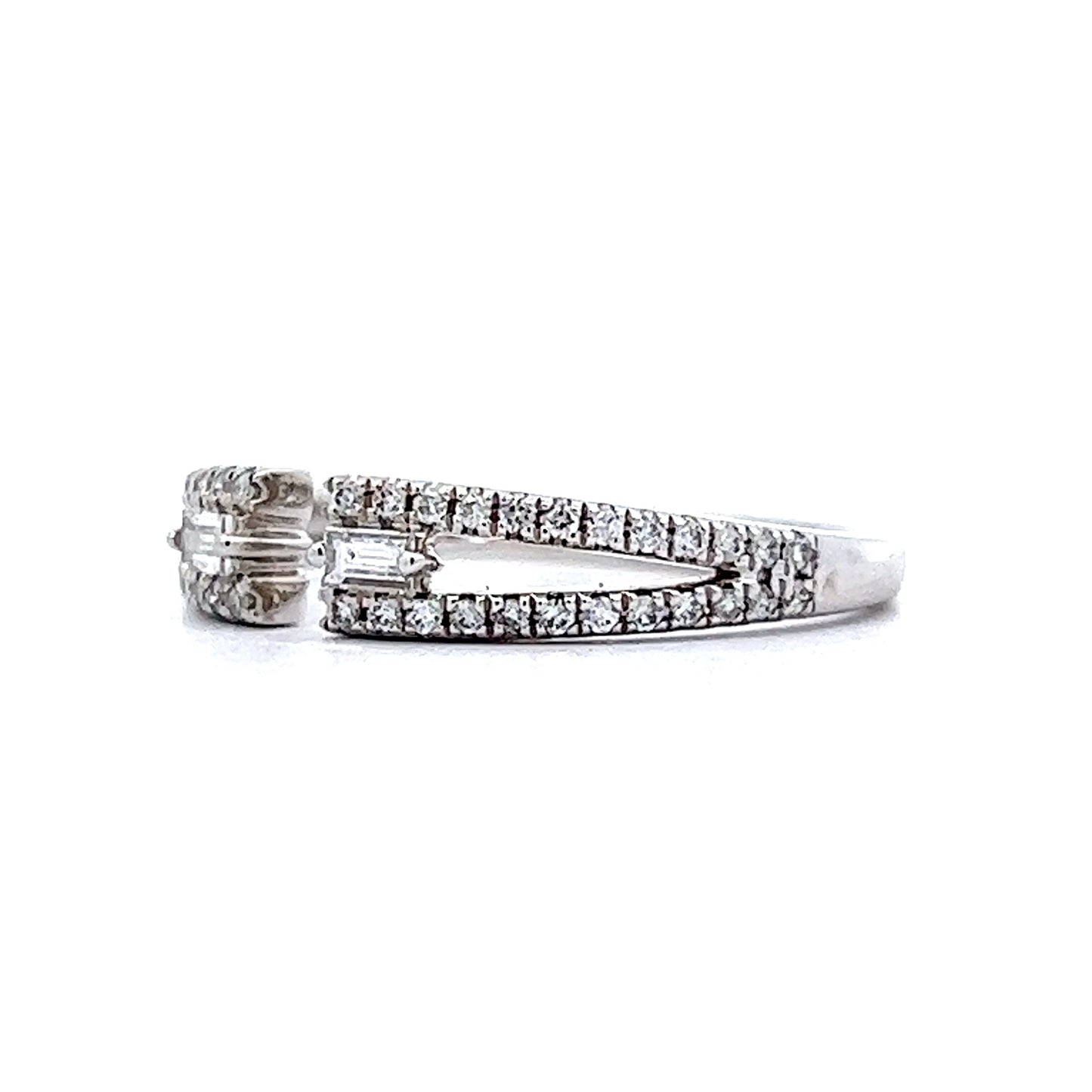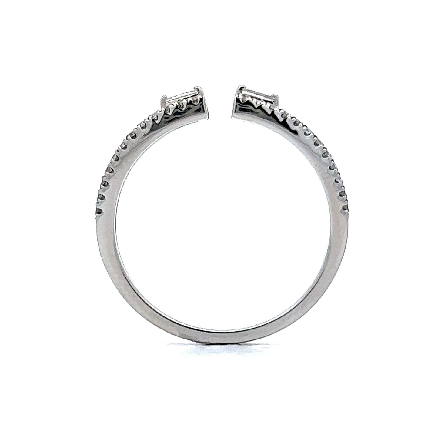 .28 Diamond Open Wedding Band in 18k White Gold. This modern wedding band features .28 carats of diamonds finished in polished 18 karat white gold. Two (2) .045 carat diamonds are prong set on the open spaces of the split shank band. Forty-eight (48) .0039 carat diamonds are set in delicate French V split prongs, accenting the shoulders of the band. From the sparkling diamonds to the shimmering platinum band, this wedding ring has a gorgeous, modern design that will pair well with any style of engagement ring!