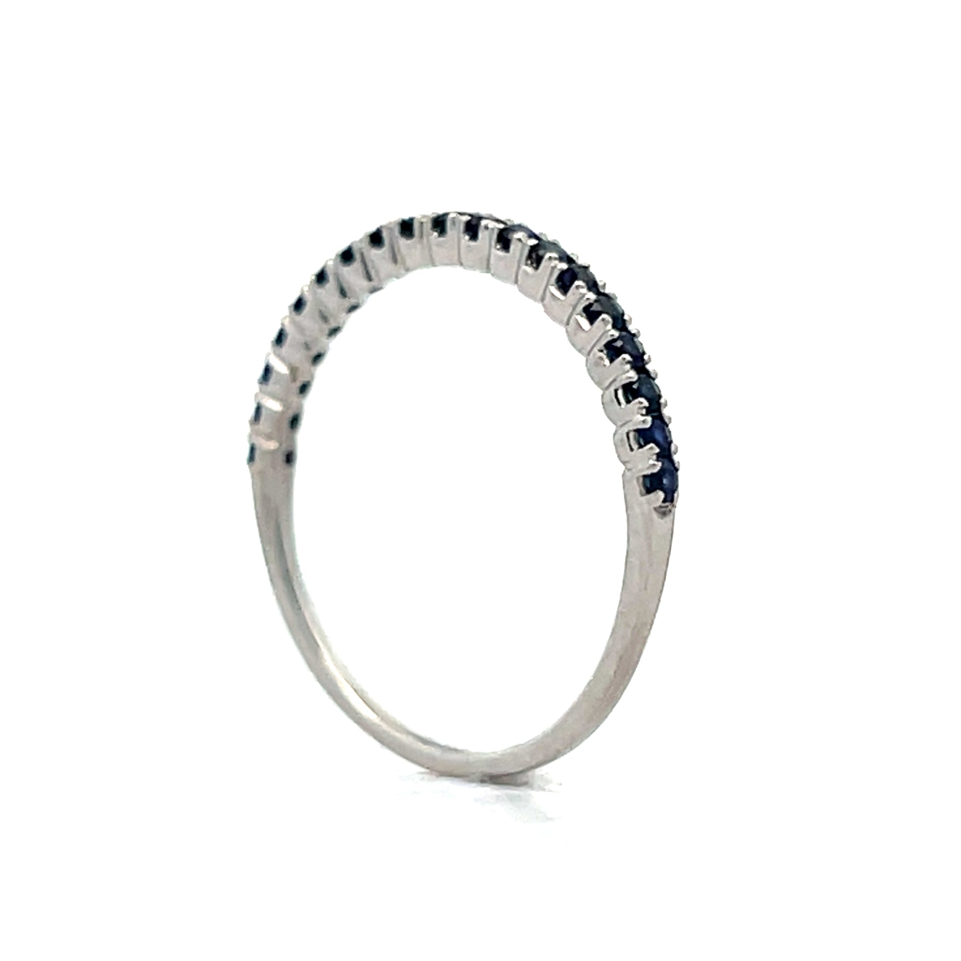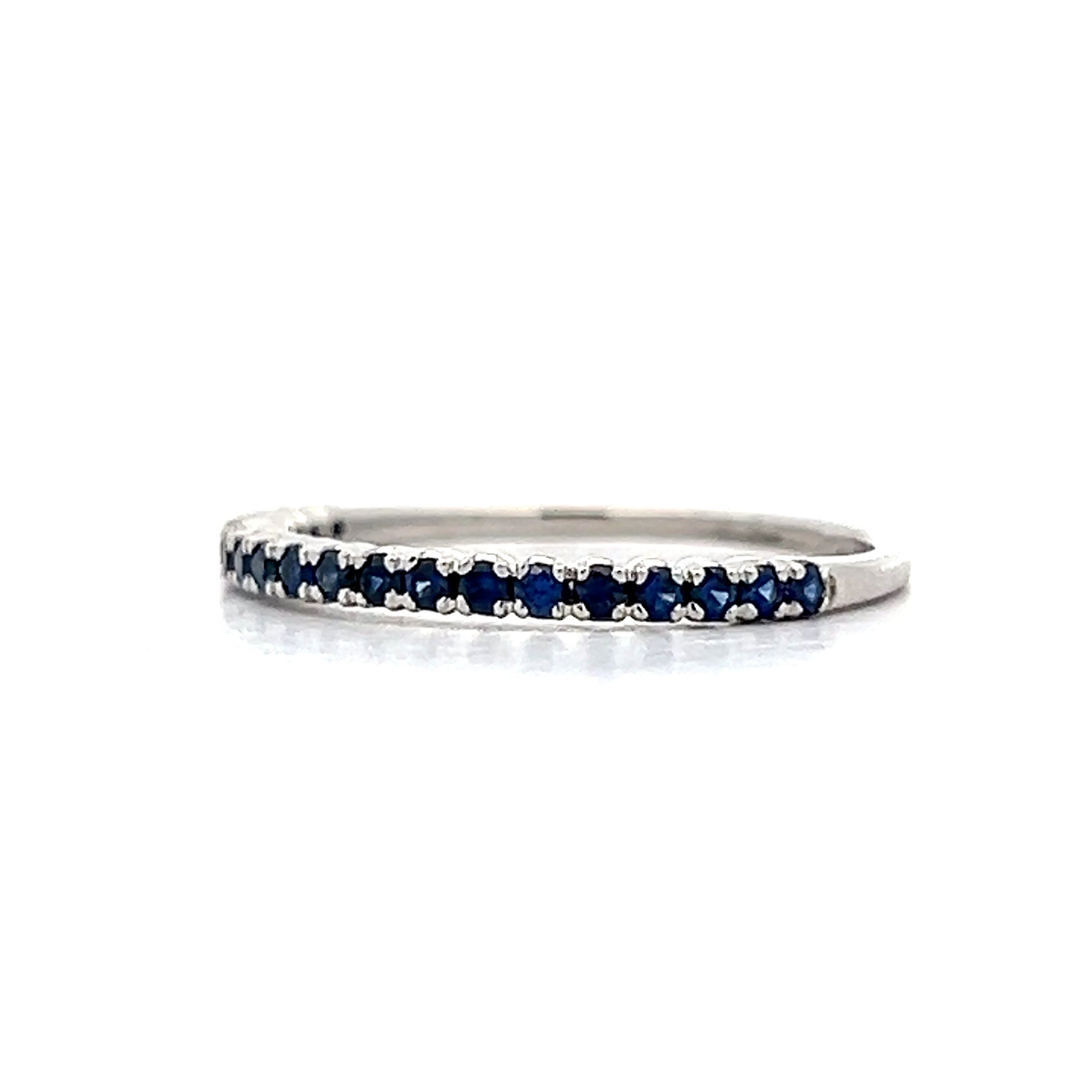This 18 karat white gold wedding band features round cut blue sapphires totaling .28 carats set with French prongs. The sapphires create a gorgeous contrast against the white gold band. The prong settings allow light to enter the stones, enhancing their blue sparkle.While designed for stacking, the band can be worn alone or layered.