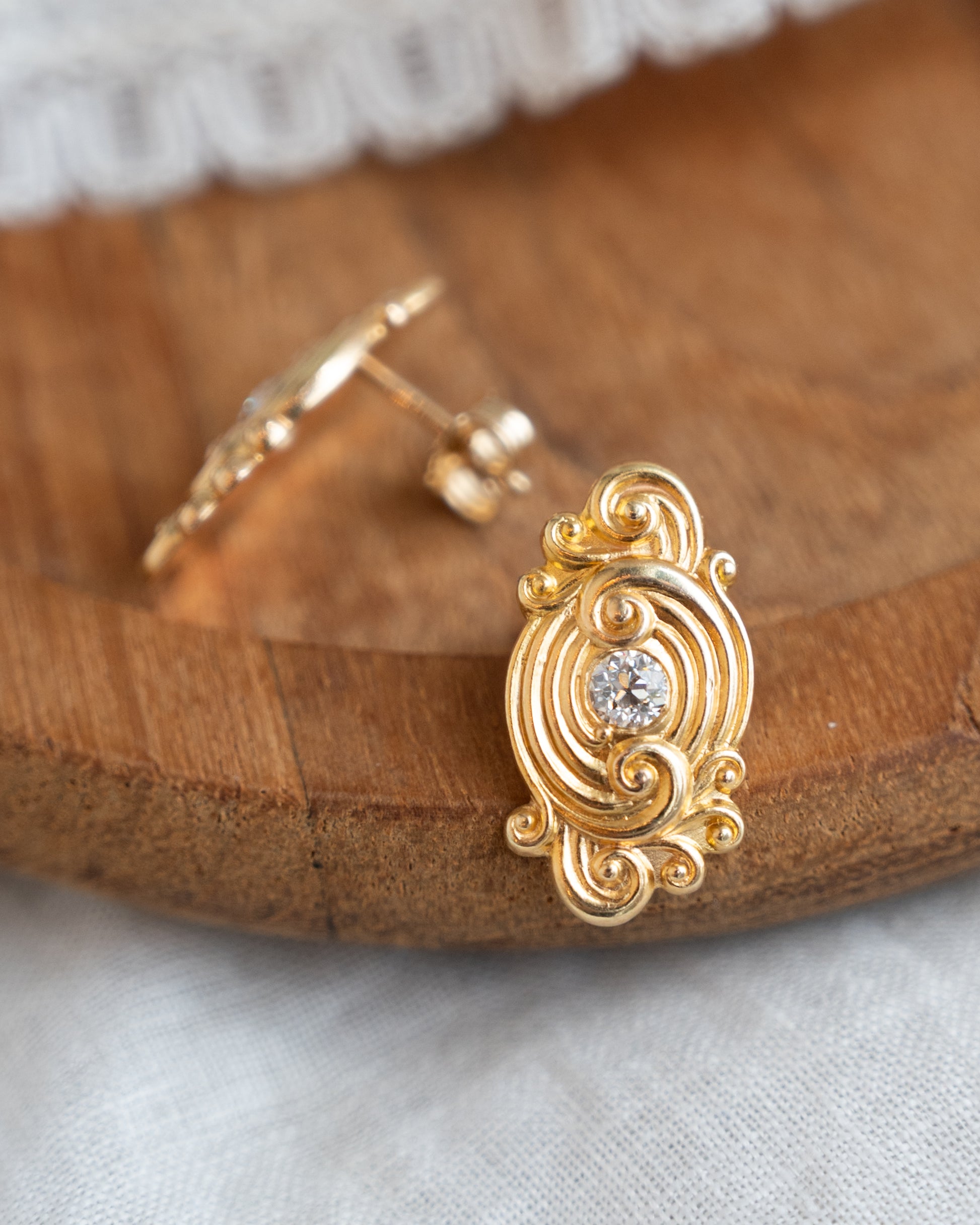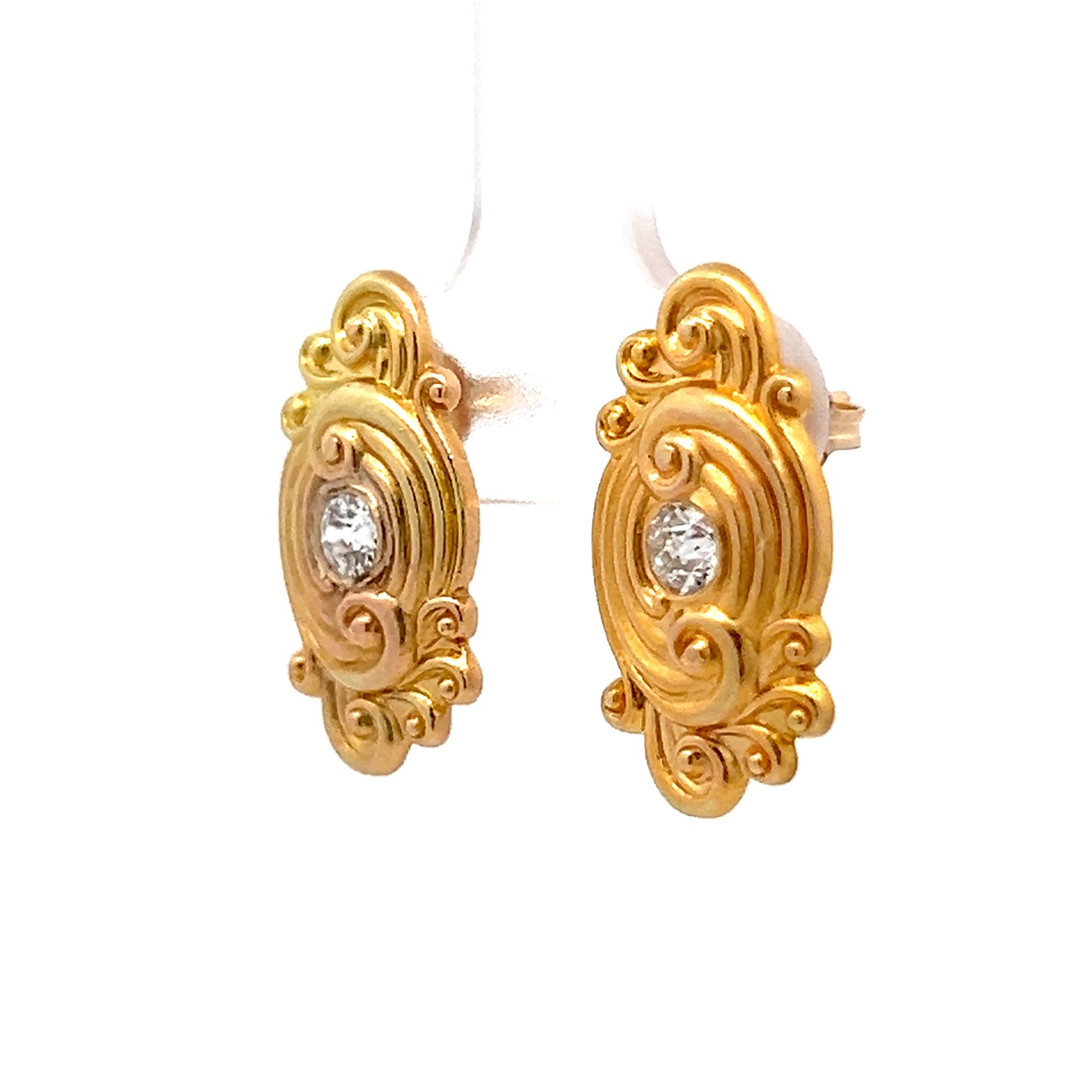 These Art Nouveau stud earrings, originally cufflinks converted into earrings, feature Old European cut diamonds totaling .28 carats with SI2 clarity and I color, set in 14 karat yellow gold with intricate filigree swirl patterns characteristic of the period. Signed by Shreve & Co, these antique earrings are a rare and highly collectible.