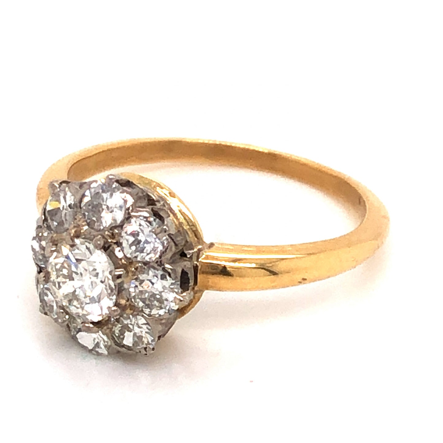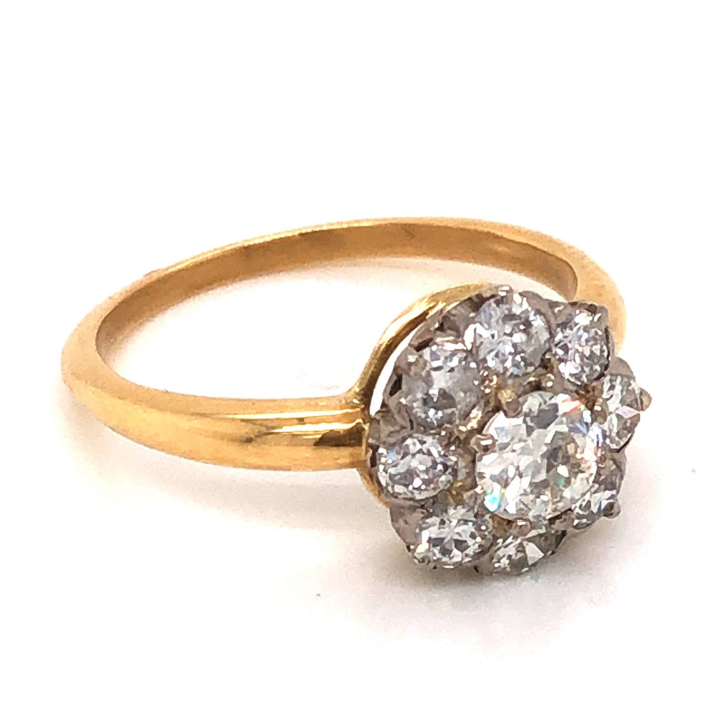 .28 Victorian Diamond Cluster Engagement Ring in 18k. This antique cluster engagement ring features .92 carats of diamonds finished in 18 karat white and 18 karat yellow gold. The center diamond is a .28 carat Old European cut gem. With intricate, glittering facets, the center stone is prong set in white gold. The center diamond is near colorless and haloed by eight (8) .08 carat accent diamonds. The cluster of diamonds at the head of the ring are mounted in an ornate Victorian basket.