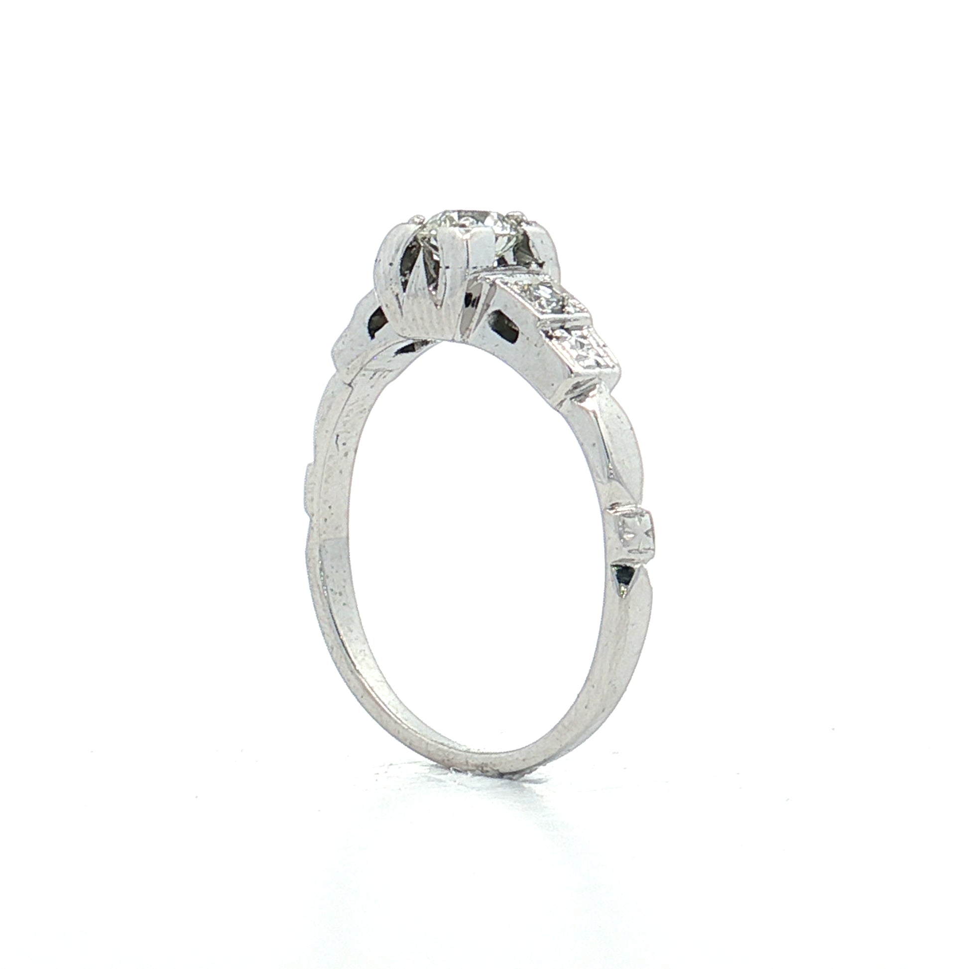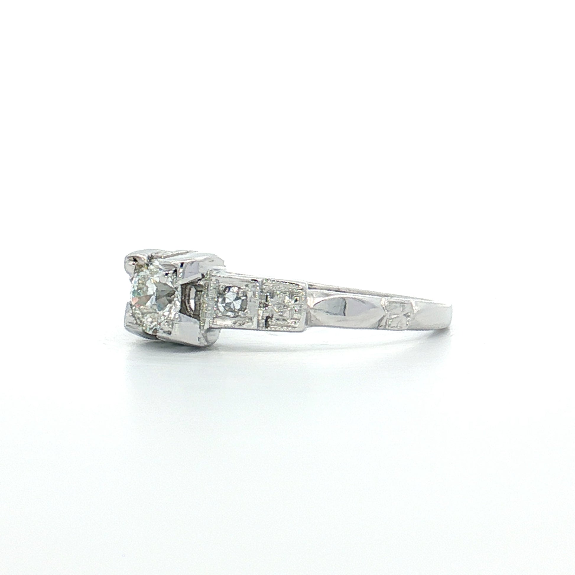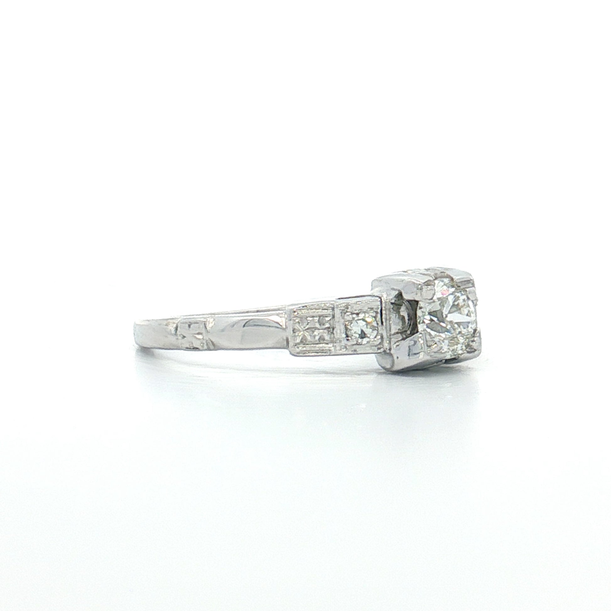 This Art Deco three-stone ring features a .28-carat old European cut center diamond with two .03-carat single cut accent diamonds in 18K white gold. The center diamond grades K in color, showing warmth that gives it a buttery tone rather than icy white, and VS2 clarity, meaning inclusions are not visible to the naked eye.