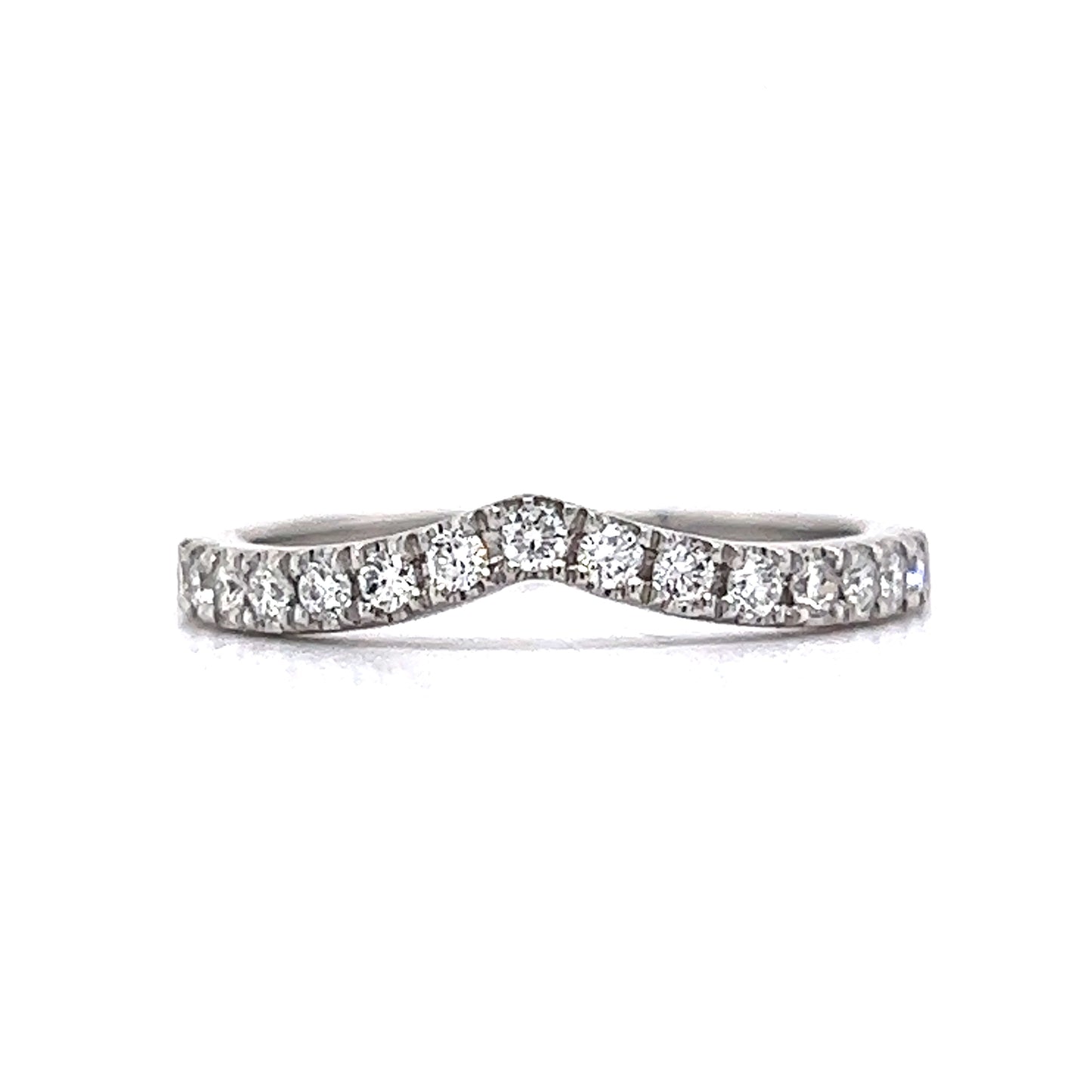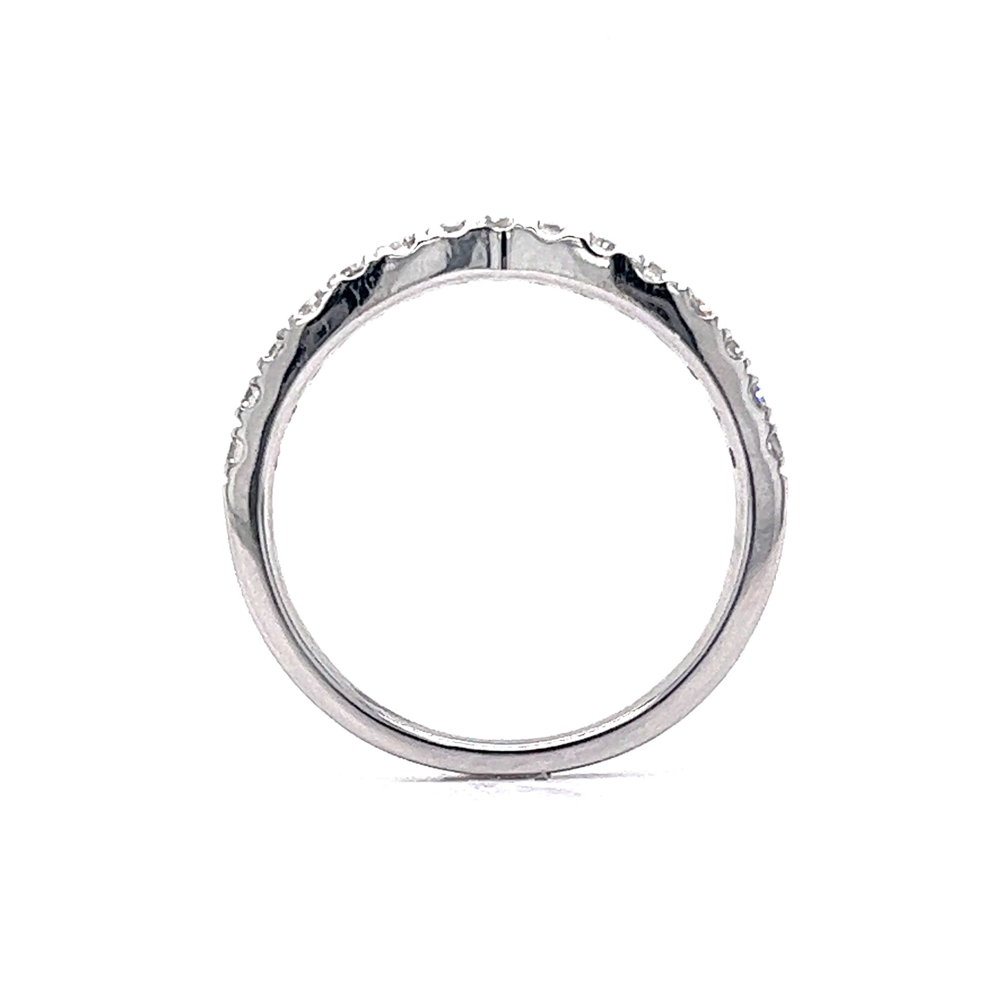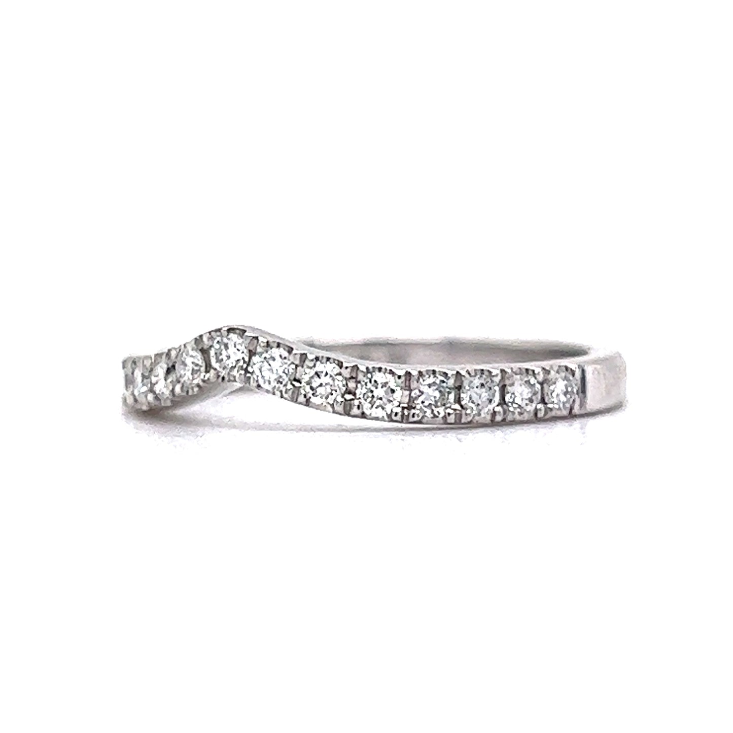 .29 Curved Diamond Wedding Band in 14k White Gold. This modern diamond wedding band features .29 carats of sparkling diamonds finished in shimmering 14 karat white gold. Fifteen (15) .0193 carat diamonds are set in prongs on the front half of the ring. The diamonds are eye clean and stunningly brilliant. The band has a gentle curve that will allow it to snuggle in next to a wider engagement ring.