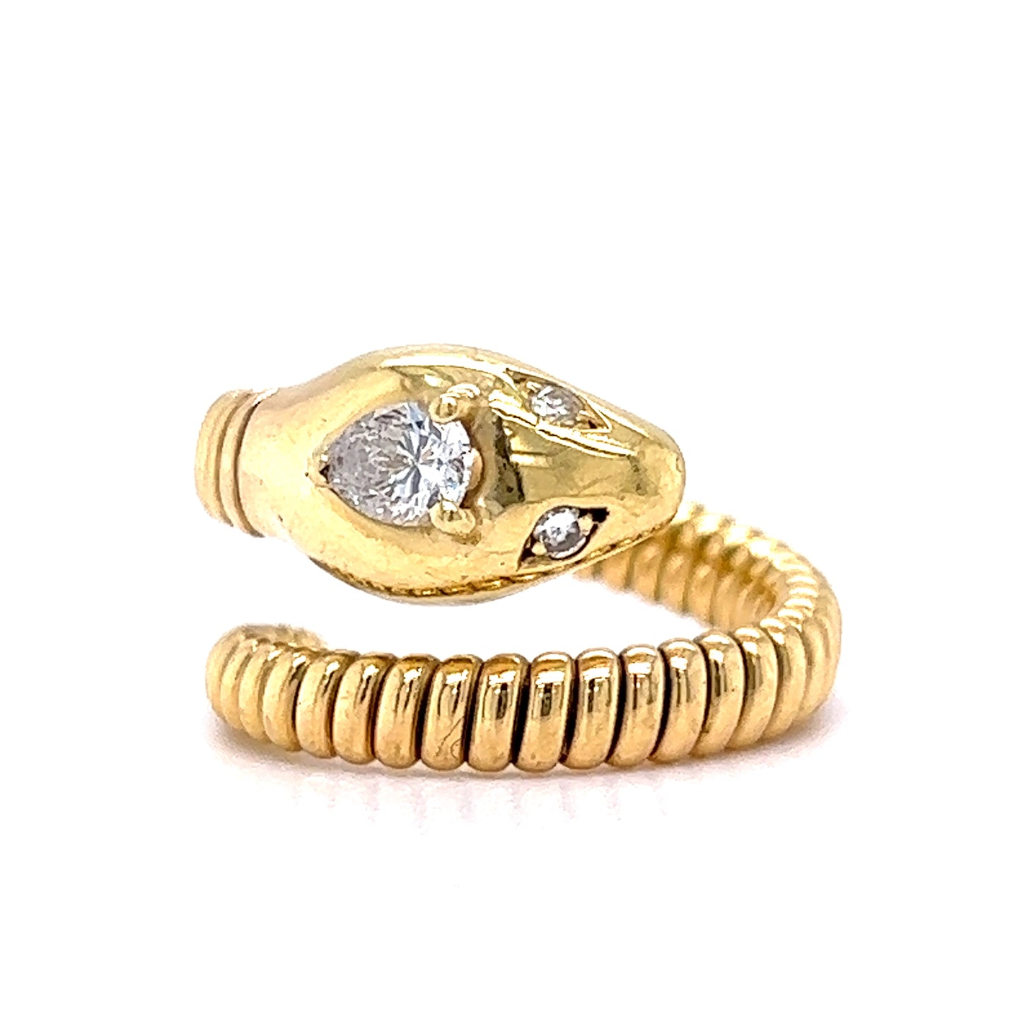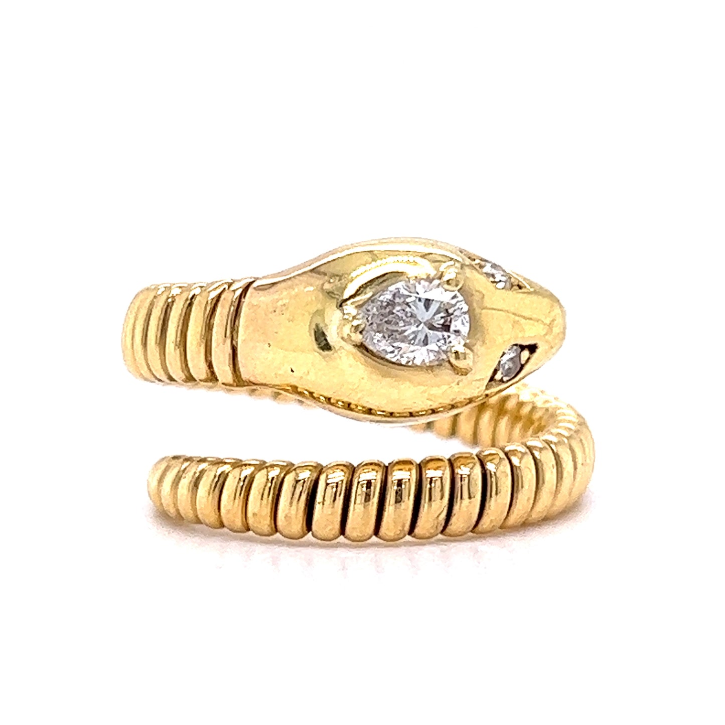 This unique snake ring has a modern silhouette and dazzling texture. Crafted in 18 karat yellow gold, the linear engravings create a striking presence. Two (2) diamonds sparkle like the eyes of the serpent, each weighing .02 carats and measuring 1.75 mm. The focal point of the cocktail ring is set with a pear-shaped .29 carat diamond of H color and SI2 clarity. Wearable art with a fierce beauty!