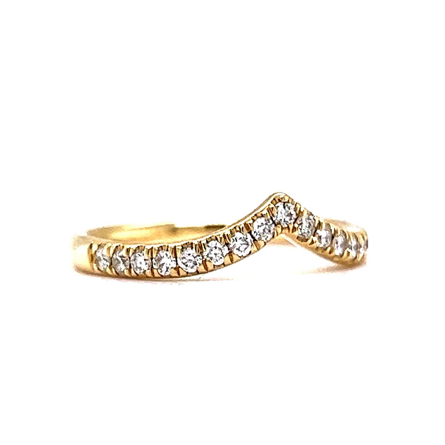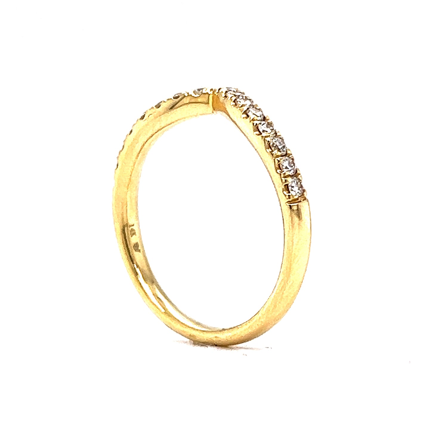 This curved diamond wedding band features .29 carats of Round Brilliant cut diamonds finished in 14 karat yellow gold. The curve in the band features lovely French V split prong settings that gives a nice border on each side of the diamonds. Finished in vibrant 14 karat yellow gold, this curved wedding band leaves space for the stone in an engagement ring or can be worn on the end of a right hand stack of rings.