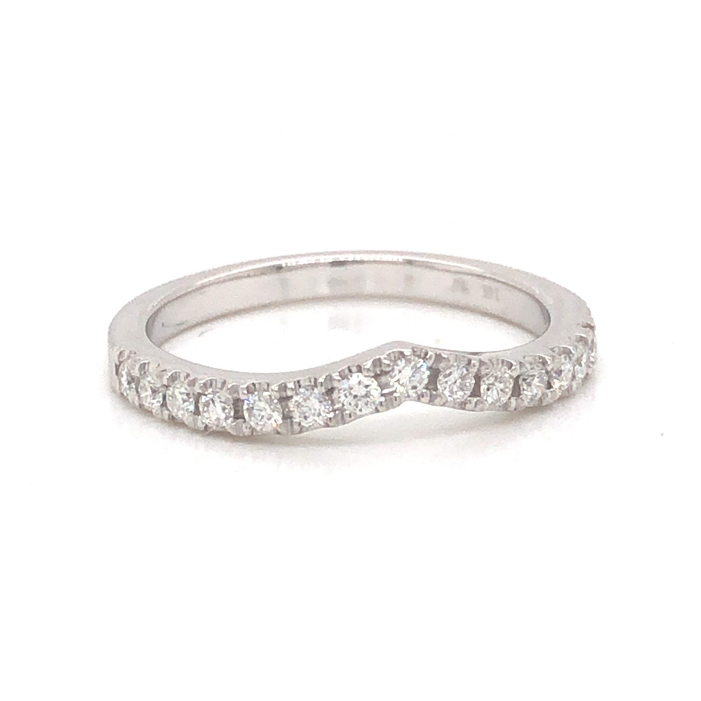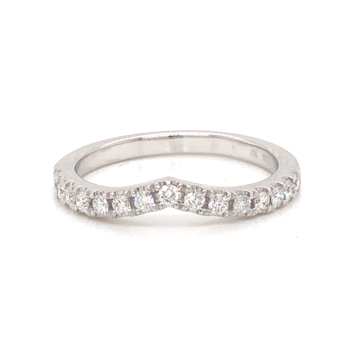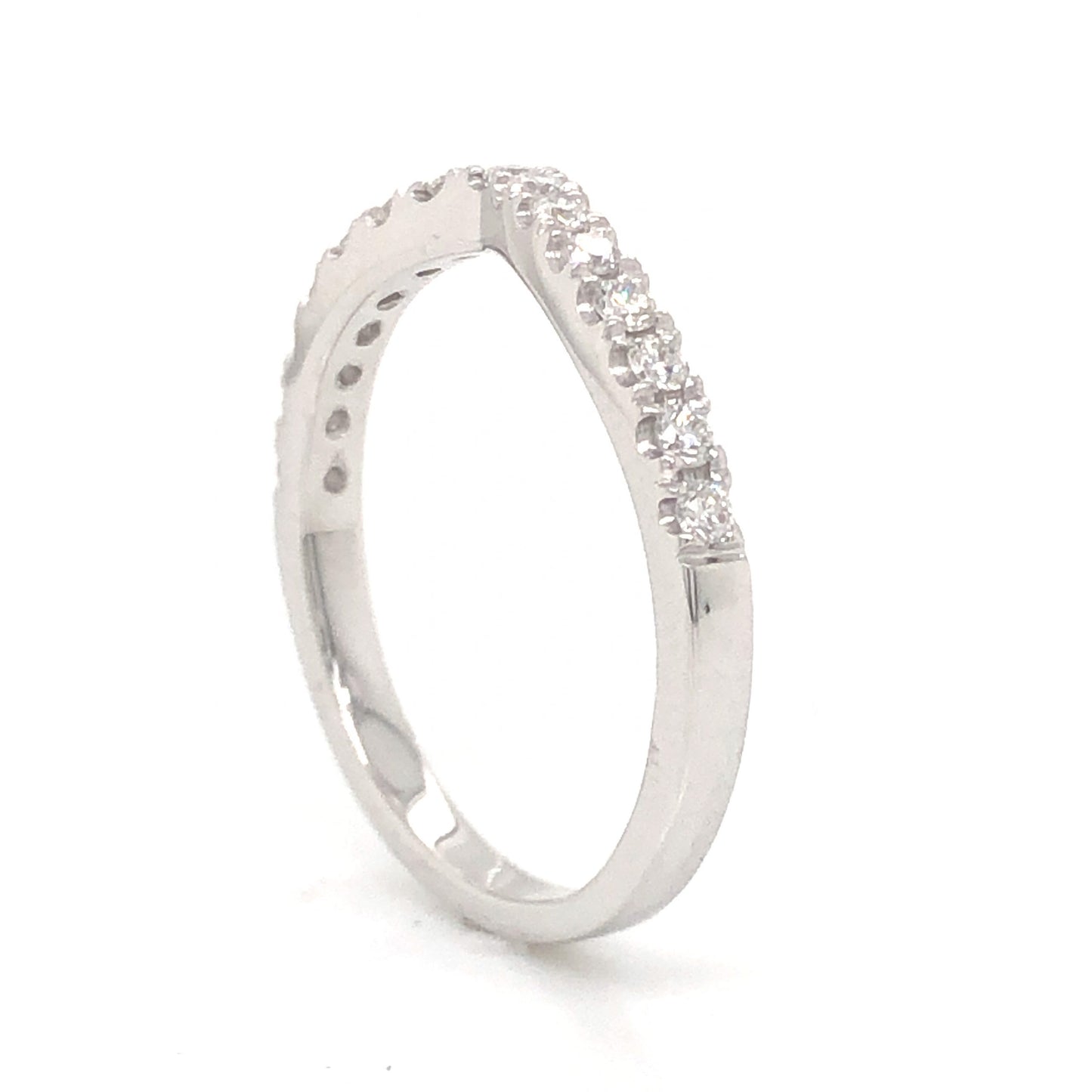 .29 Shaped Diamond Wedding Band in 14k White Gold. This modern diamond wedding band features .29 carats of sparkling diamonds finished in shimmering 14 karat white gold. Fifteen (15) .0193 carat diamonds are set in prongs on the front half of the ring. The diamonds are eye clean and stunningly brilliant. The band has a gentle curve that will allow it to snuggle in next to a wider engagement ring.