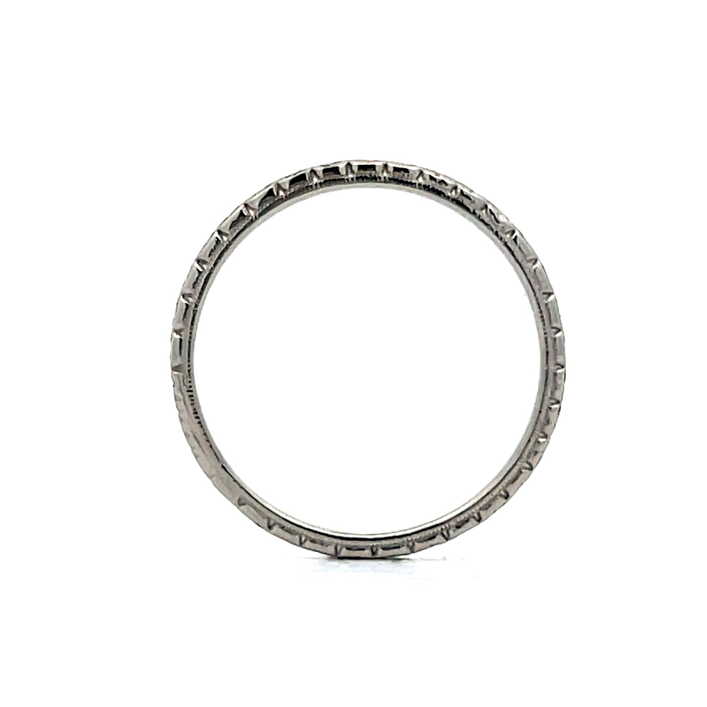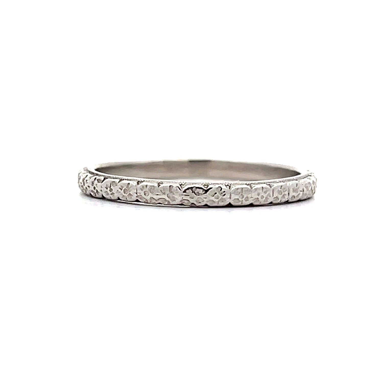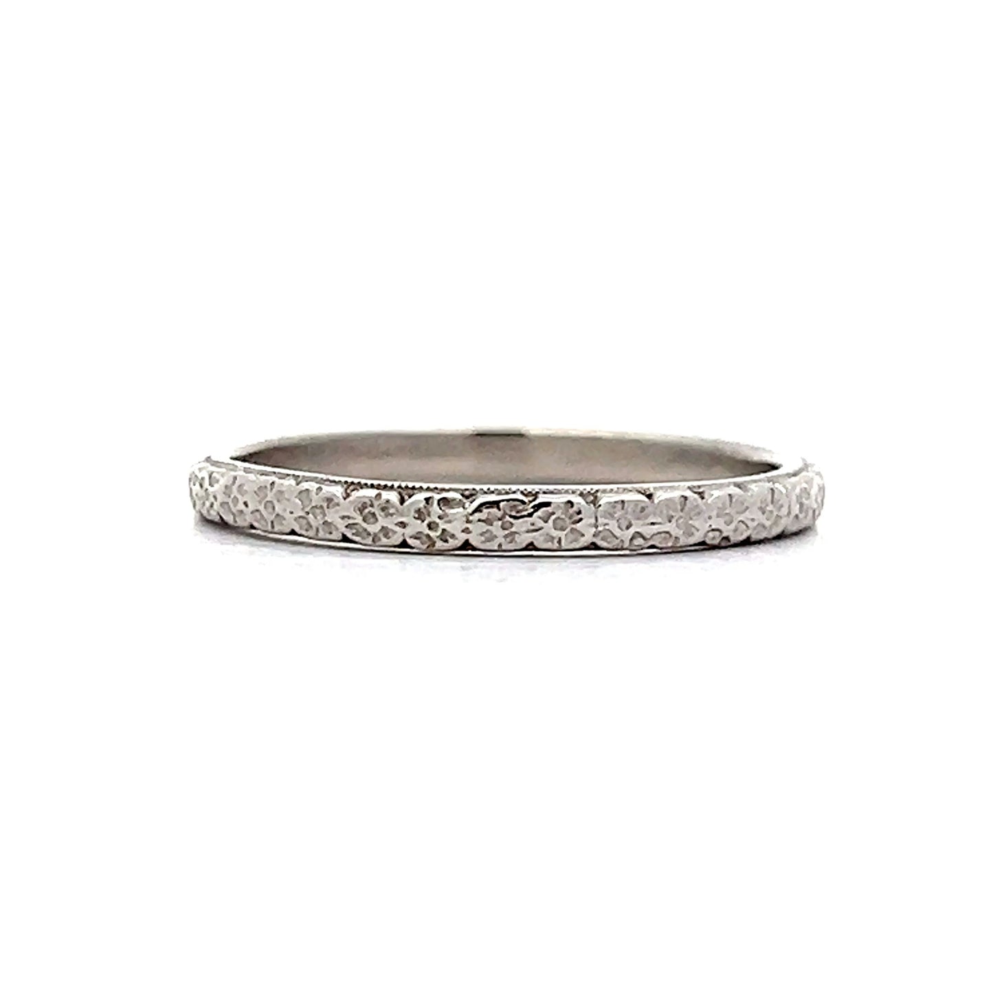 This platinum Art Deco wedding band features a 2 mm width and detailed orange blossom engraving that wraps around the entire piece. The floral design brings a subtle nod to its era, giving it character without the need for stones. With its simple yet striking look, this band makes a thoughtful choice for anyone drawn to vintage styles and meaningful details.