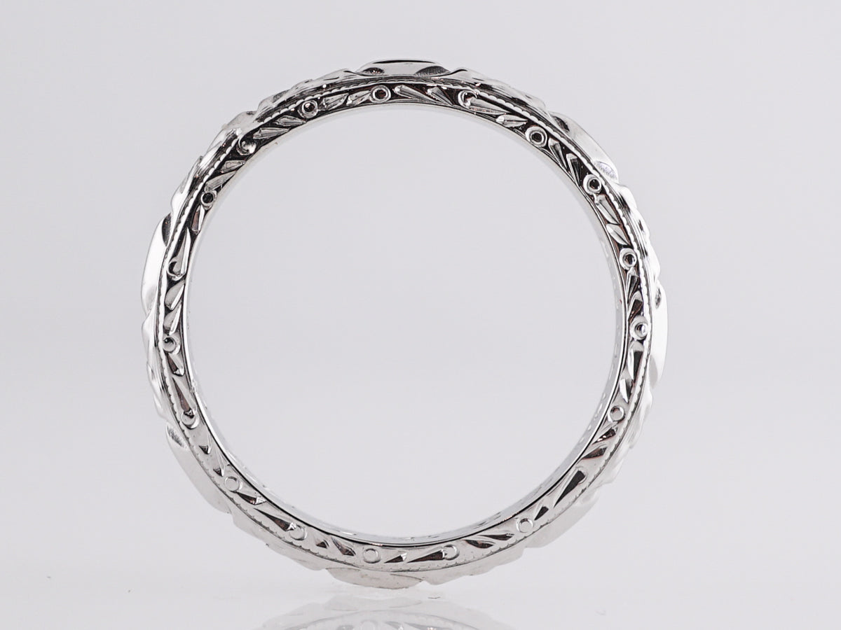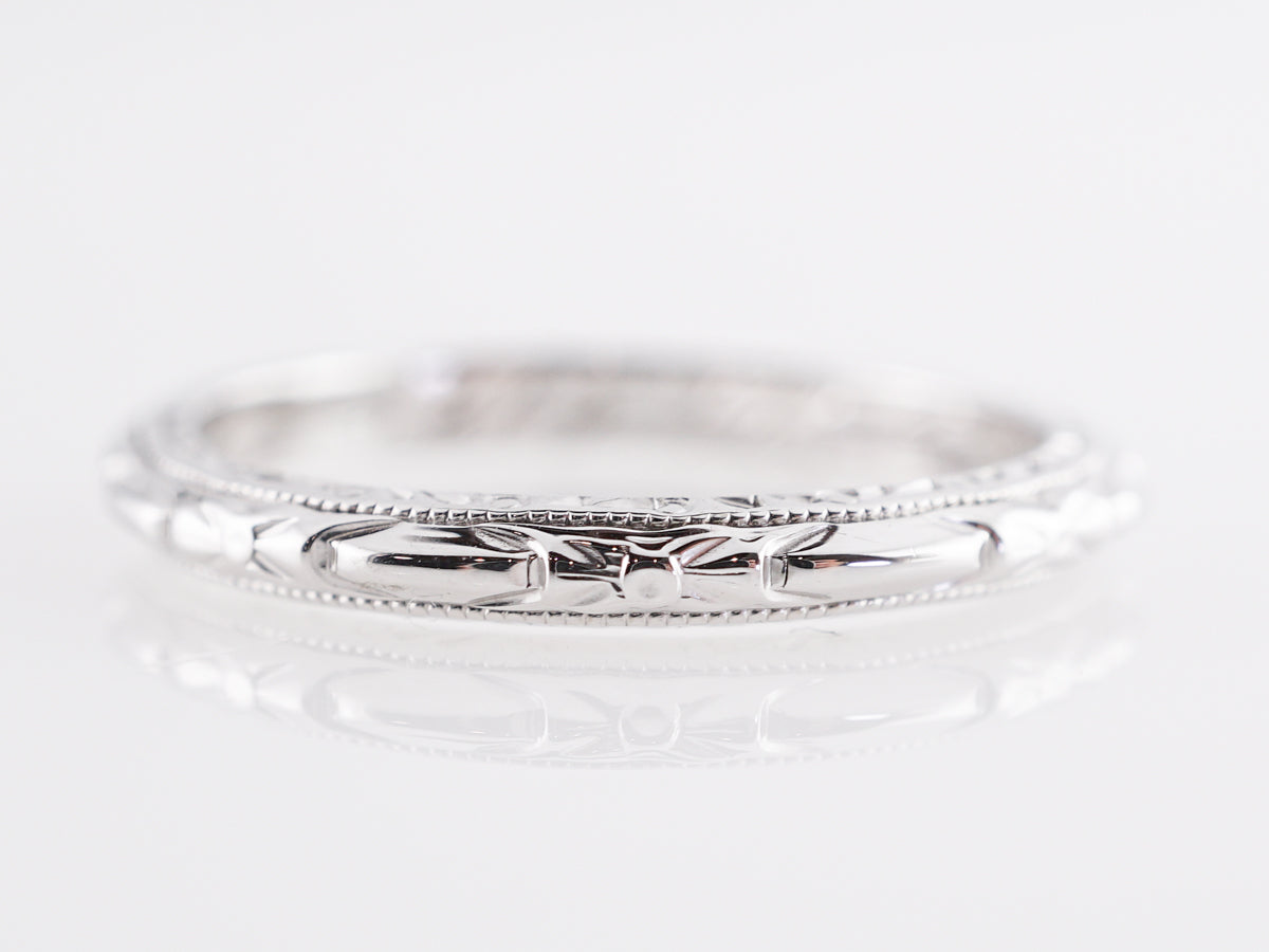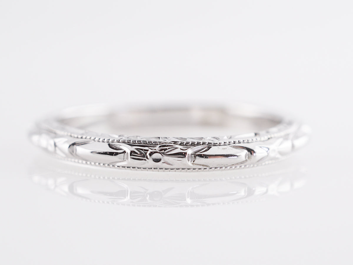 2mm Vintage Orange Blossom Wedding Band in 14k White Gold. 2mm Vintage Orange Blossom Wedding Band in 14k White Gold. This marvelous, Art Deco orange blossom wedding band features ornate engravings in shimmering 14k white gold. The ghostly textures on the front of the band resemble earthy flowers and abstract shapes. From the profile, beautiful, pinpoint embellishments garnish this ring throughout. Visually striking from every angle, this orange blossom wedding band has vintage class and meticulous metalwork, creating a one of a kind wedding ring.