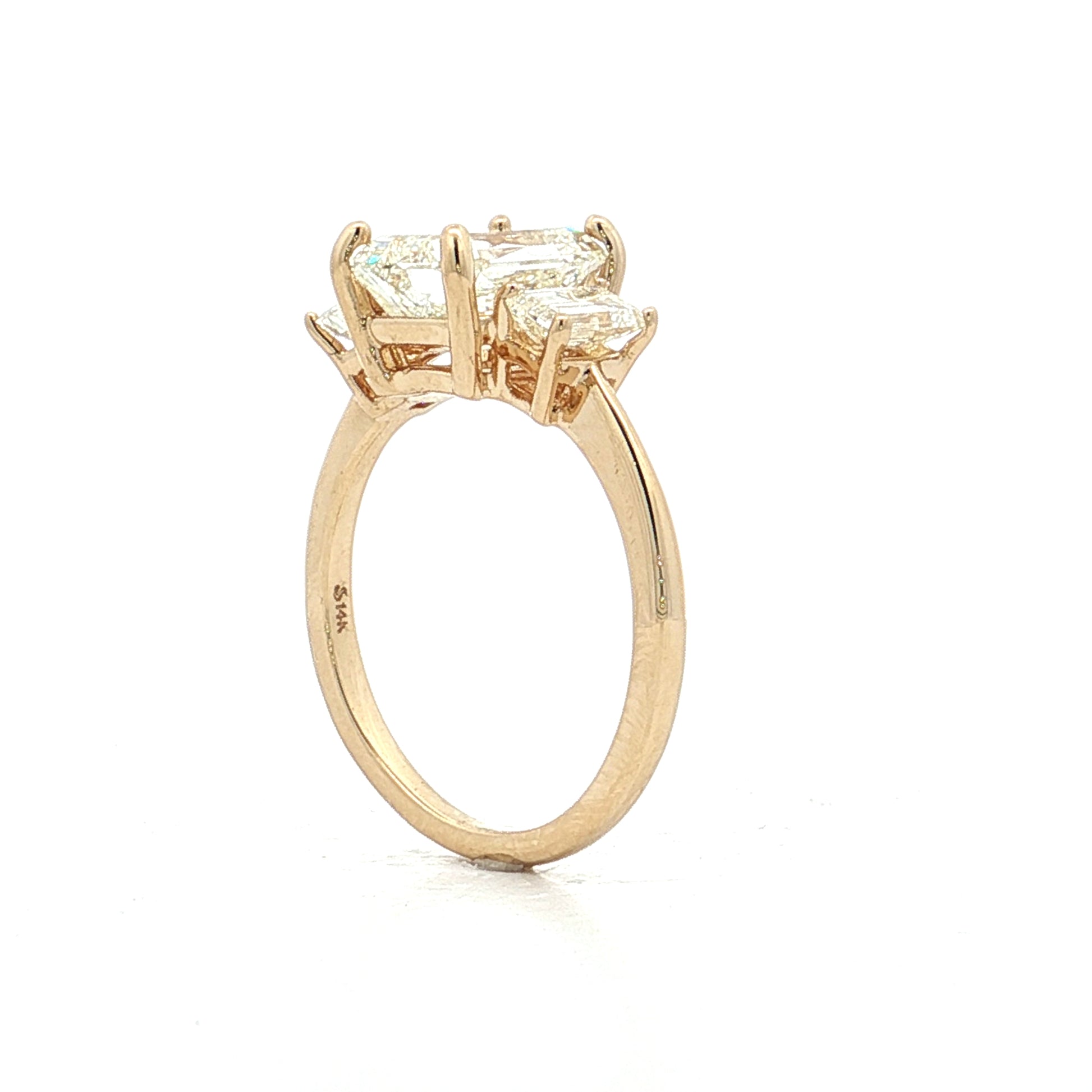 Two emerald cut diamonds weighing .375 carats each flank the center stone, their step-cut facets producing broad flashes of light that contrast with the Ashoka's sparkle. The ring is set in 14 karat yellow gold with a high-polish finish, and the total diamond weight is 3.77 carats. The substantial size of the center stone makes this a striking, eye-catching piece on the hand.