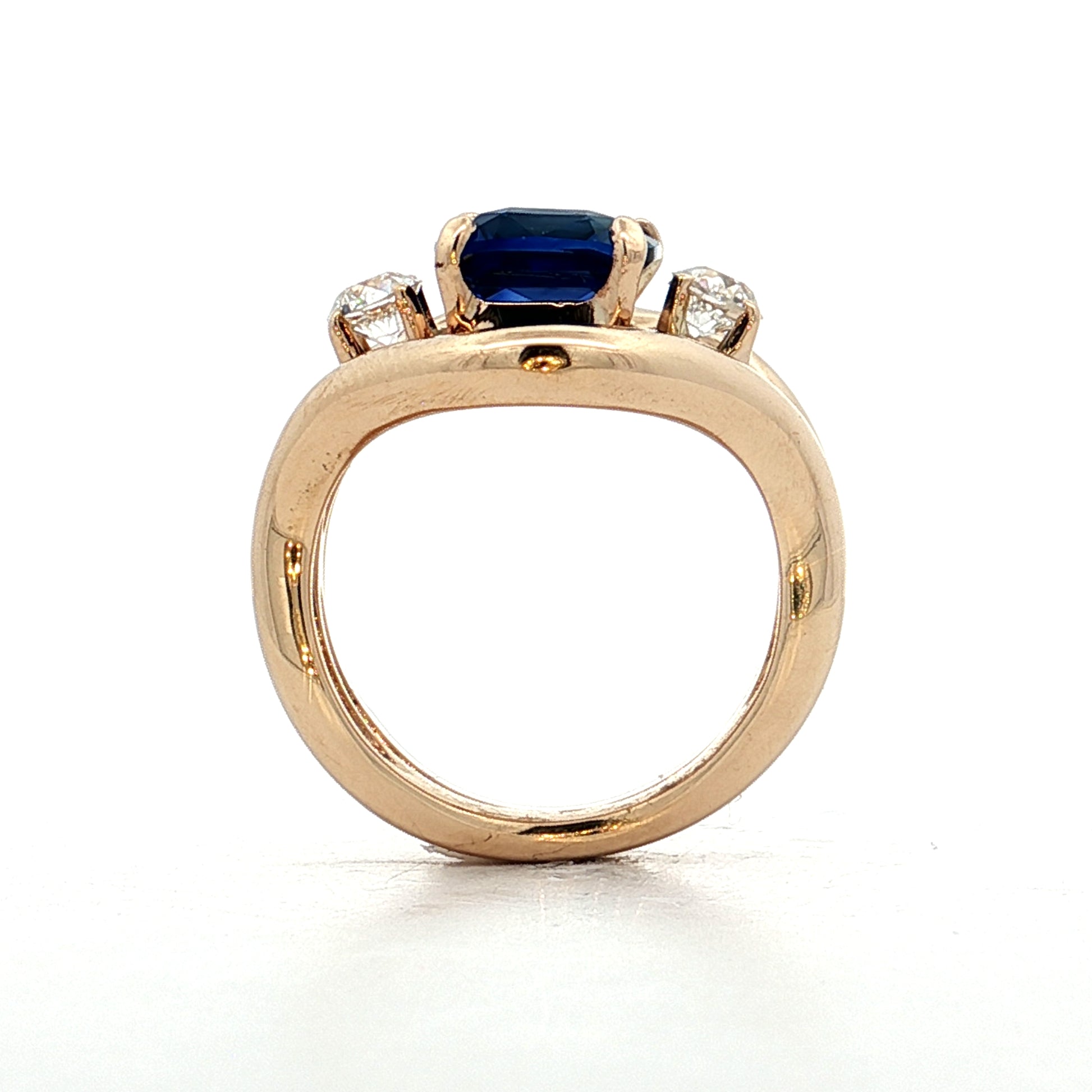 Set in 14 karat yellow gold, the ring includes contour bands that wrap around the finger to follow its natural curve, creating a secure and comfortable fit. The yellow gold warms the overall look and provides strong contrast against the sapphire's oceanic blue. At just over three carats, the sapphire delivers substantial presence while the diamond accents add bright punctuation on either side.