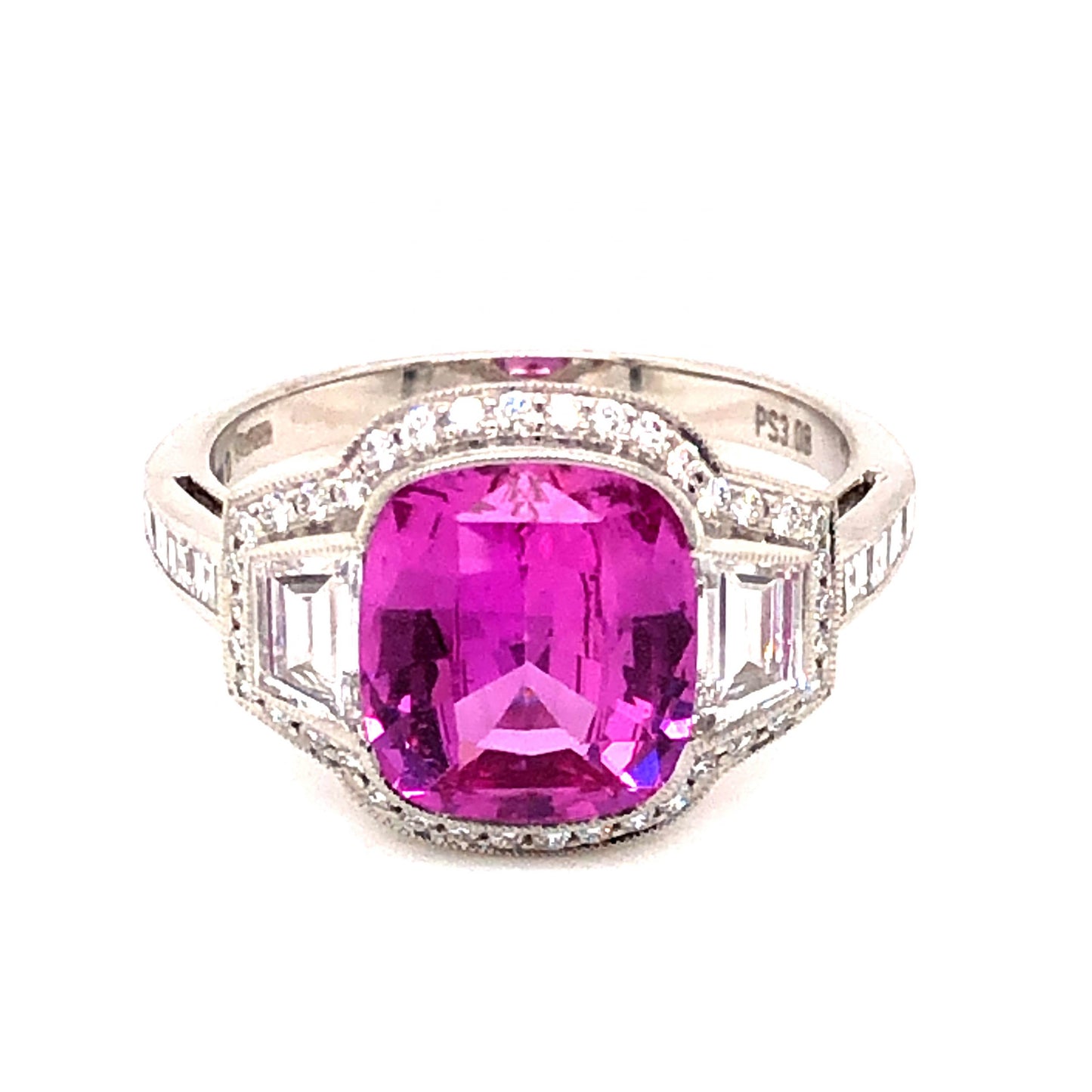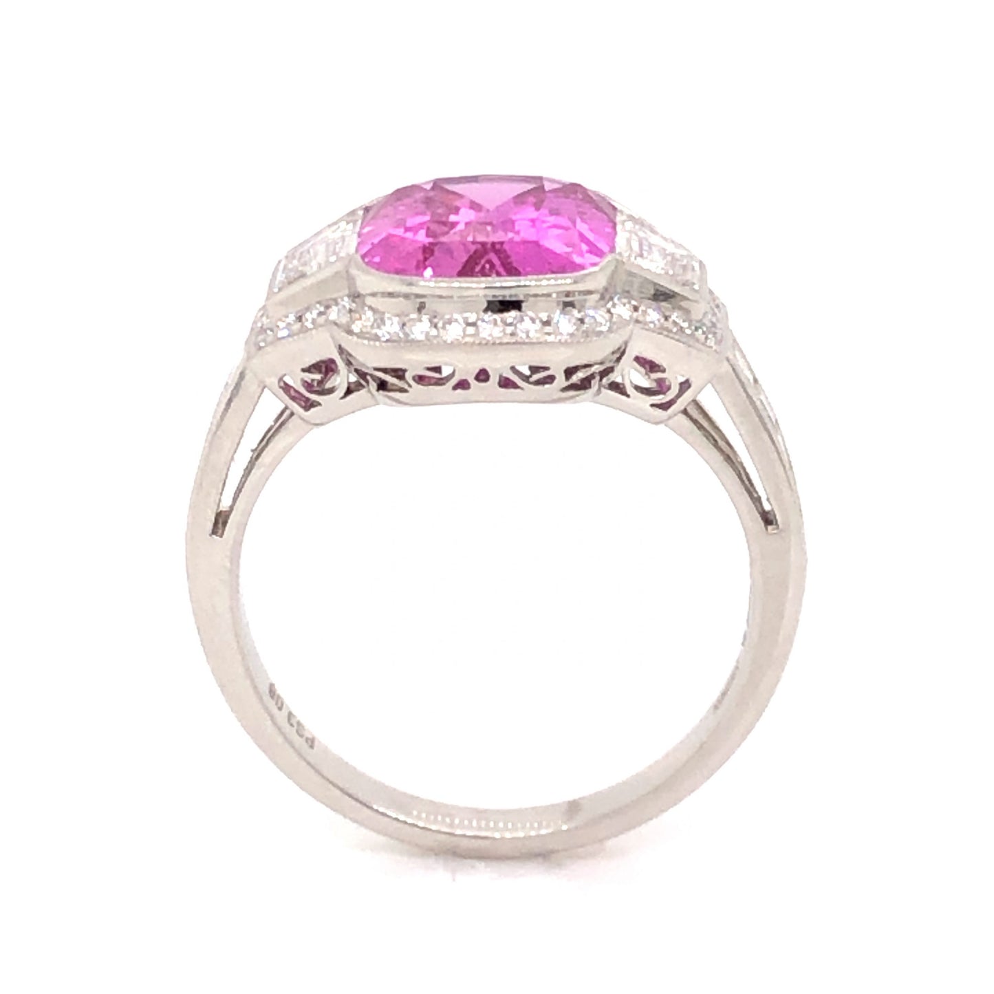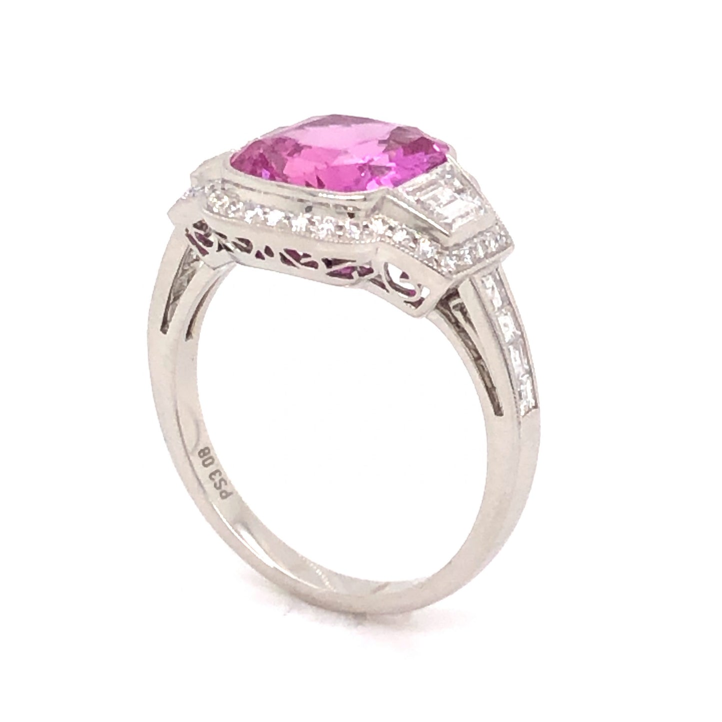 3.08 Pink Sapphire Diamond Engagement Ring in Platinum. This dazzling modern engagement ring features a 3.08 carat pink sapphire and .92 carats of diamonds finished in platinum. The center sapphire has a rich, highly saturated magenta hue. The pink sapphire is cushion cut, a classic cut that complements the size of the stone. The sapphire is flanked by two (2) .175 carat diamonds. The primary sapphire and diamonds are bezel set and accented by thirty-seven (37) .012 carat diamonds that wreath the center stones. On the shoulders of the band, eight (8) .015 carat diamonds are set in channels. From the profile, a modern filigree gallery supports the brilliant diamonds and pink sapphire. Finished on a polished platinum band, this ring has an elegant style and can be worn as an engagement ring or cocktail ring!