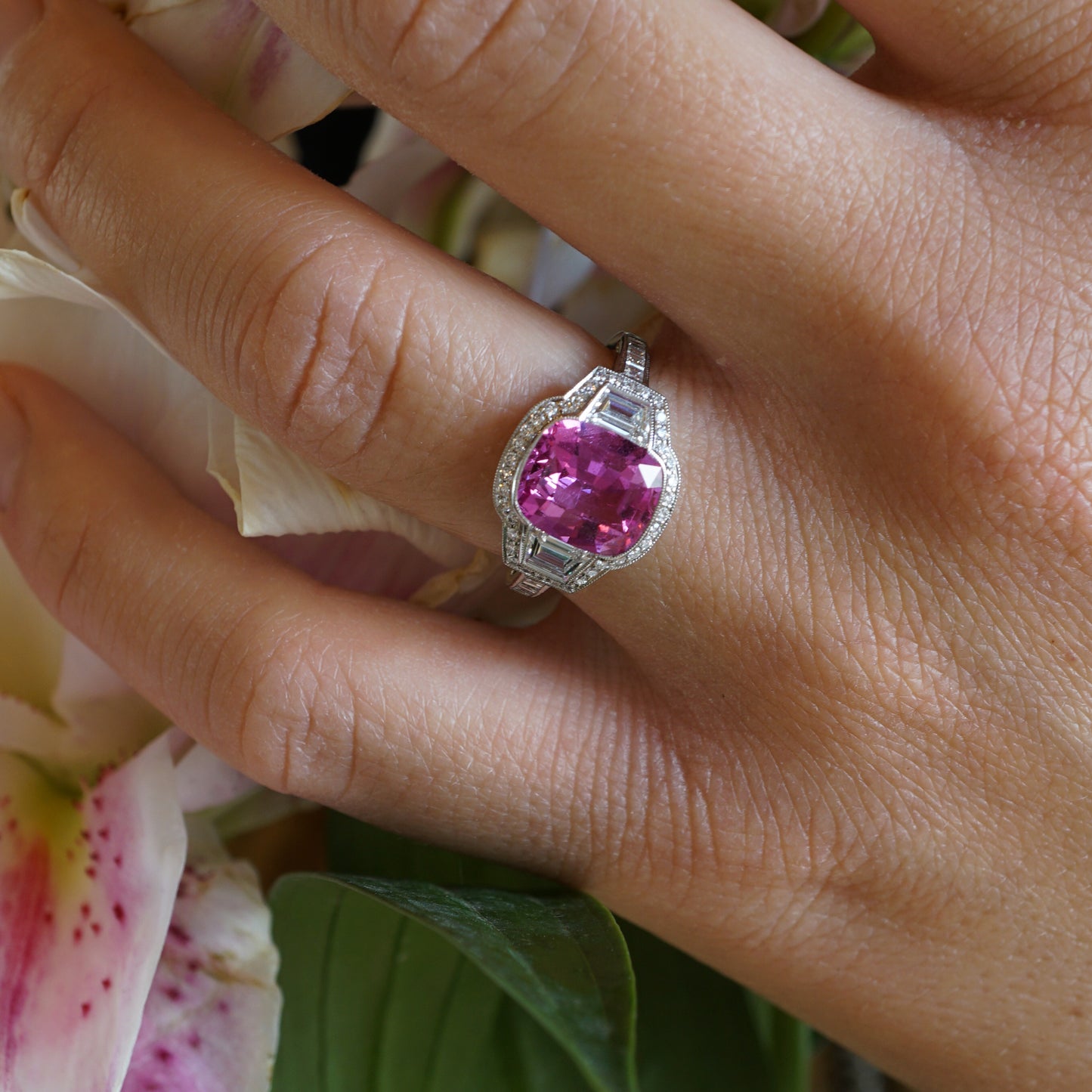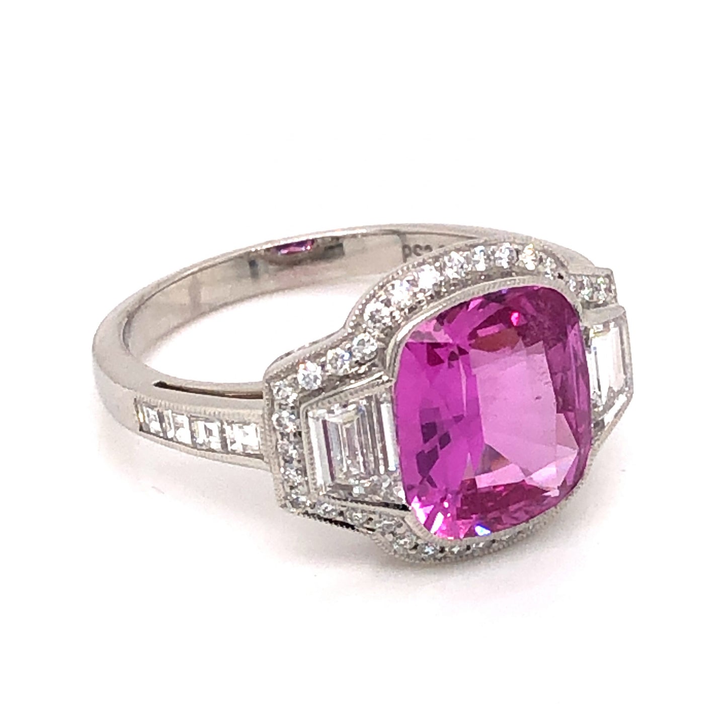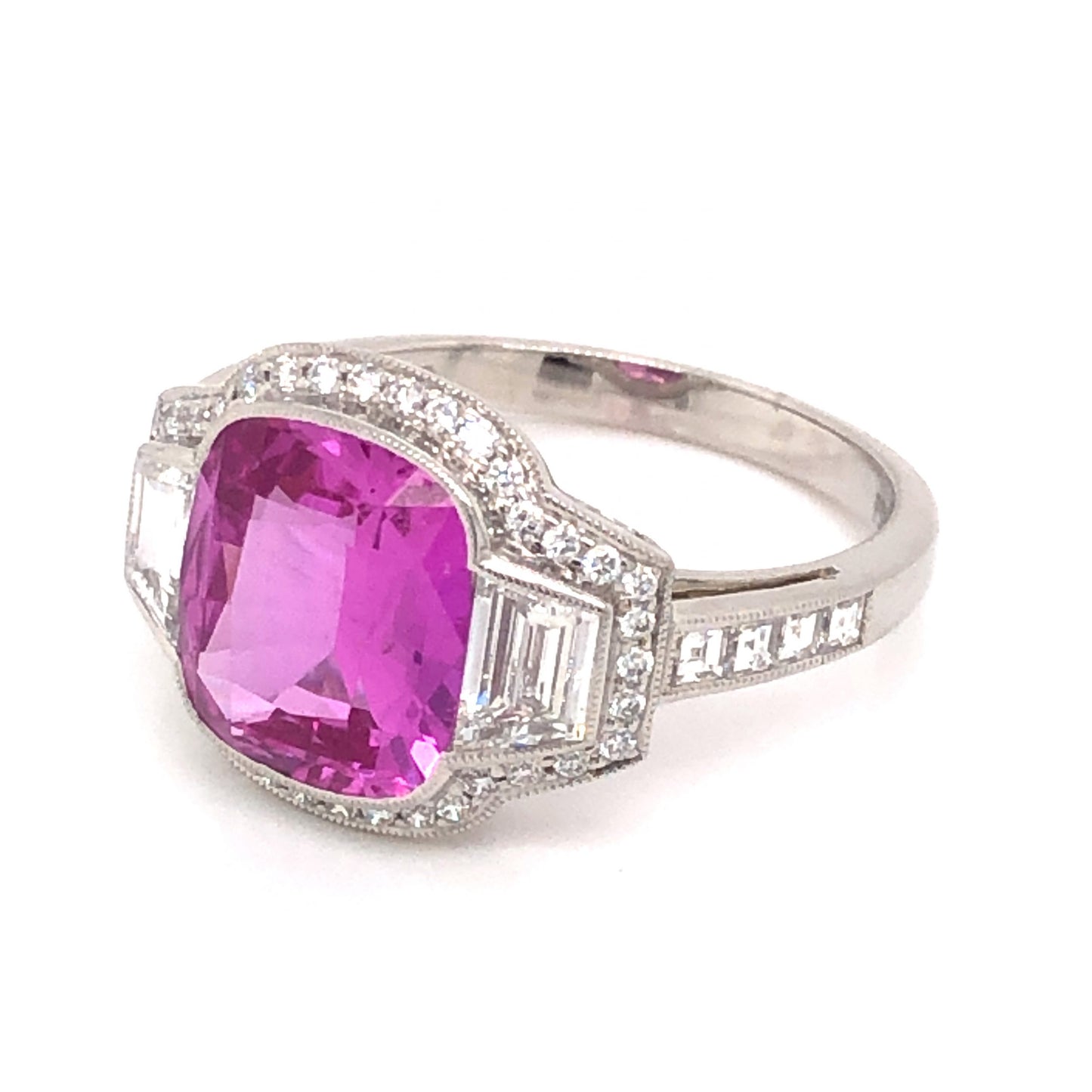 3.08 Pink Sapphire Diamond Engagement Ring in Platinum. This dazzling modern engagement ring features a 3.08 carat pink sapphire and .92 carats of diamonds finished in platinum. The center sapphire has a rich, highly saturated magenta hue. The pink sapphire is cushion cut, a classic cut that complements the size of the stone. The sapphire is flanked by two (2) .175 carat diamonds. The primary sapphire and diamonds are bezel set and accented by thirty-seven (37) .012 carat diamonds that wreath the center stones. On the shoulders of the band, eight (8) .015 carat diamonds are set in channels. From the profile, a modern filigree gallery supports the brilliant diamonds and pink sapphire. Finished on a polished platinum band, this ring has an elegant style and can be worn as an engagement ring or cocktail ring!