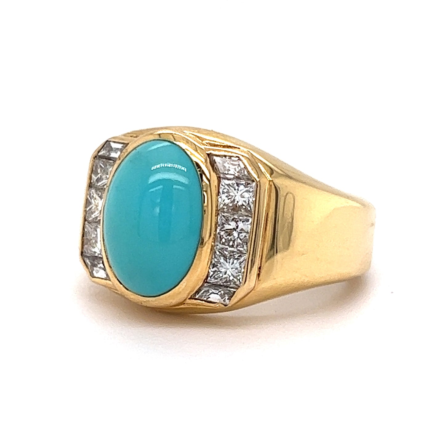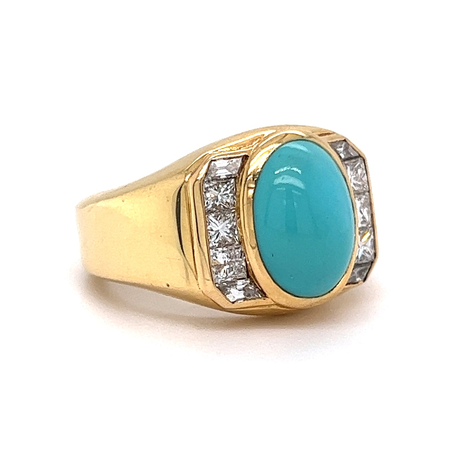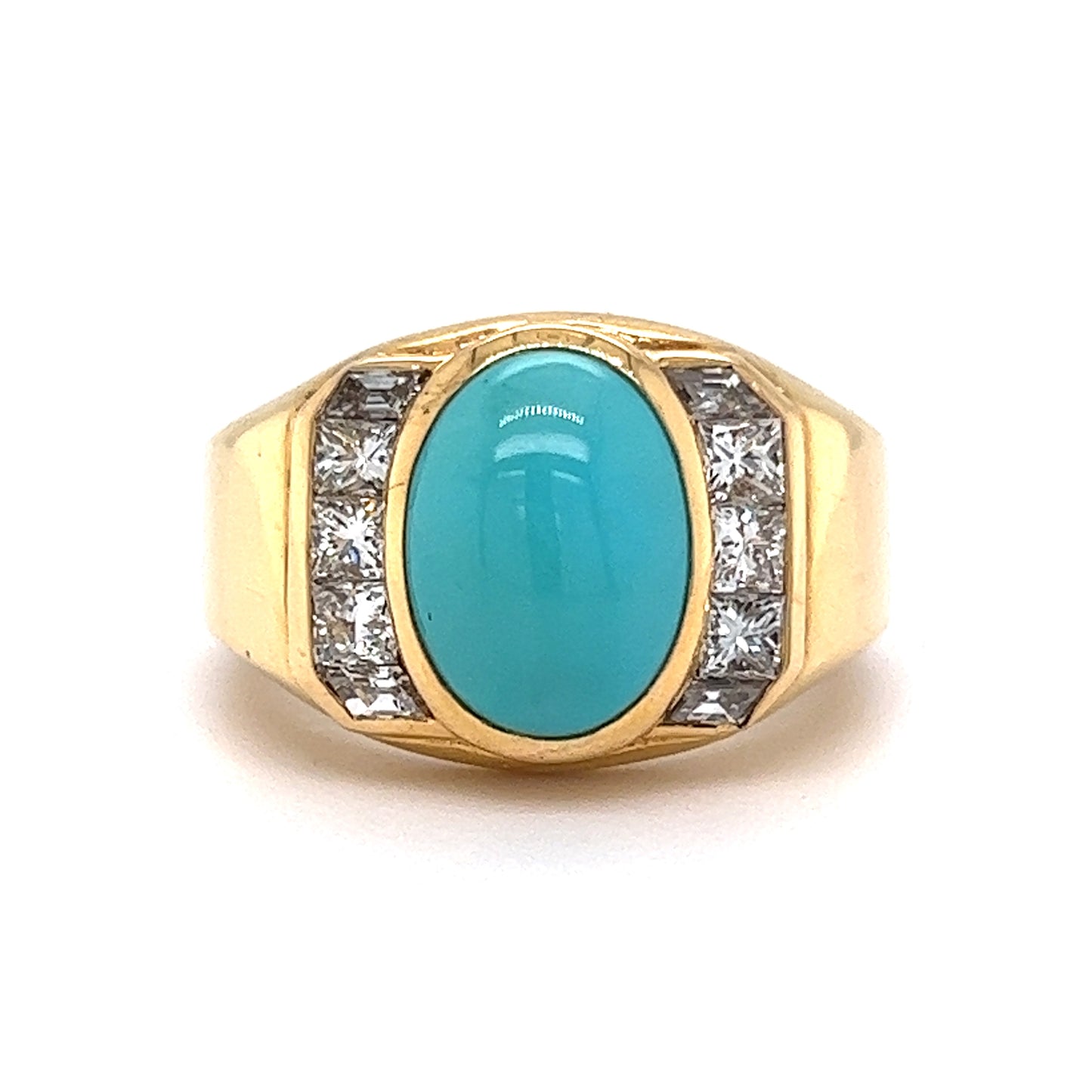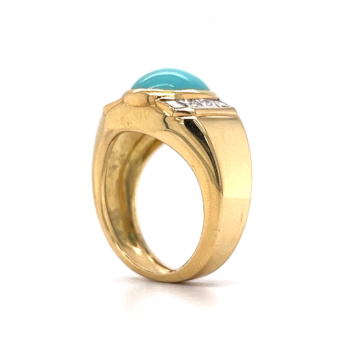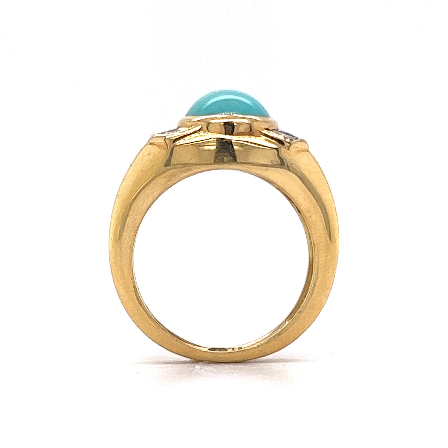 Set in 18 karat yellow gold, this cocktail ring features a 3.25 carat cabochon cut turquoise as its center stone. Six (6) natural diamonds with G/H color and VS1-VS2 clarity, each measuring 2.75 x 2.75 mm, weighing a total of 0.78 carats, add a touch of sparkle. The combination of turquoise and diamonds makes for a stunning and unique accent to any look. Whether you're going for a bold statement or a subtle everyday sparkle, this piece is perfect for any occasion!