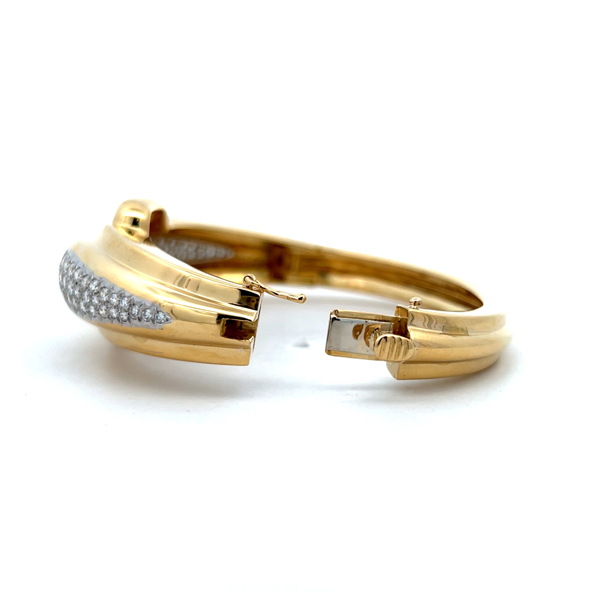This statement cuff bracelet combines 18 karat yellow and white gold with 3.40 carats of round brilliant cut diamond at its center. The main diamond shows off G color grade and VS1-VS2 clarity, surrounded by pave diamonds that add extra brightness to the piece. The bracelet weighs 73 grams and features an interesting buckle detail in the design, with a secure locking clasp that fits a 6.25 inch wrist. The mix of two gold tones creates a rich contrast that makes this substantial piece a stand out.