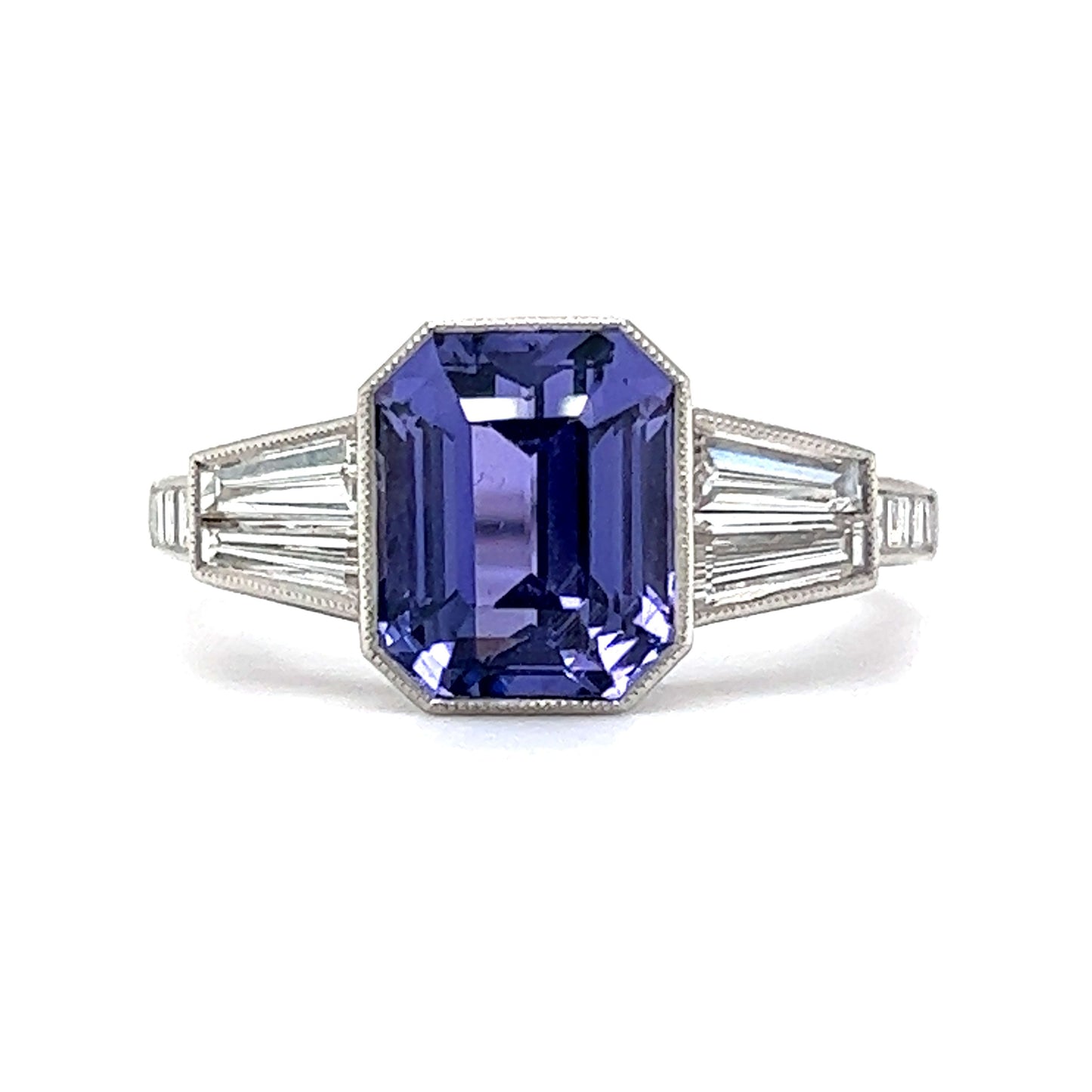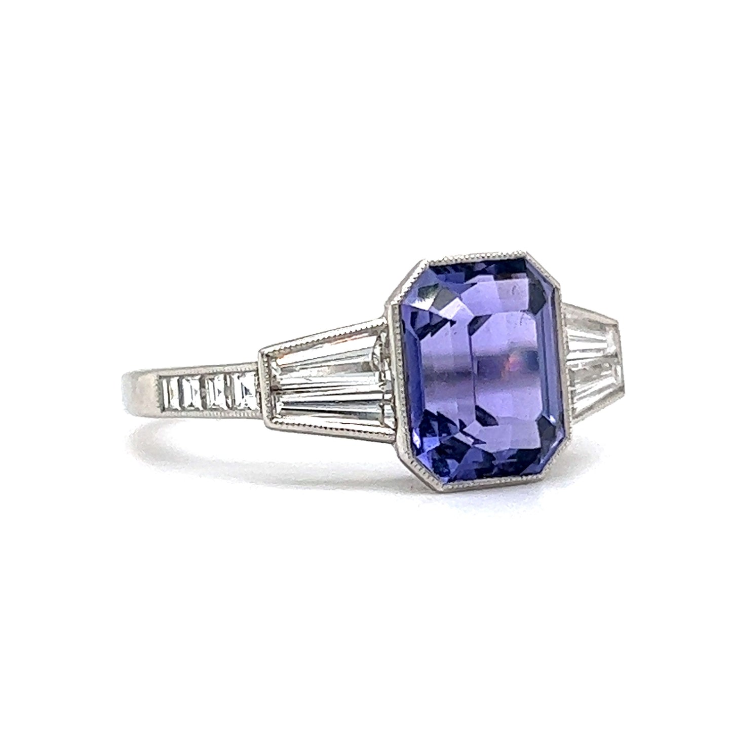 A rare and marvelous beauty! This one of a kind sapphire engagement ring features a 3.46 carat purple sapphire and diamond accents in platinum. The center sapphire reflects a deep periwinkle-cornflower hue. Set in a decorative and secure milgrain bezel. Four (4) baguette cut accent diamonds flank the center stone, adding a dimensional sparkle to the pastel purple gemstone. Shimmering & chic. Additional accent diamonds extend onto the band. Crafted in stylish and durable platinum. Modern elegance and the birthstone of September. A side stone engagement ring to remember.