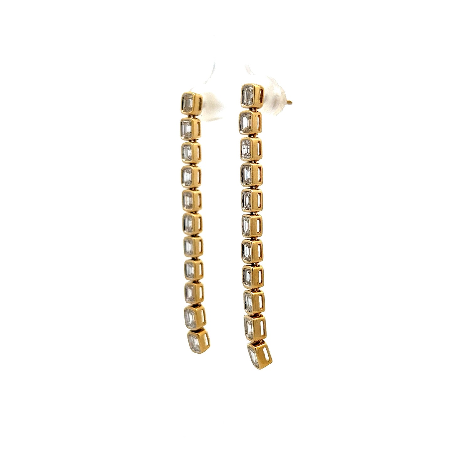 Elevate your look with these modern drop earrings in 18 karat yellow gold. The emerald cut diamonds, with a total weight of 3.50 carats, are bezel set giving a sleek and contemporary feel.  Finished in 18k yellow gold, these simple earrings can be dressed up or down and are lightweight and comfortable.