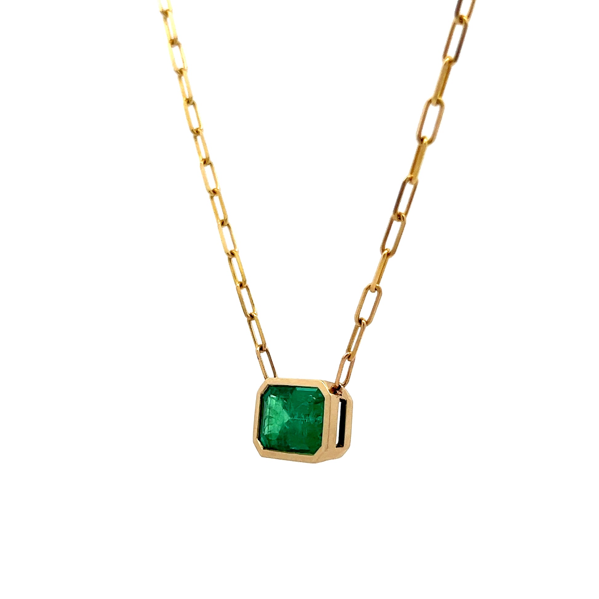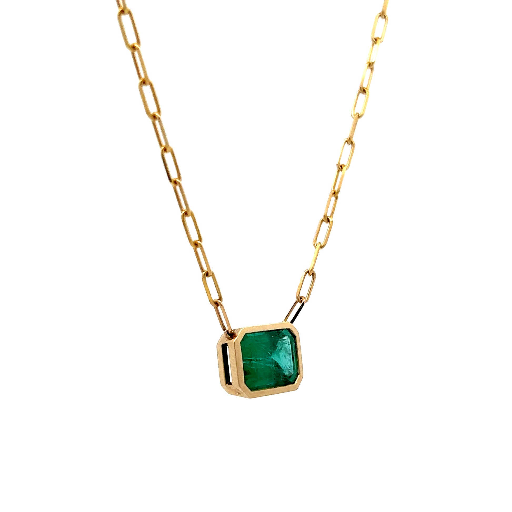 This pendant necklace features a 3.51 carat emerald cut emerald set in 14 karat yellow gold with a bezel setting. The emerald is positioned in an east/west orientation, meaning it's placed horizontally rather than the typical vertical arrangement. The pendant hangs from a paperclip link chain that measures 18 inches in length, with links shaped like elongated paperclips connected in a row. The green color of the emerald creates a vivid contrast against the yellow gold metal of the setting and chain.