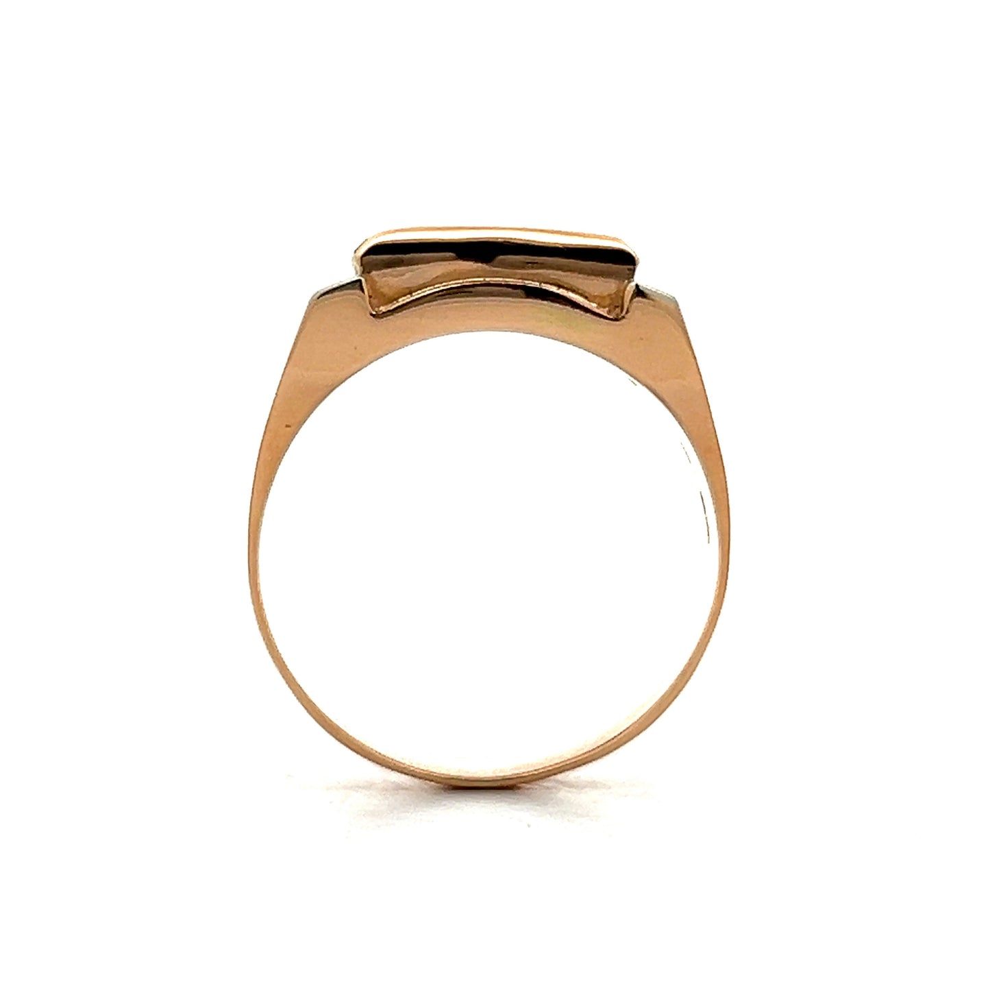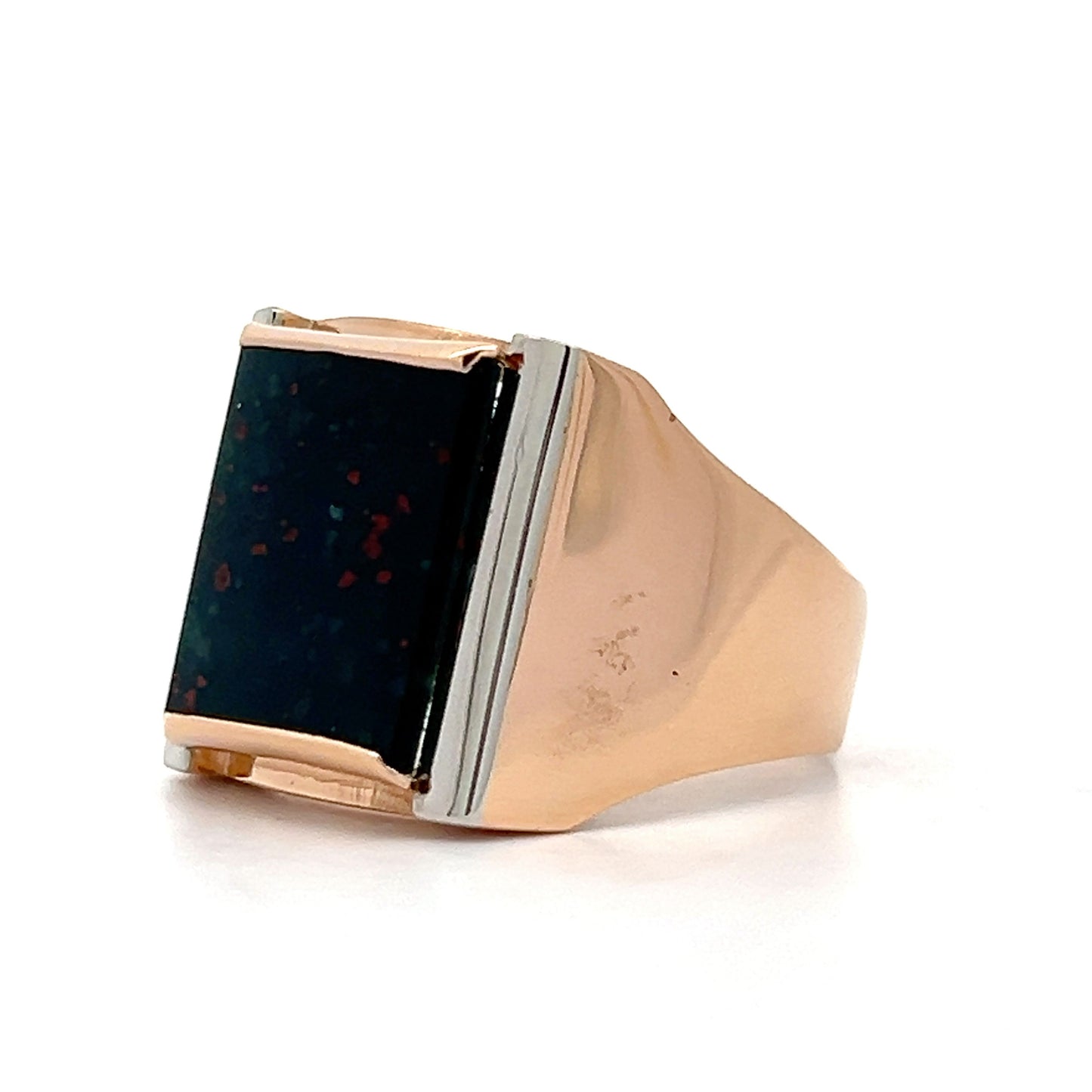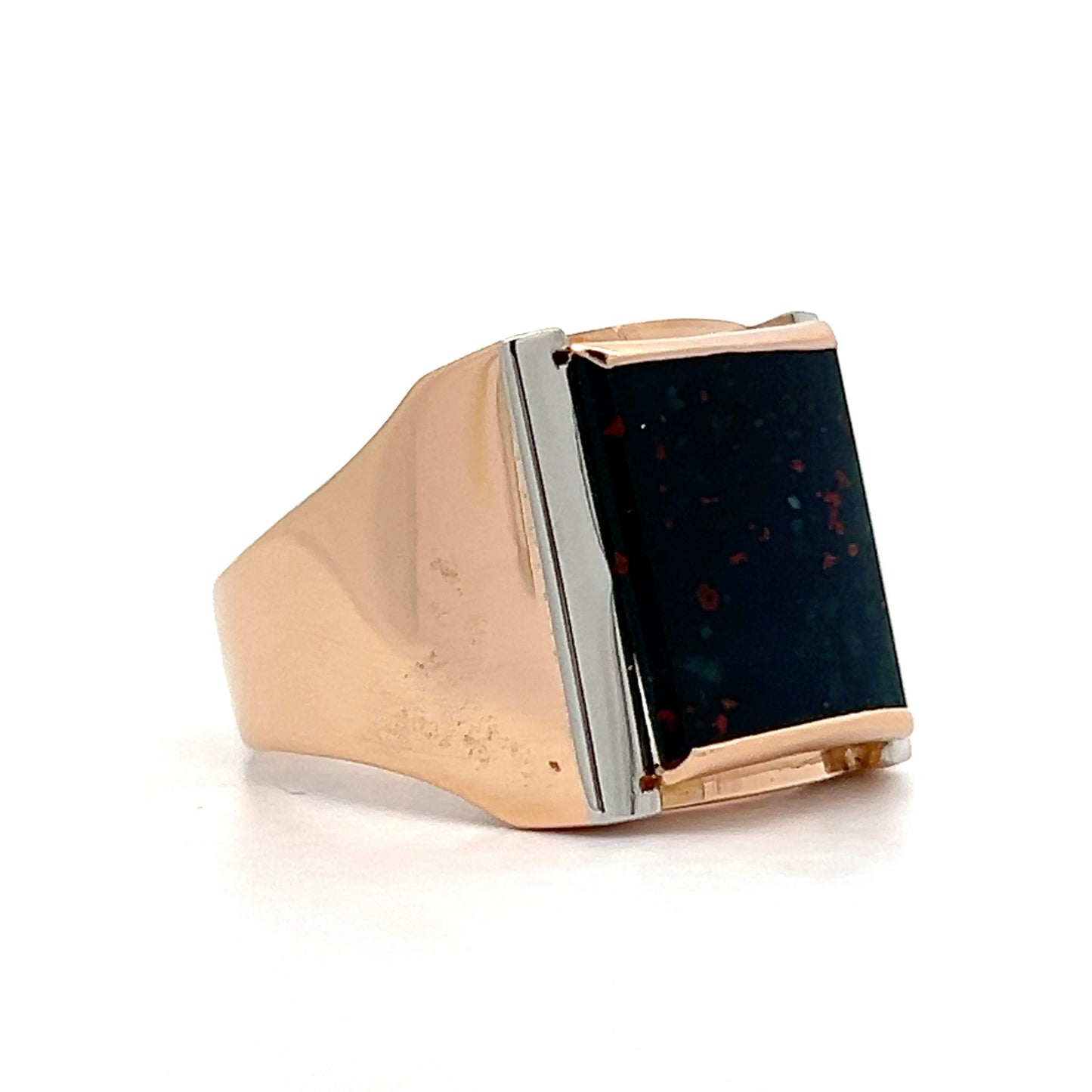 This mid-century men's cocktail ring features a sophisticated two-tone design in 18 karat rose gold and 18 karat white gold. The centerpiece is a 3.52 carat cabochon-cut bloodstone, known for its rich, dark hues and unique texture. The polished rose gold band, accented by white gold edges, creates a striking contrast, adding to the ring's bold and refined aesthetic. Ideal for those who appreciate mid-century design and craftsmanship, this ring is a distinctive option.