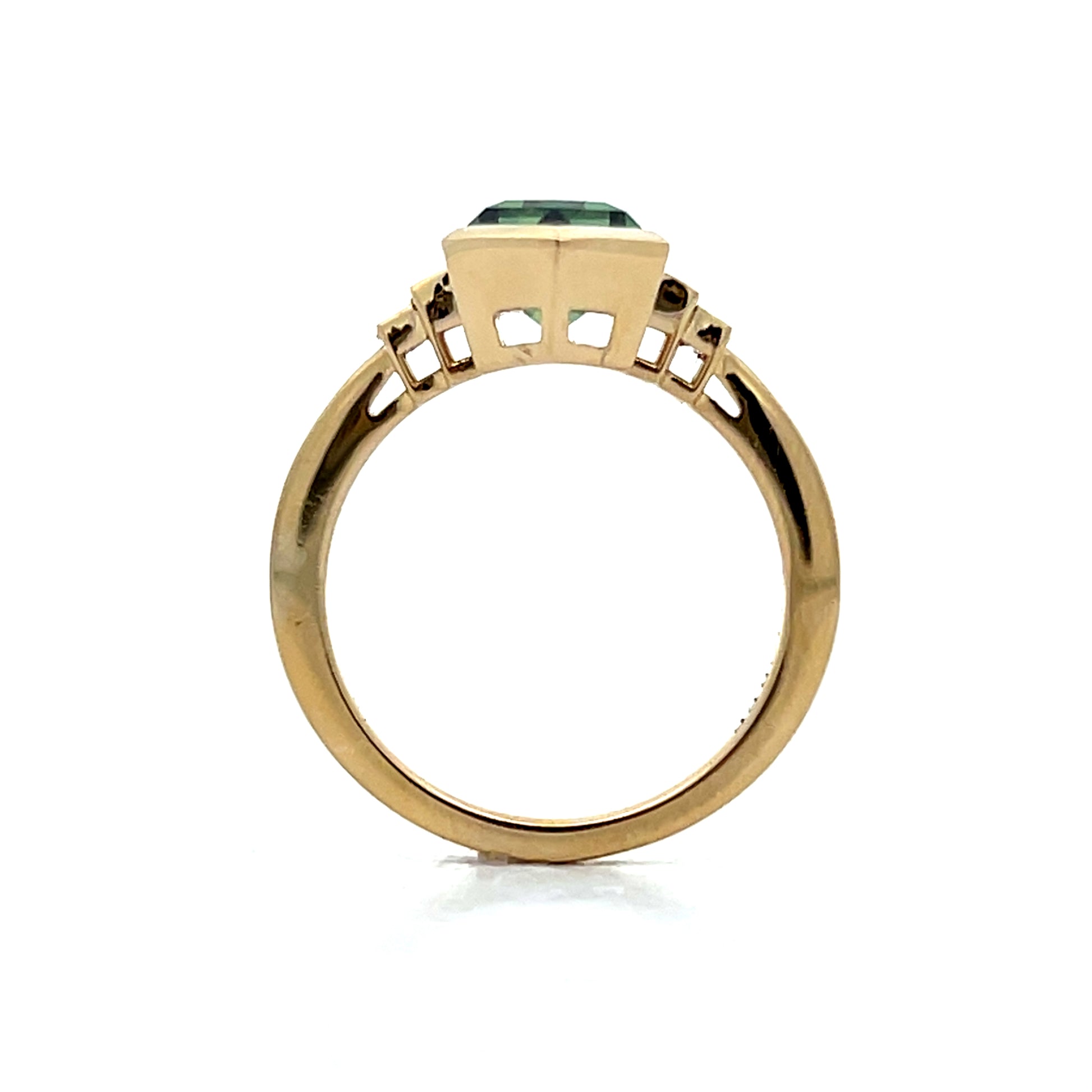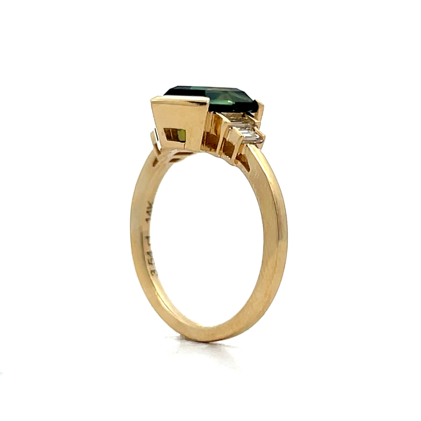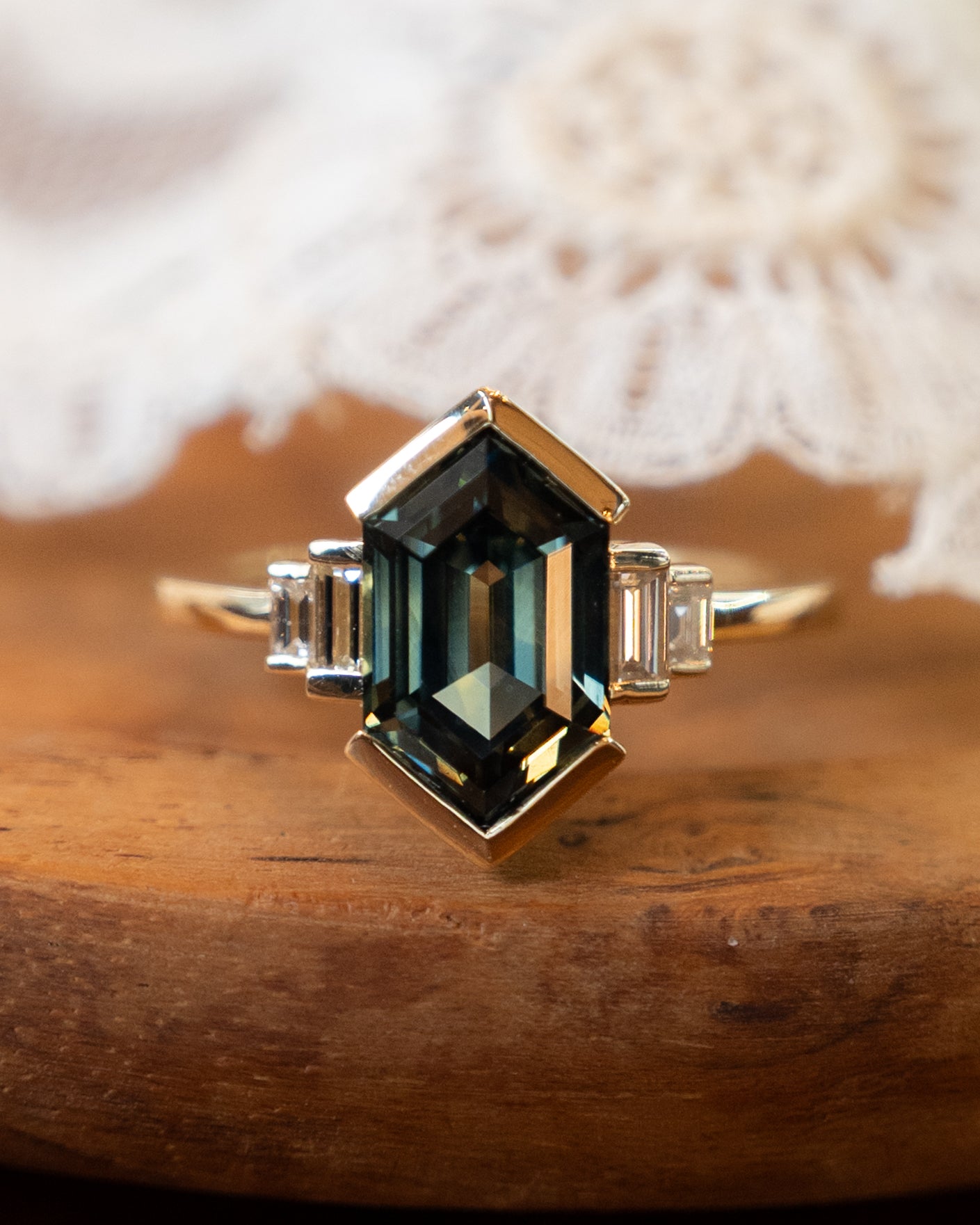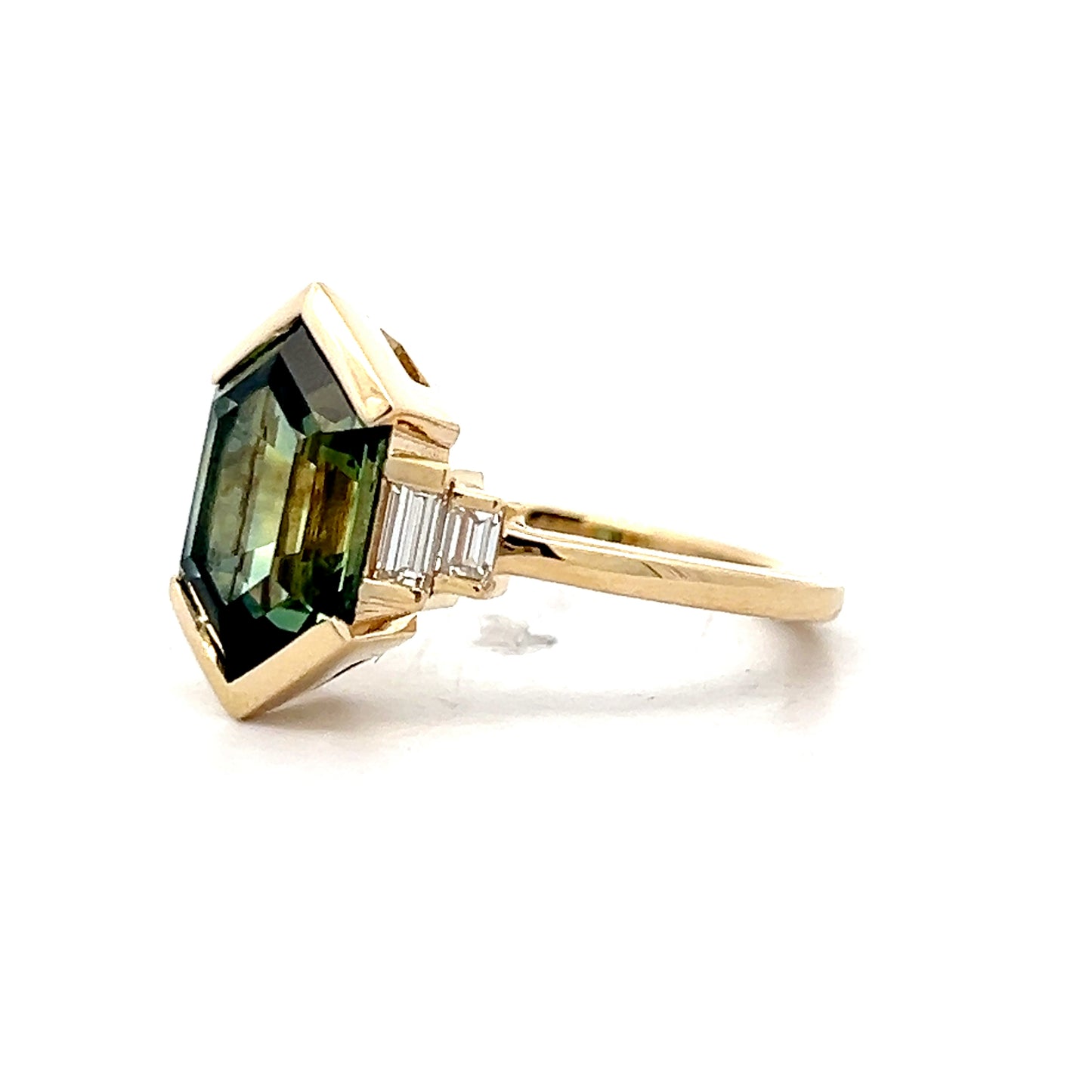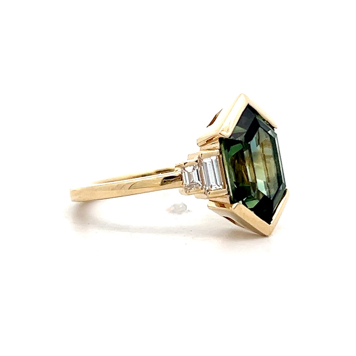 This modern engagement ring features a 3.54 carat hexagon cut blue-green sapphire (GIA certified no-heat, #1226510222) set in a half bezel of 14 karat yellow gold with a flat edge band. Two baguette cut diamonds (totaling .20 carats, H color, VS2 clarity) flank the center stone, creating balance while emphasizing the unusual geometric sapphire. The combination of colored gemstone with clear diamonds creates eye-catching contrast, while the yellow gold adds warmth that complements the unique blue-green hue of the sapphire.