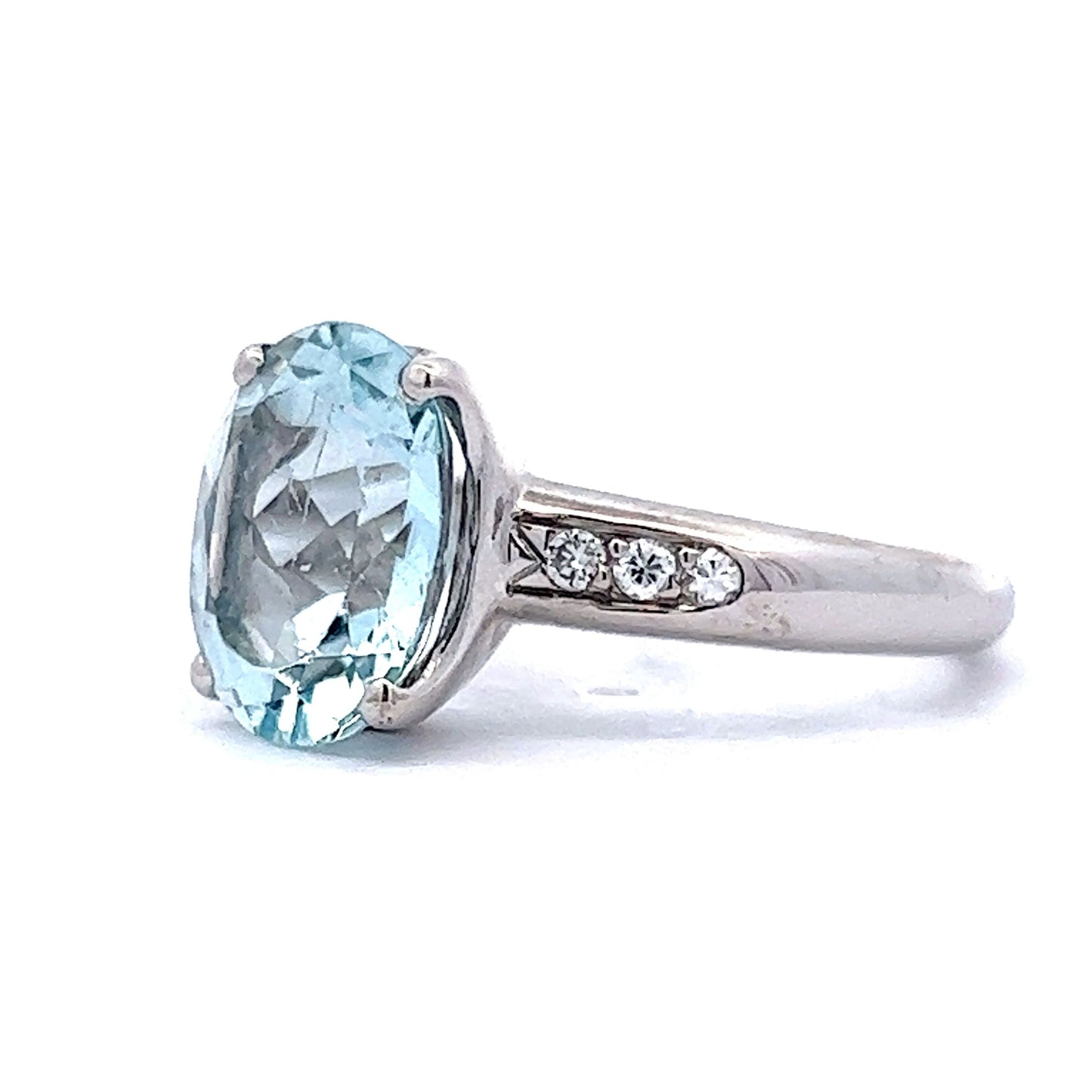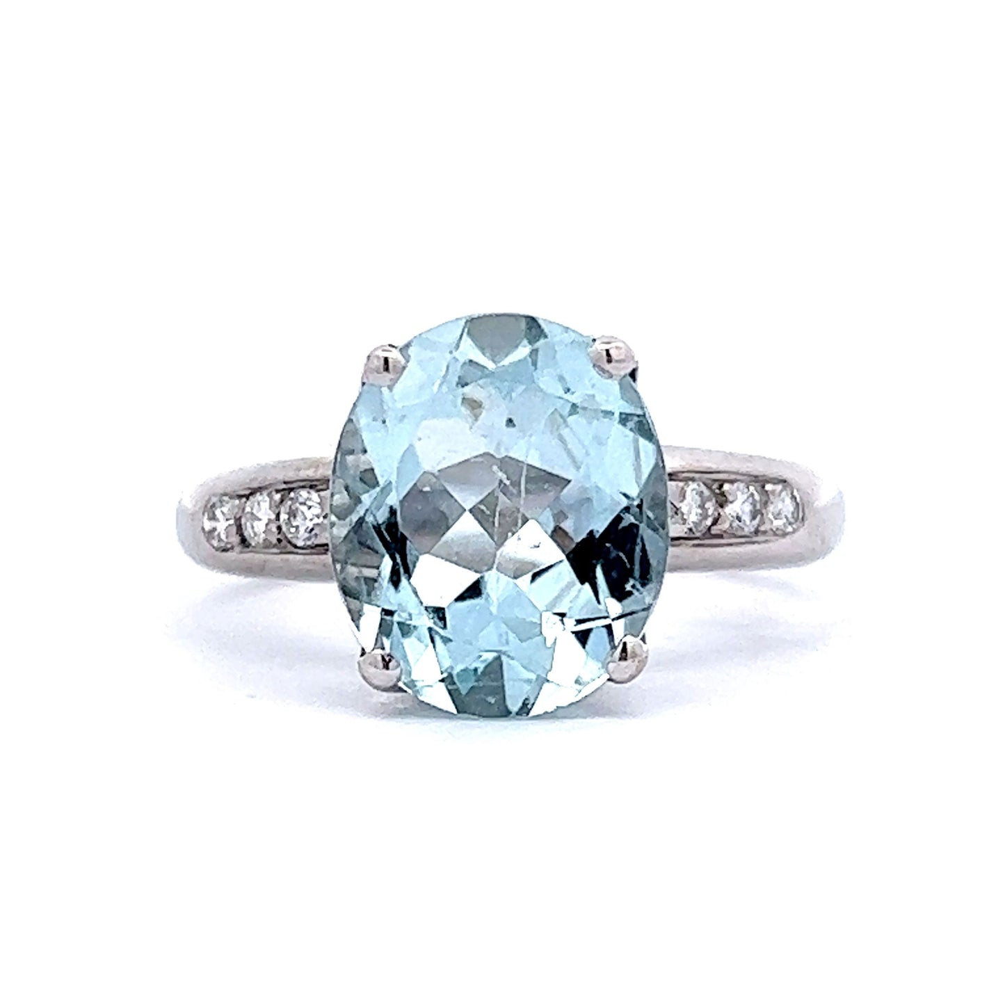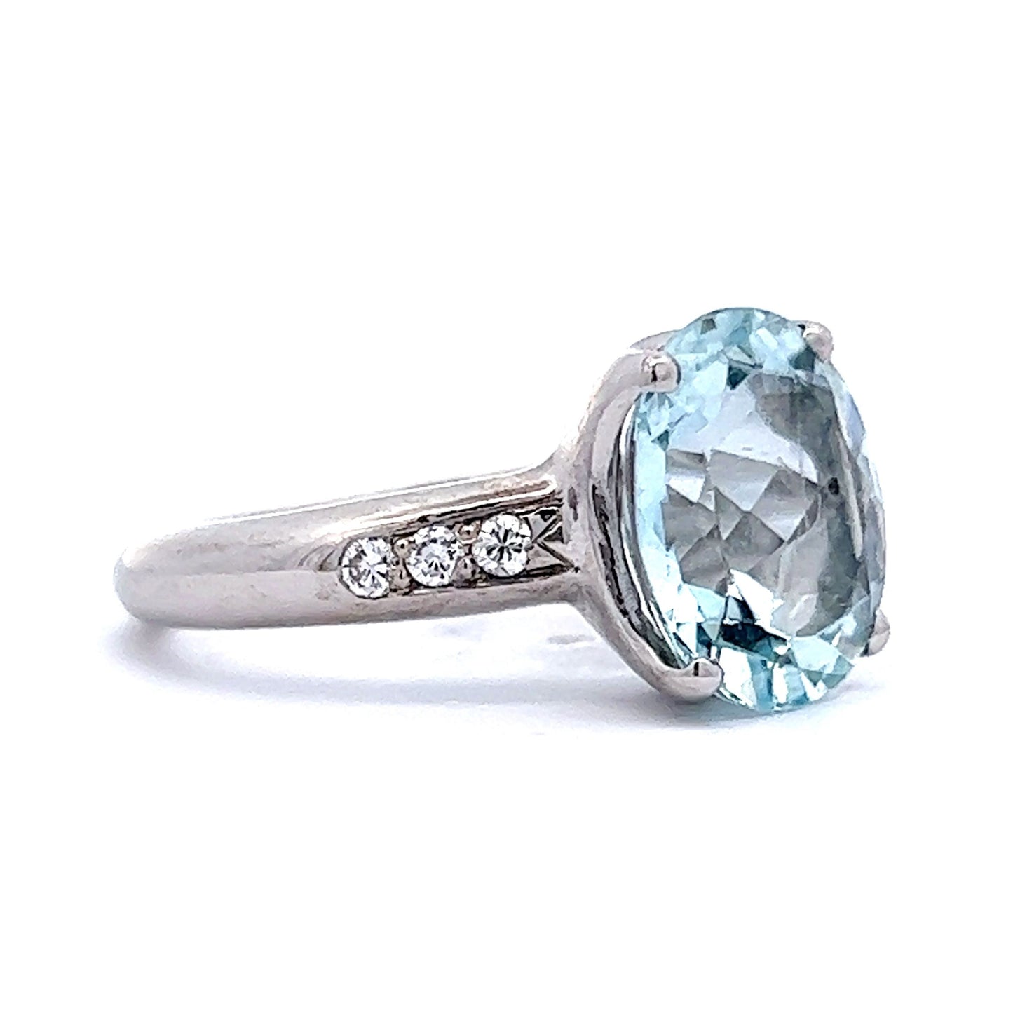This modern cocktail ring is fit for a queen! Crafted in 18 karat white gold, the ring features an impressive 3.56 carat oval cut aquamarine. The aquamarine reflects a lightly saturated sky blue hue. Six (6) diamonds decorate the shoulders of the band. Each diamond is precisely set in a channel and weighs an estimated .018 carats. A versatile piece that can be worn as a cocktail ring or alternatively as an engagement ring.