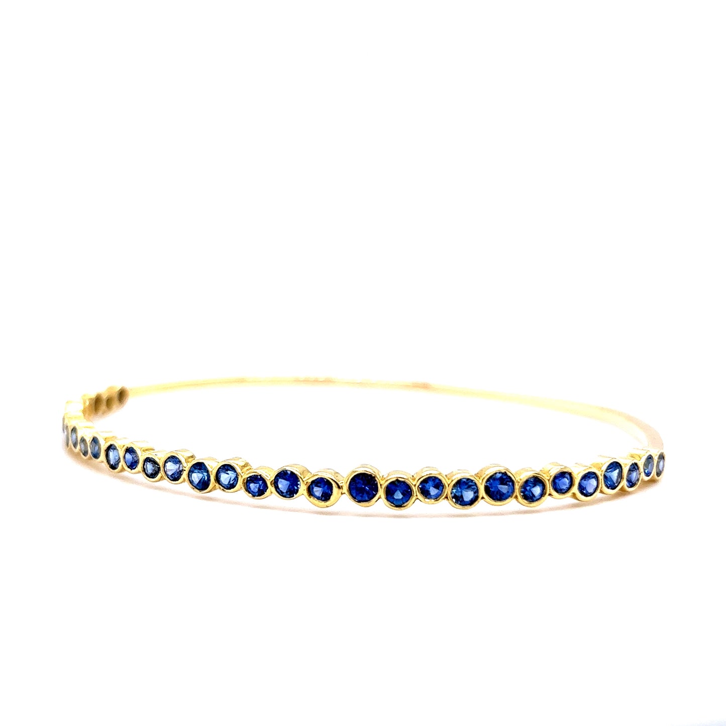 Round Cut Sapphire Bangle Bracelet in 18K Yellow Gold. Thirty-two (32) .11 carat Cobalt blue sapphires are set in tiered bezels on the front half of the bracelet. Each unique bezel features a softly hammered look, finished on a polished bangle bracelet. Whether you’re on the search for a gorgeous gift or need an accessory for yourself, this sapphire gold bracelet has timeless style and personality!
