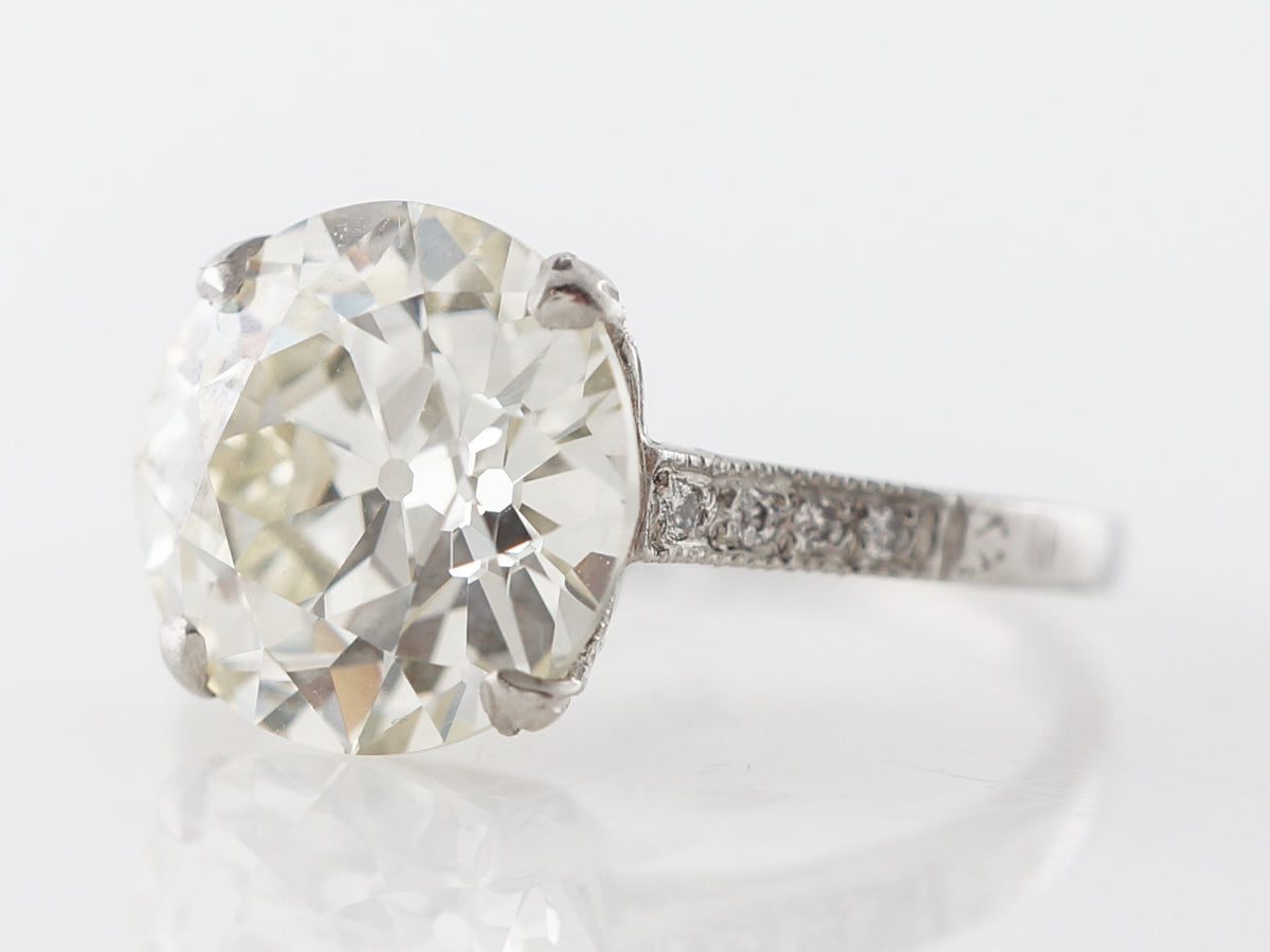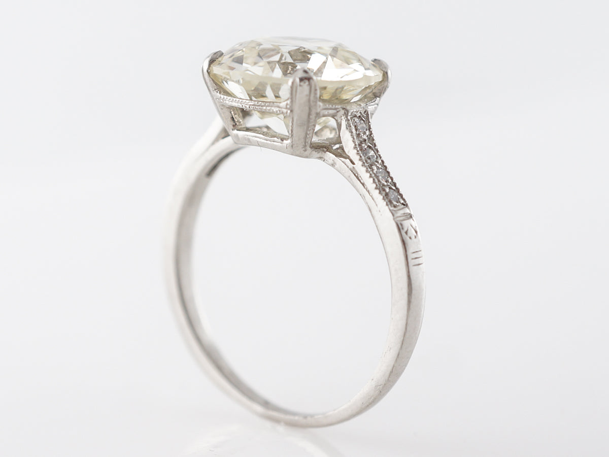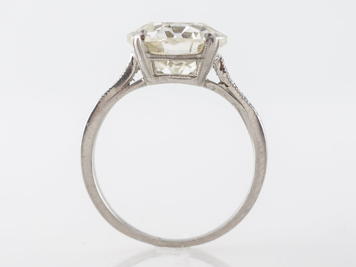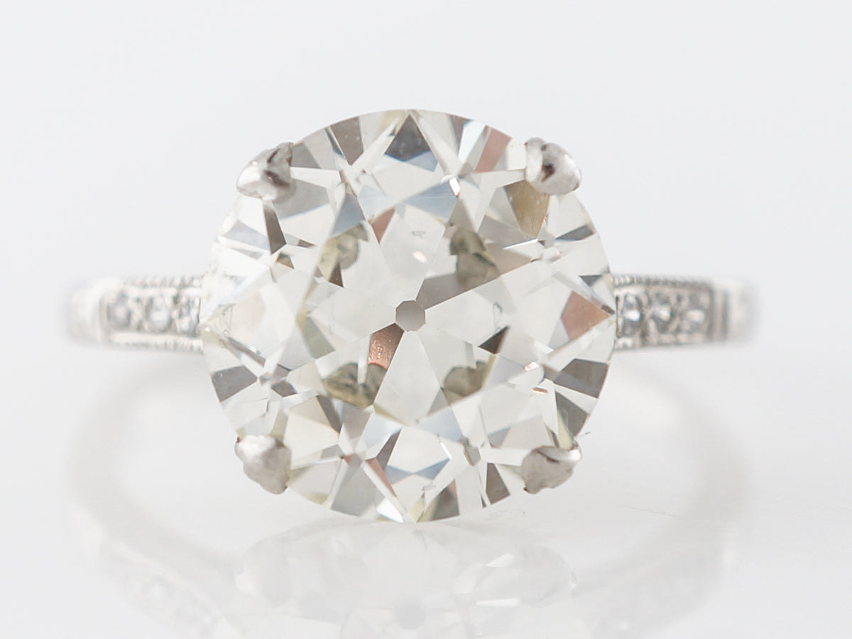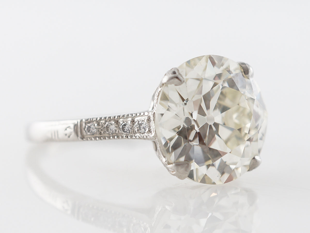 3.60 Carat European Cut Diamond Engagement Ring Platinum. This stunning Art Deco engagement ring features an amazing GIA certified 3.60 carat Old European cut diamond and is set in platinum. The shoulders contain .04 carats of small round accent diamonds which are set in line and surrounded by milgrain detail. There is also skillful engraving done along the side of the basket and at the bottom of the string of accent stones. This is one of the better examples of an Old European cut you will ever see, and the wonderful setting completes this special ring.
