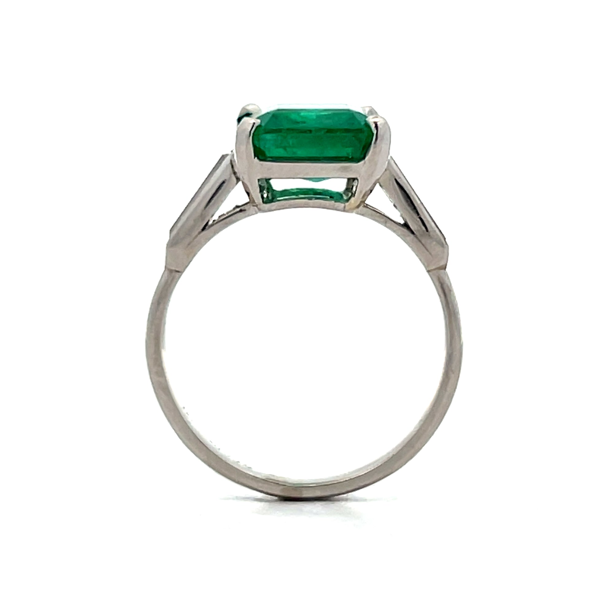 This modern 3.61 Carat Emerald & Diamond Cocktail Ring is crafted in shimmering platinum. Features a stunning 3.61 carat sea green emerald. Two (2) .35 carat baguette cut diamonds flank the center stone for dimensional sparkle at the shoulders of the band. Finished on a chic and durable platinum band. The emerald has an ethereal glow, which is hard to convey with pictures and video. A wonderful ring you will cherish forever.