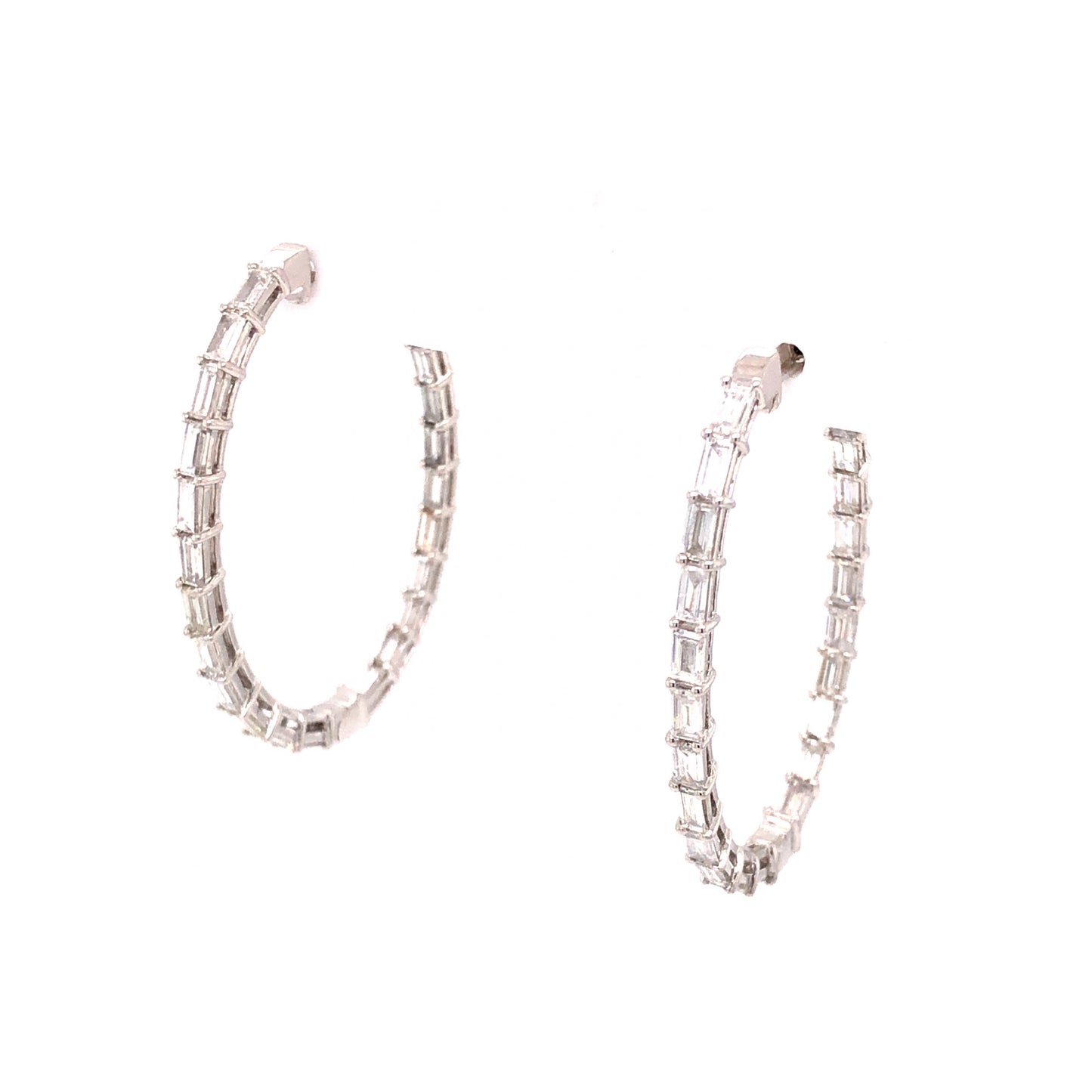 These inspiring, inside-out hoops feature 3.62 carats of baguette cut diamonds finished in 18 karat white gold. Forty-eight (48) .13 carat diamonds, each near colorless and dazzling, are set in shared prongs and circle the entire hoop. The essential set of earrings to elevate your look!