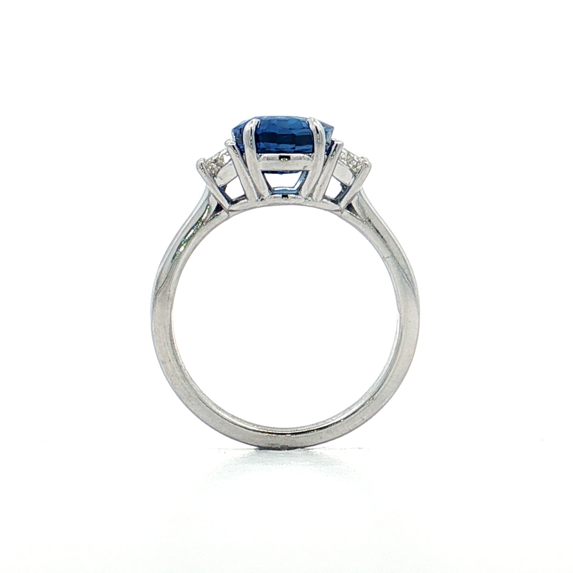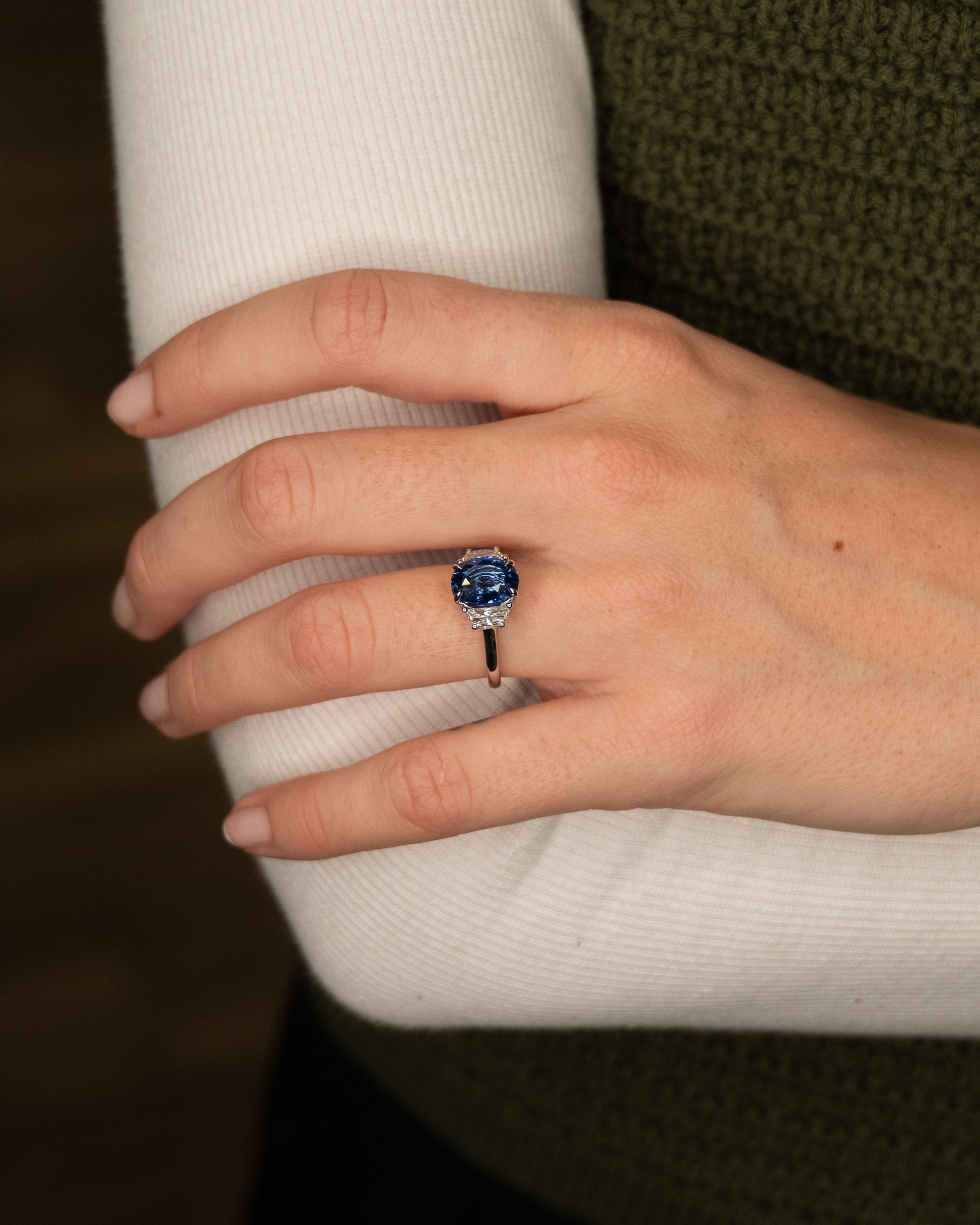 This 18 karat white gold three-stone ring centers a 3.65 carat oval cut blue sapphire flanked by two half-moon diamonds totaling .66 carats (.33 carats each). The oval cut sapphire shows a deep blue color and has an elongated shape that covers more finger space than a round stone of the same carat weight. Half-moon diamonds are shaped like semicircles and fit snugly against the curved sides of the oval sapphire, creating a cohesive flow across the ring's face.