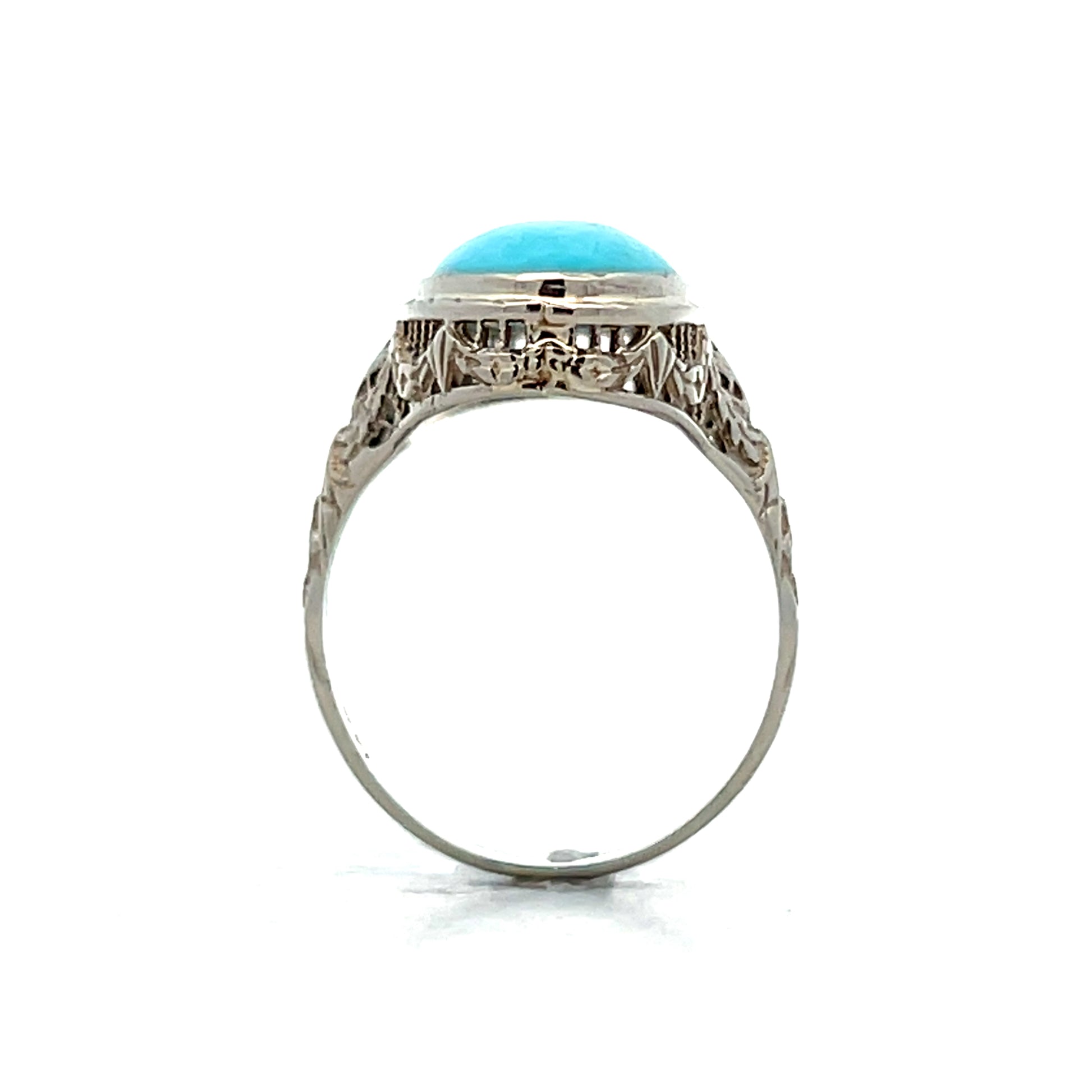 This antique Art Deco cocktail ring centers on a 3.65-carat oval cabochon turquoise set in 14-karat white gold. The bezel setting frames the vibrant blue stone while protecting its smooth, polished surface. Intricate filigree mounting surrounds the turquoise, displaying the detailed metalwork characteristic of the Art Deco period. The white gold provides a beautiful contrast against the rich turquoise color.