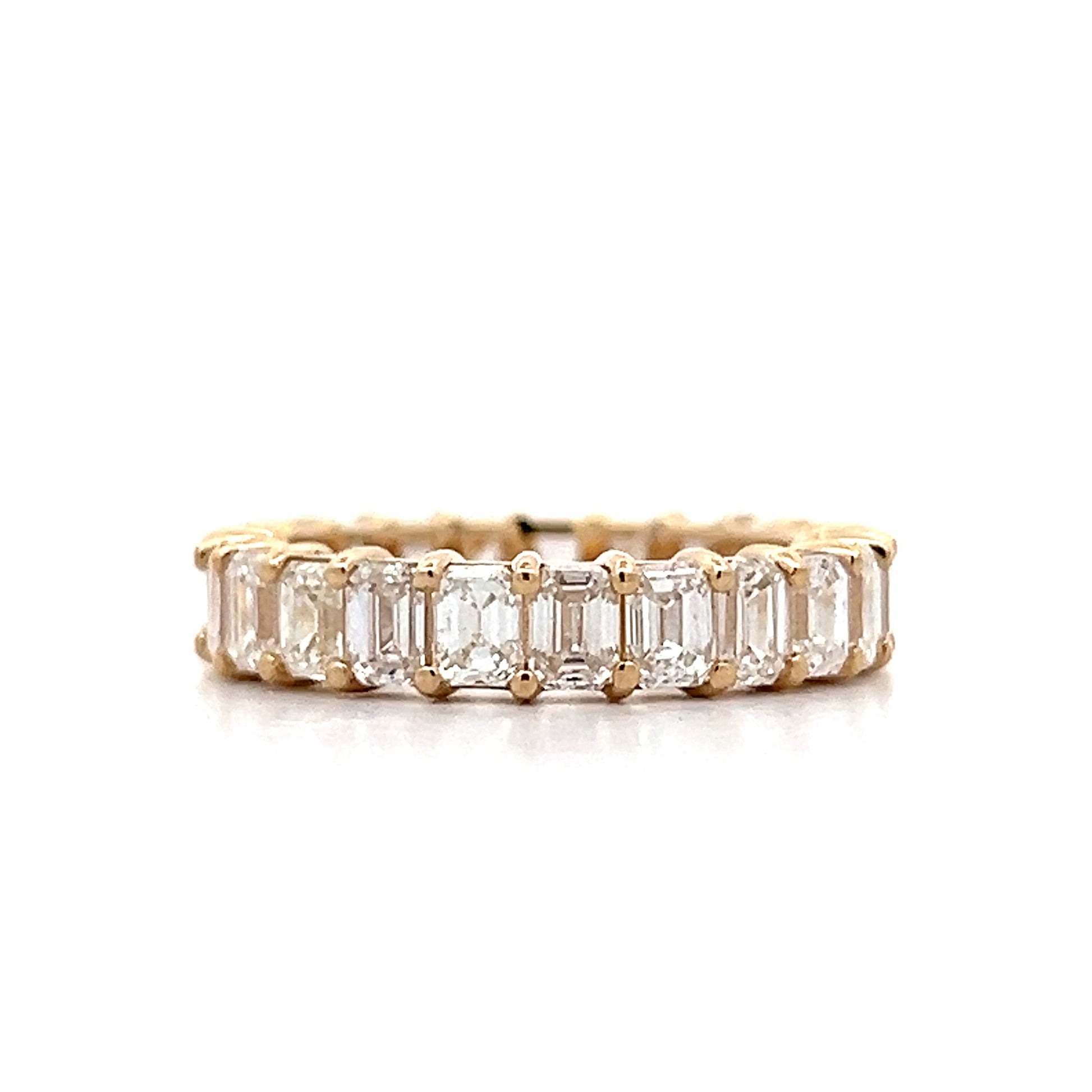 This diamond eternity band is made from 14-karat yellow gold and features emerald cut diamonds in a shared prong setting with a total weight of 3.76 carats. Each diamond has VS2 clarity and H color grades, creating consistent quality across all stones in the band. The shared prong setting allows adjacent diamonds to share metal supports, maximizing the surface area of diamonds visible while minimizing the metal between stones.