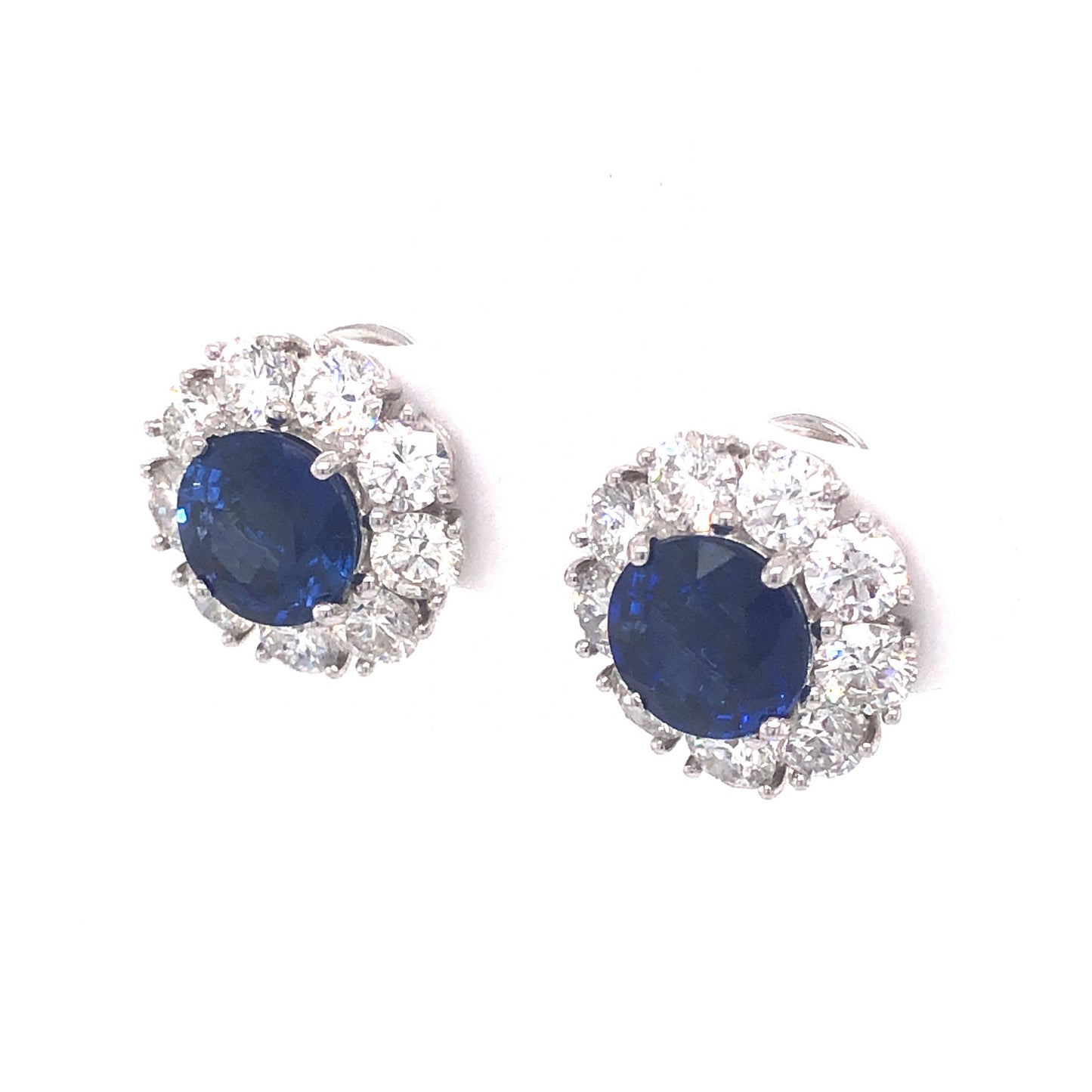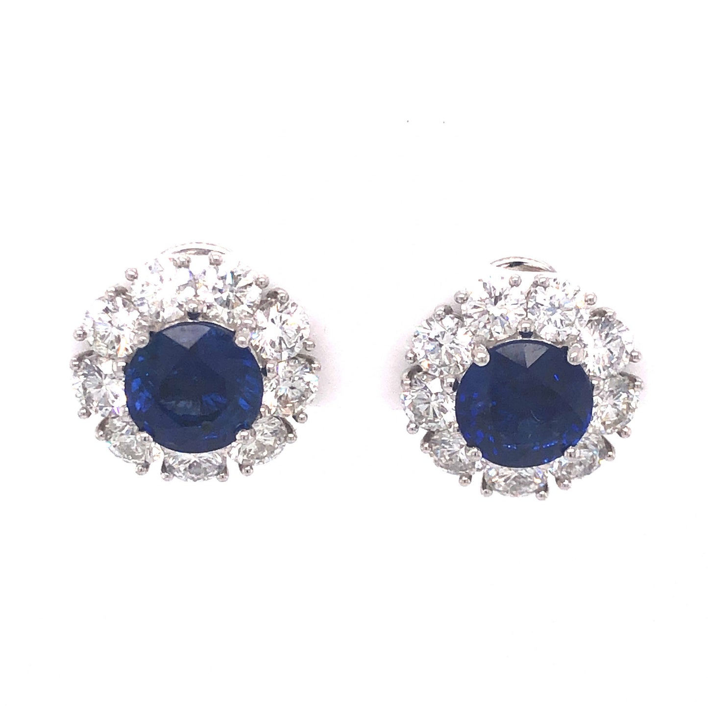 3.82 Round Cut Sapphire Diamond Earrings in Platinum. These elegant cluster earrings feature 3.82 carats of blue sapphires and 2.74 carats of Round Brilliant cut diamonds finished in platinum. The two (2) 1.91 carat sapphires have a deep blue hue and are set in four (4) platinum prongs. The sapphires are haloed by eighteen (18) 0.15 carat Round Brilliant cut diamonds. The diamonds are eye clean and exceptionally brilliant, adding some sparkle to the deep blue center stones. A lovely set of modern earrings in beautiful blue sapphire!