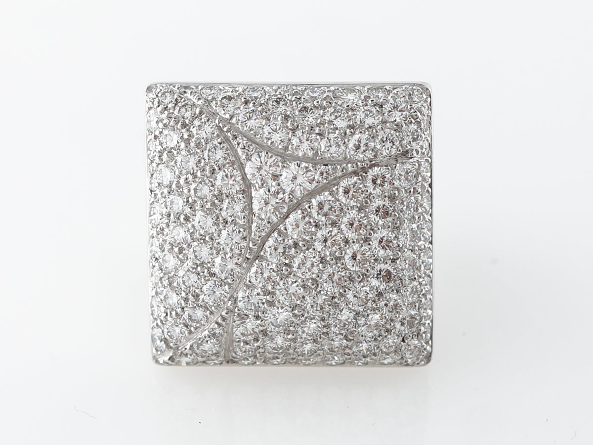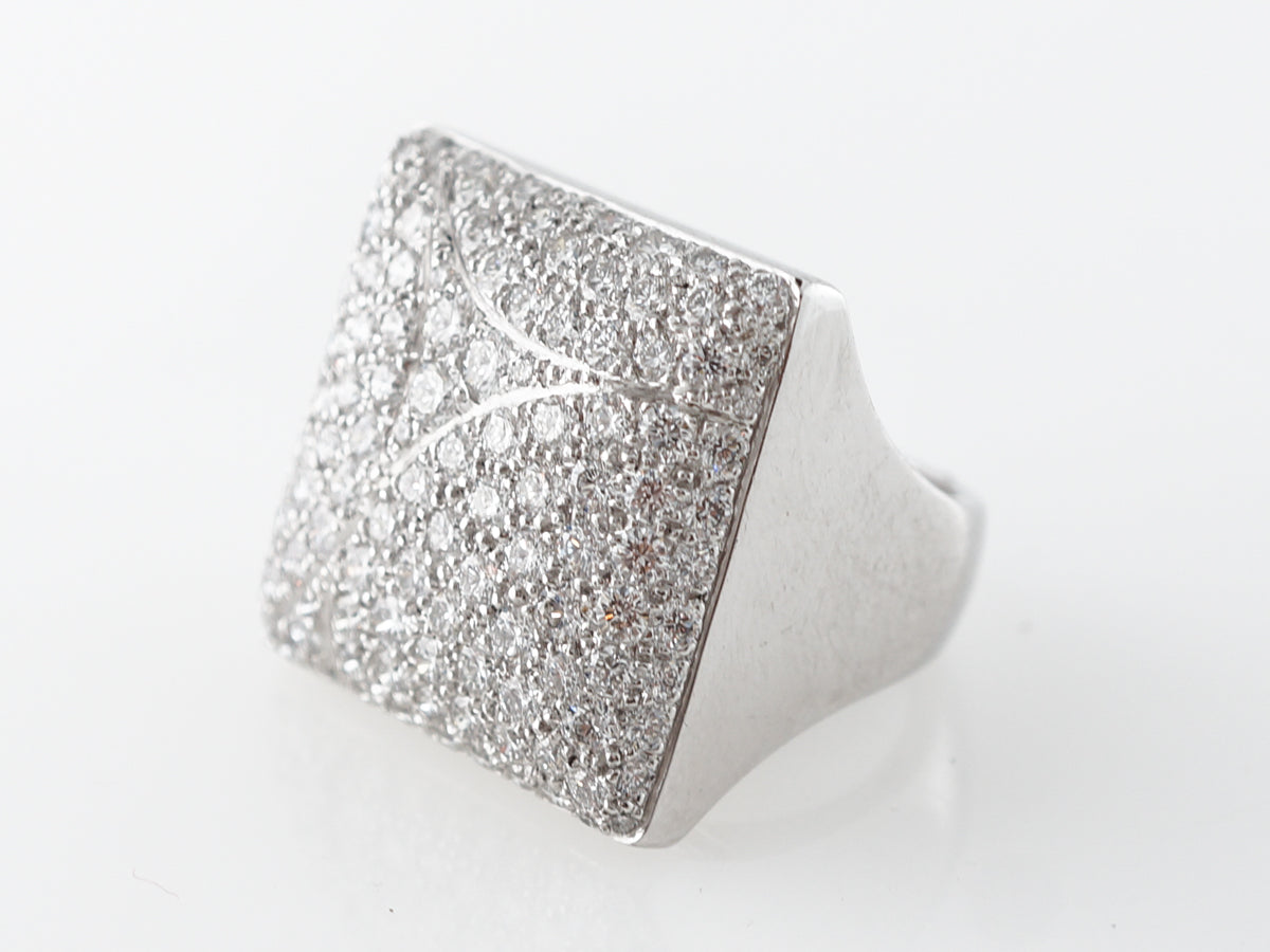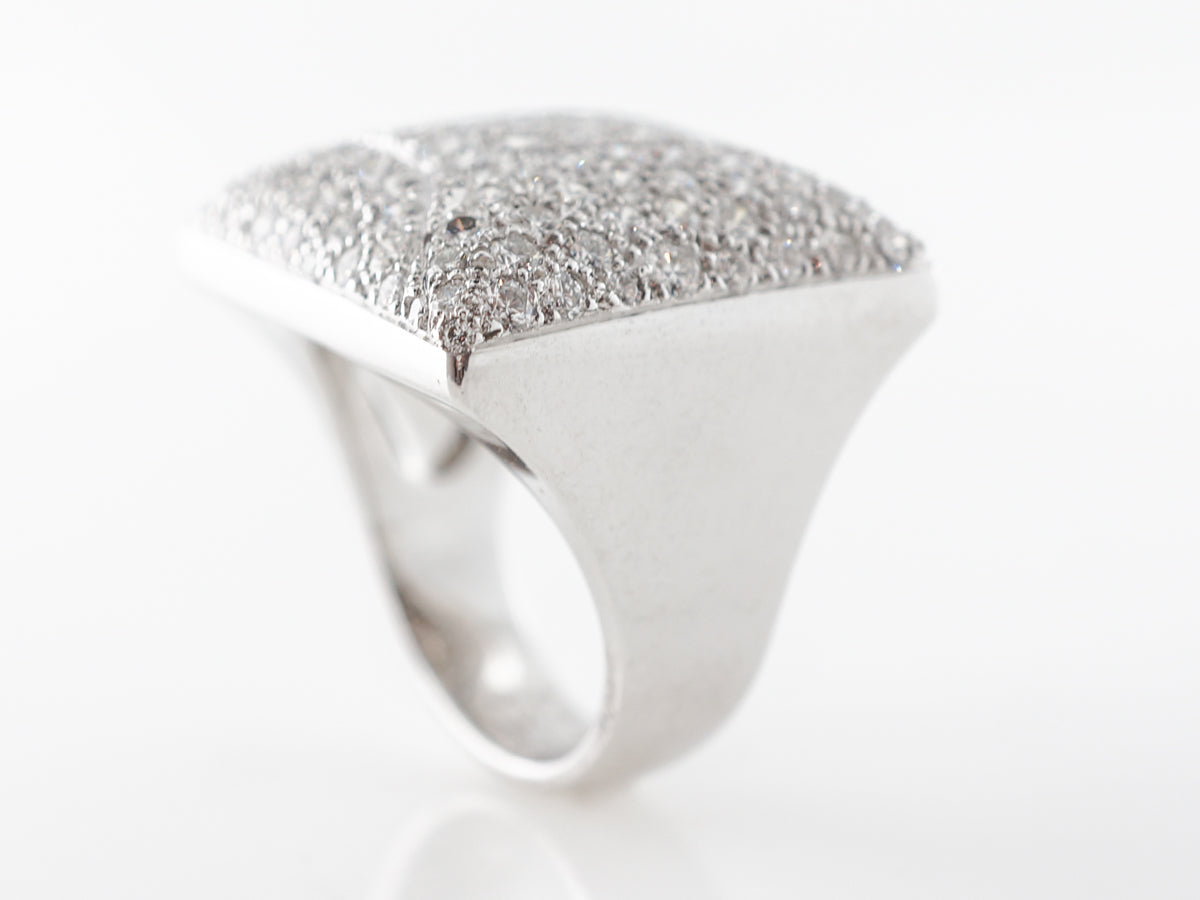 3 Carat Cartier Diamond Ring in White Gold. What a fabulous cocktail ring by Cartier featuring 3 carats of diamonds in a pave style finished in 18 karat white gold! The ring features a subtle off-center curved design that adds an element of depth. One of the things that sets Cartier apart from many jewelers is their use of very white, very clear melee stones as they have with this cocktail ring. This ring is very striking yet still manages to be undeniably tasteful and elegant.