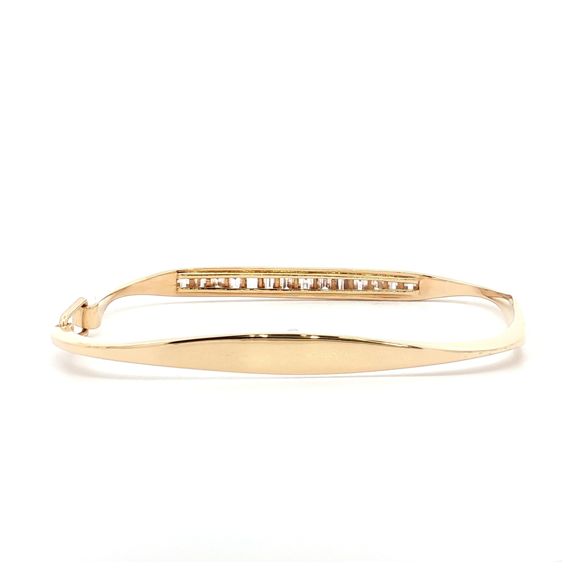 This rectangular bangle bracelet is made of 18 karat yellow gold and features 3.00 carats of channel-set baguette diamonds set across the top of the band. The natural diamonds have VS2 clarity and H-I color. The bangle's hinged design allows it to open and close securely at the clasp.