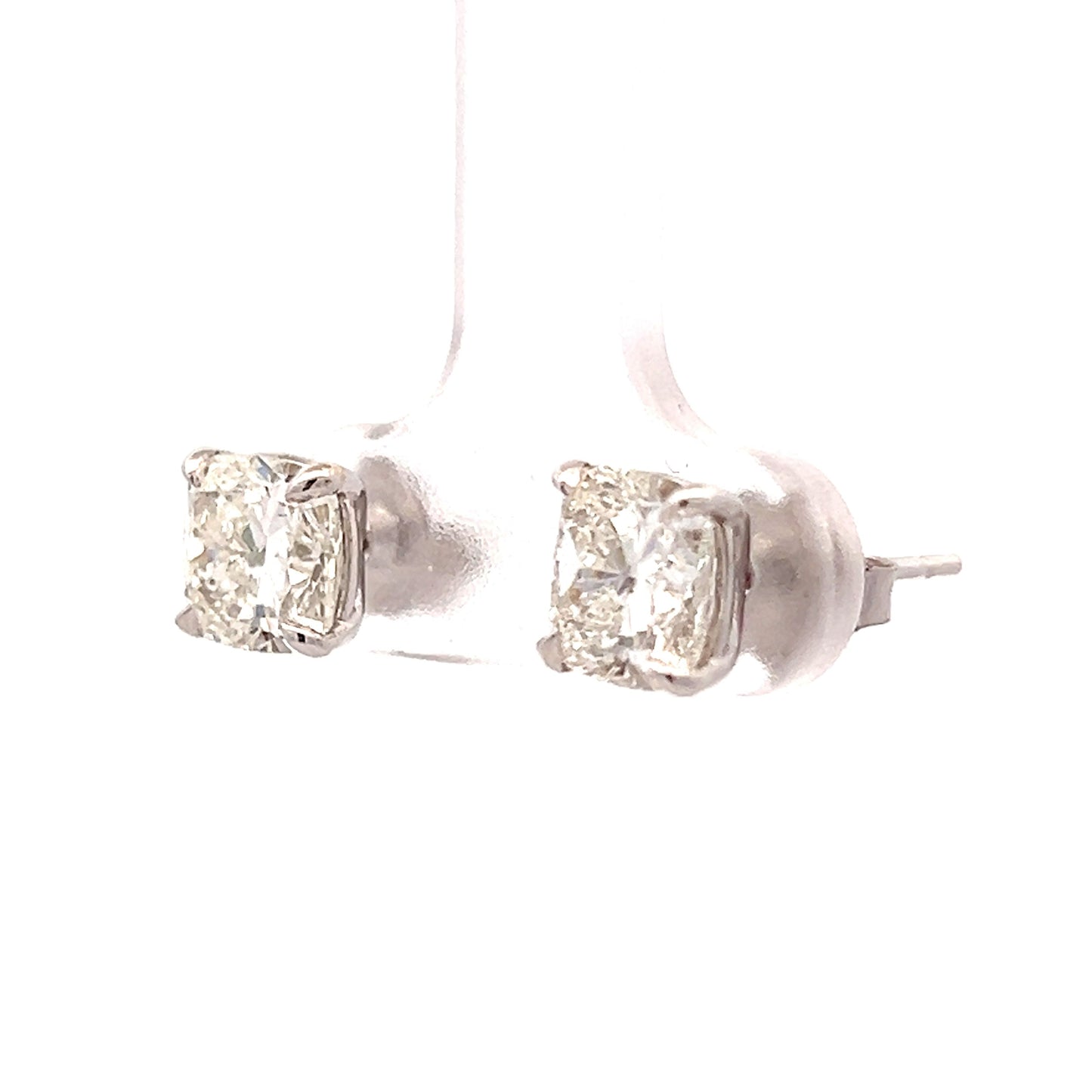 These diamond stud earrings, crafted in 18 karat white gold, feature two stunning cushion-cut diamonds weighing 1.52 carats each. The diamonds are set in secure four-prong baskets allowing for maximum brilliance. The cushion cut diamond will sit close to the ear, making them easy to wear for extended periods.
