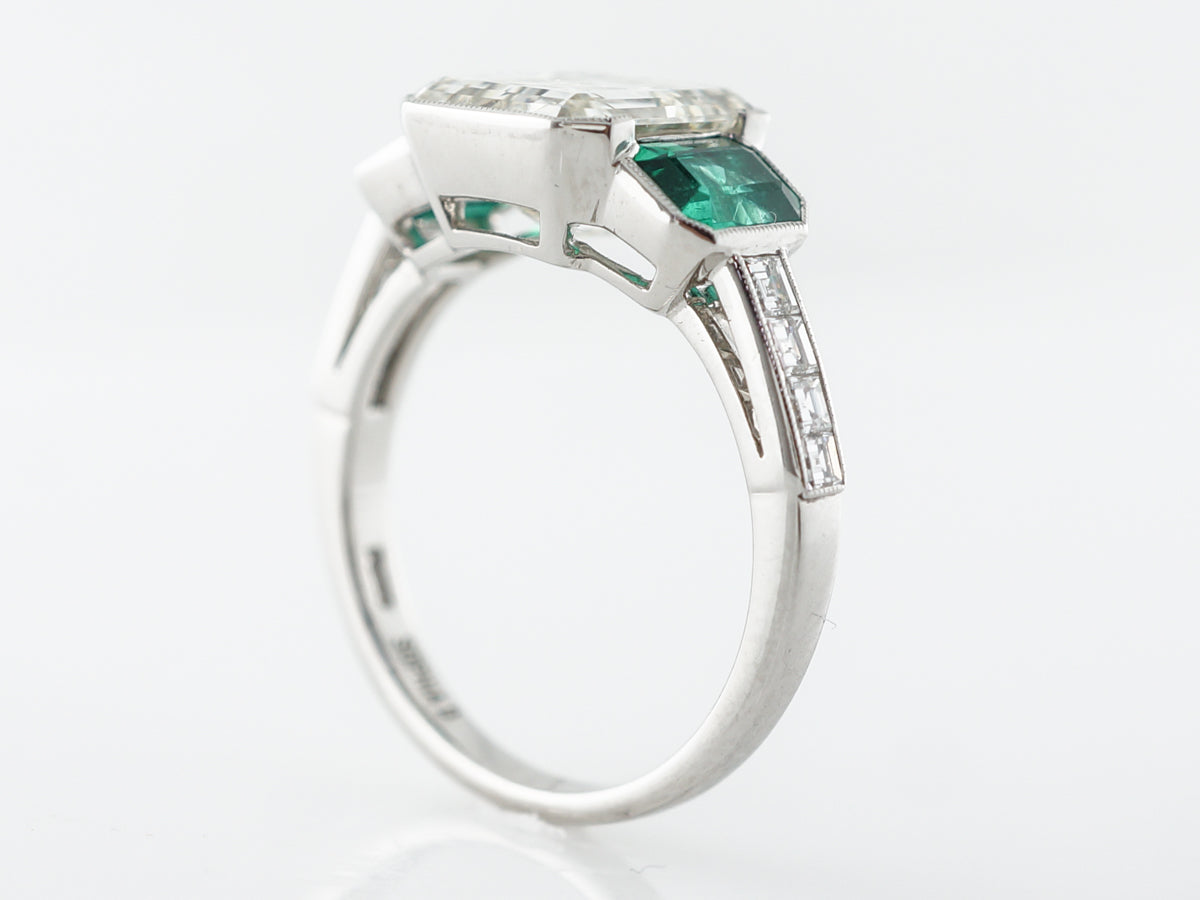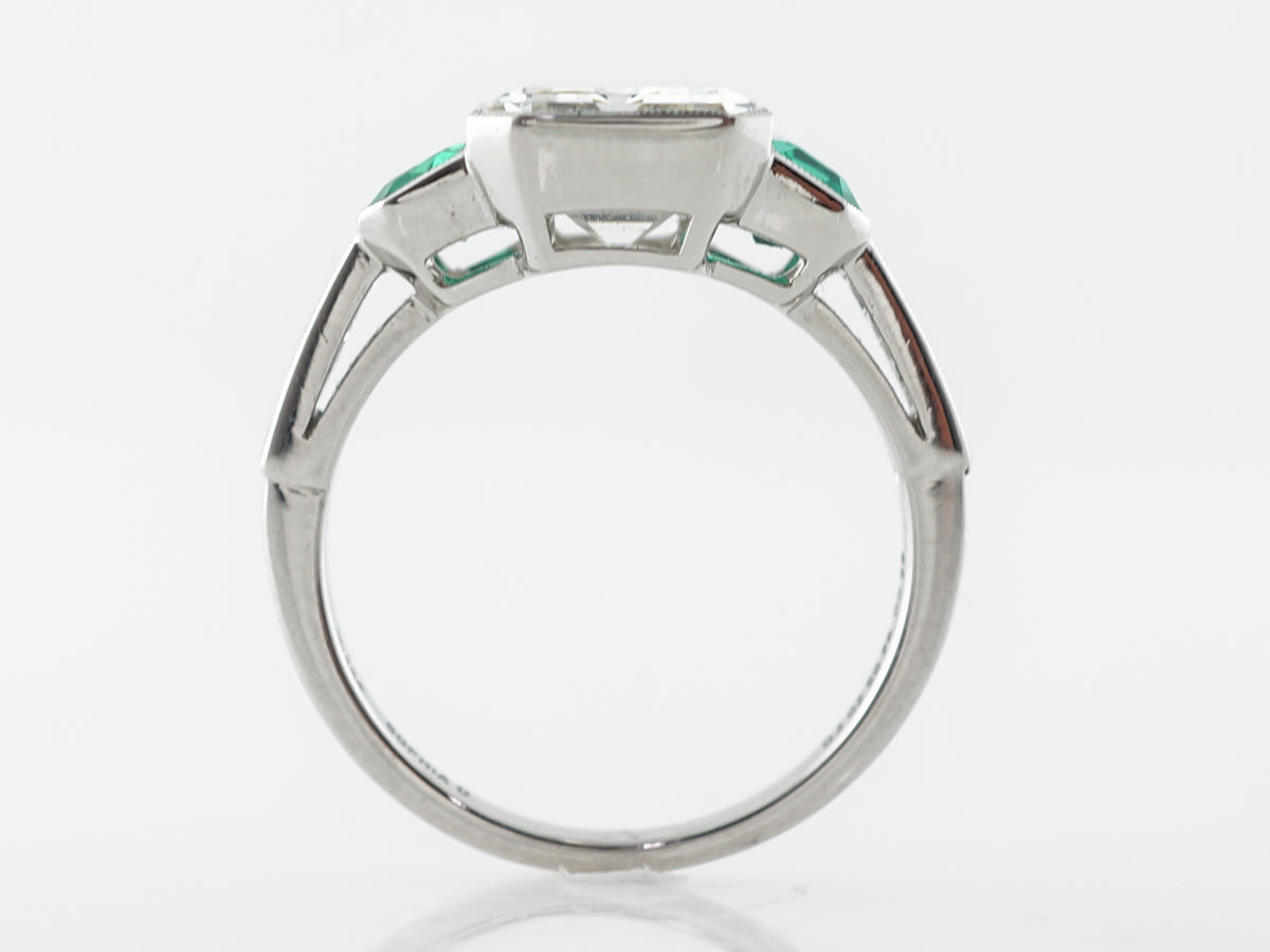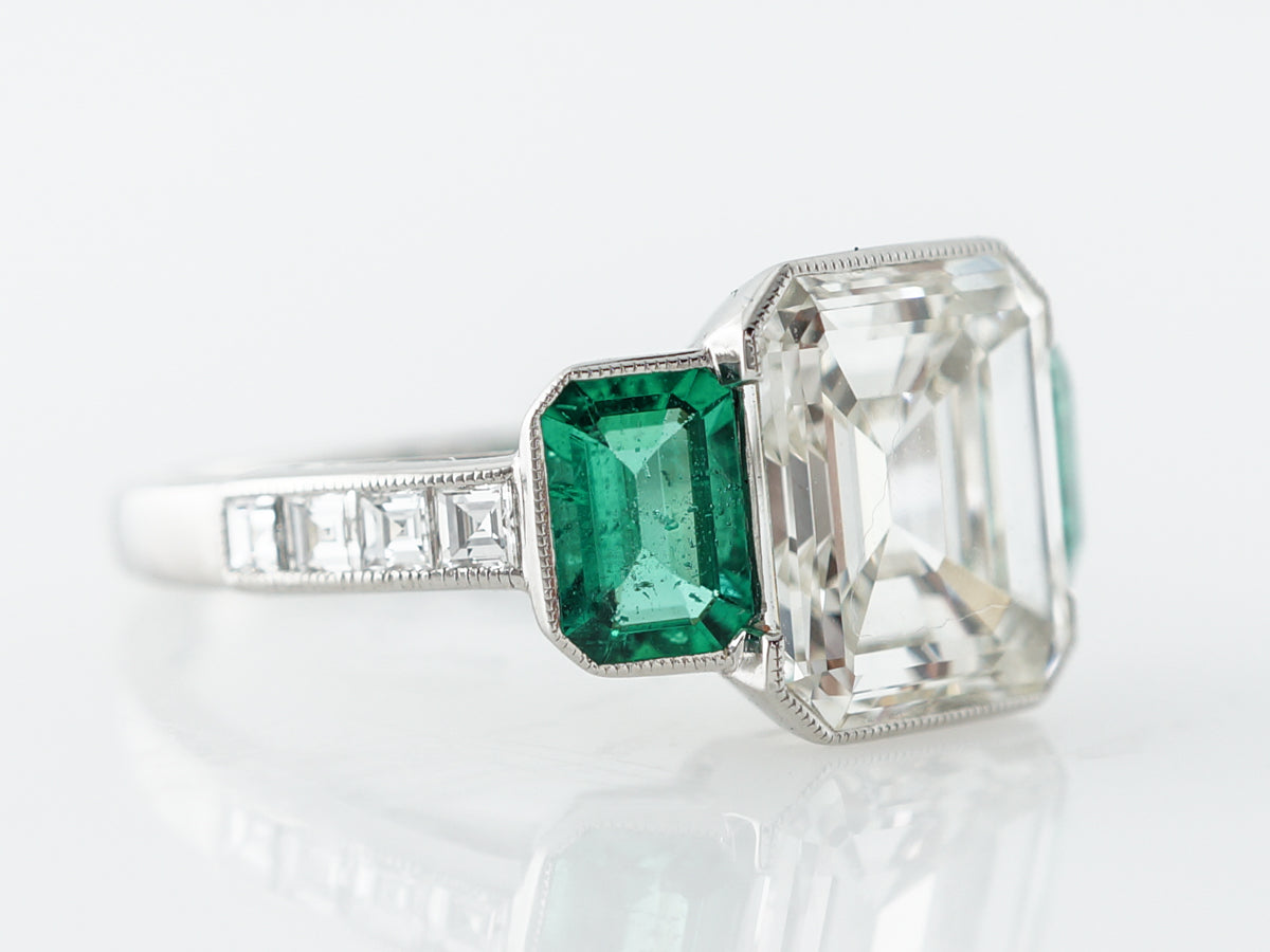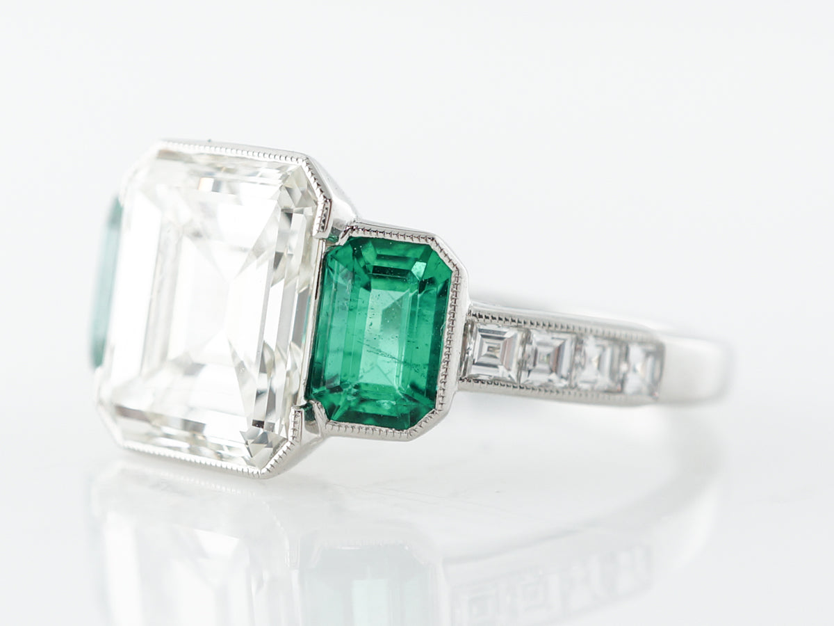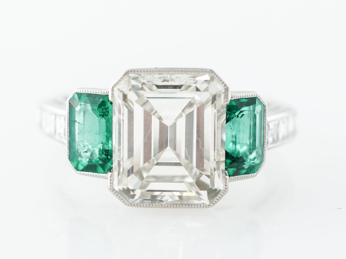 Three Stone Emerald Cut Diamond Engagement Ring in Platinum. This fine modern three stone engagement ring features a gorgeous 3.02 carat emerald cut diamond and .94 carats of emerald cut emeralds set in platinum. The ring also contains Asscher cut diamond accents along the shoulders below the main three stones, which is quite an unusual cut for an accent stone. The bezels around the center stones as well as on the borders of the channel set accents are all adorned with fine milgrain detail. Everything about the setting of this ring is clean and elegant, doing everything to show off the natural beauty of the fabulous gemstones.