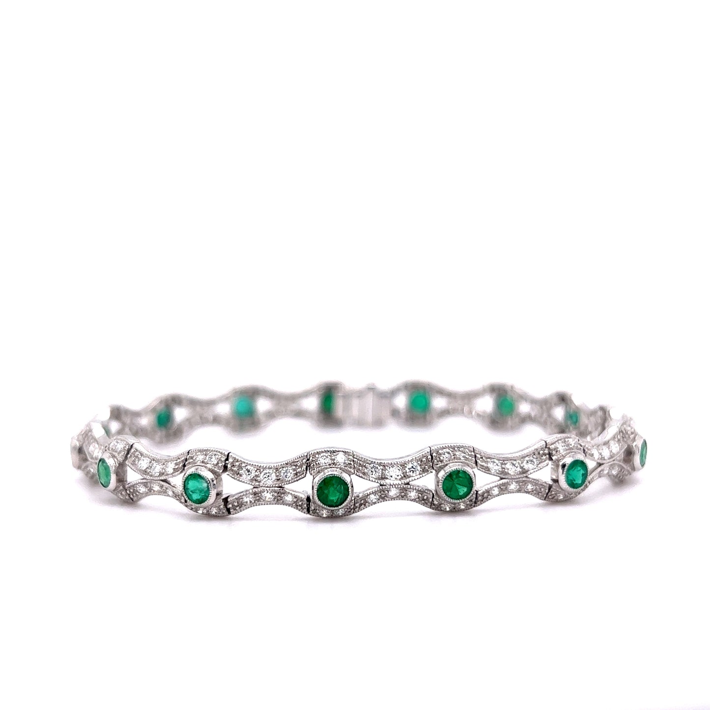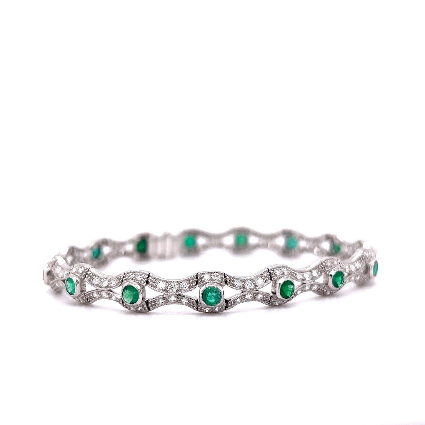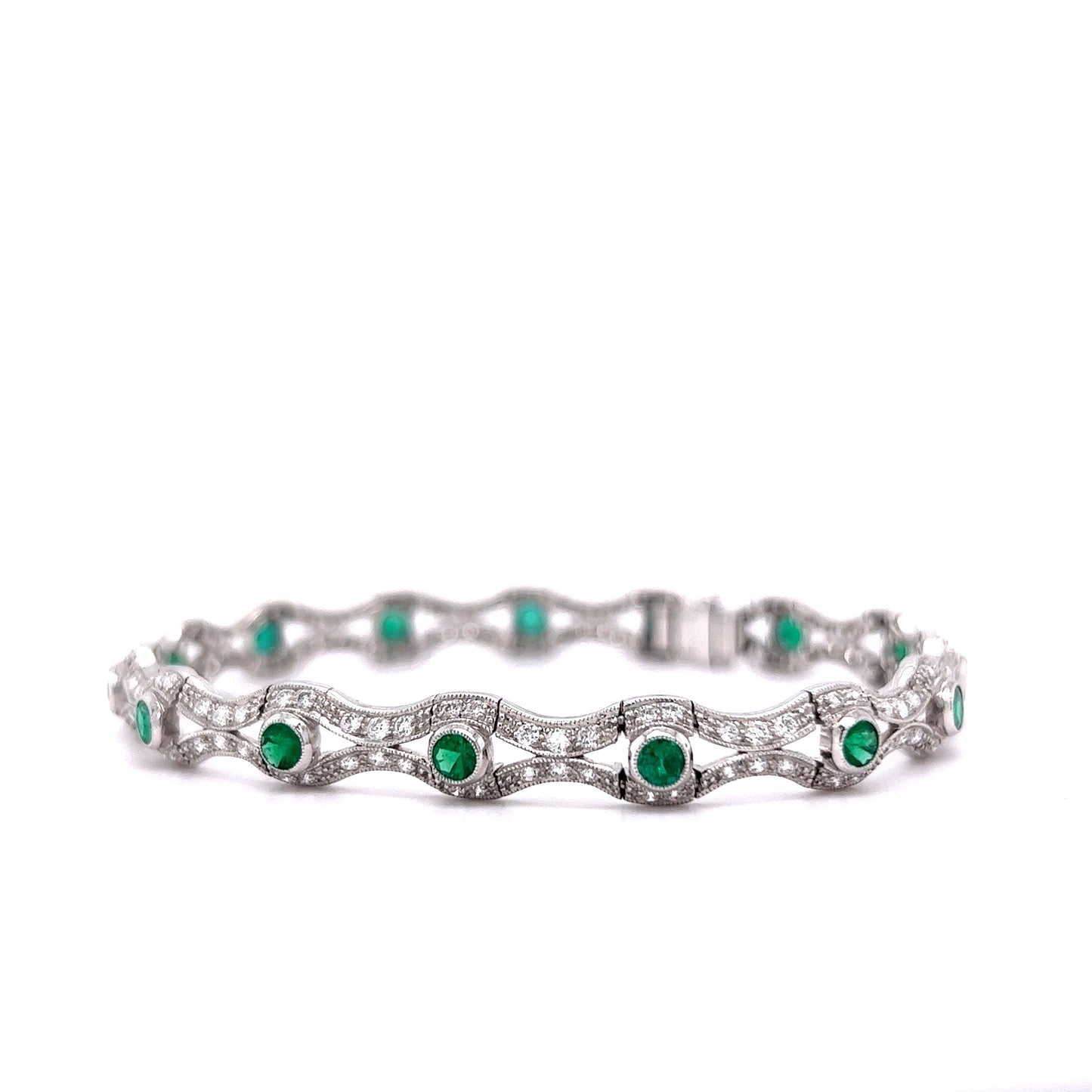 3 Carat Emerald Diamond Bracelet in 18k White Gold. This modern diamond and emerald bracelet is set with 3.00 carats of emeralds and 1.75 carats of diamonds. The diamonds are bead set and graduated in size and the emeralds are bezel set and a highly desirable shade of green. The contrast of the rich emerald hue to the sleek stark white of the diamonds makes the scrolling design pop. The bracelet is completed in 18 karat white gold and is a stunning modern take on the Art Deco design period.