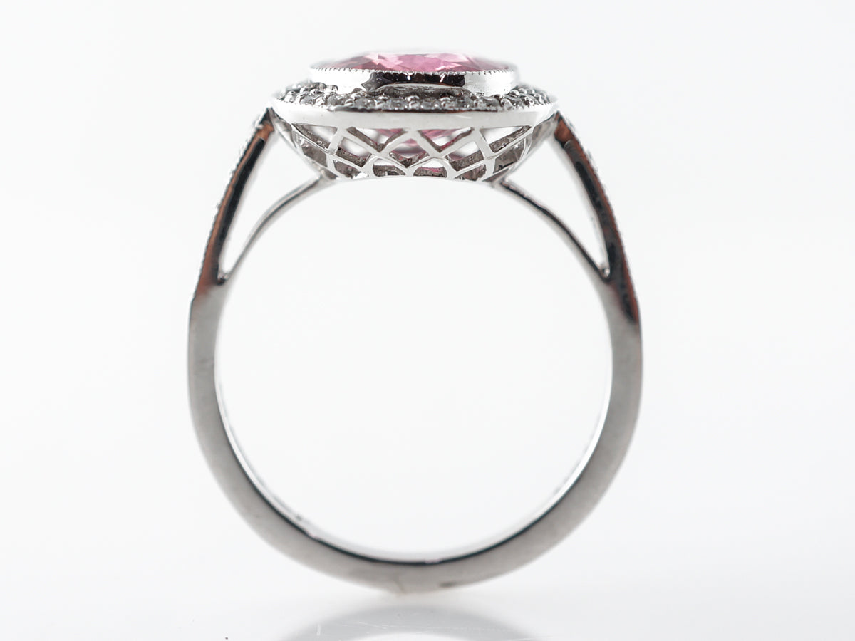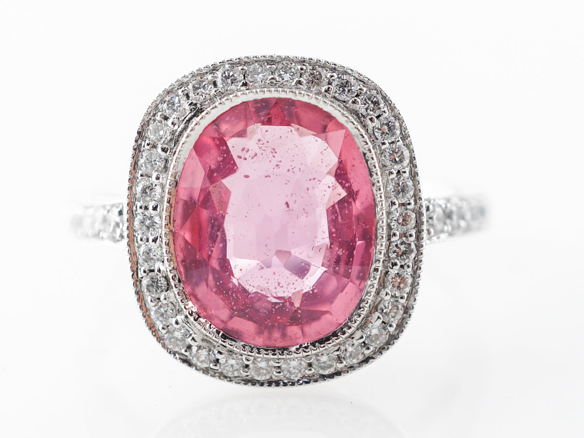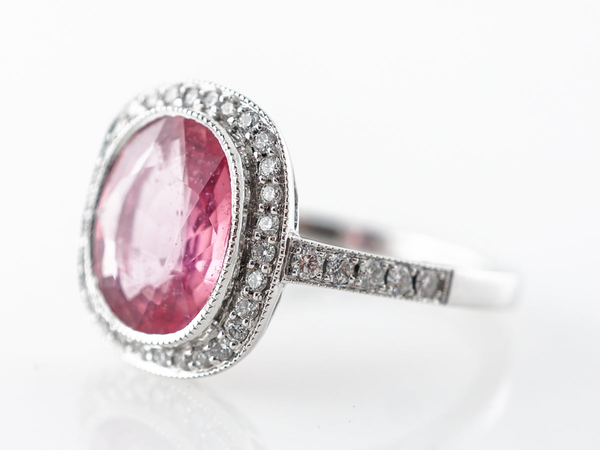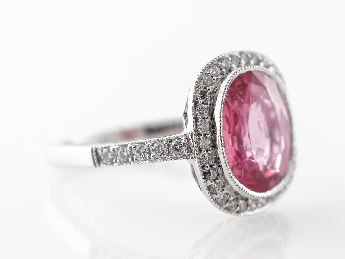 3 Carat Oval Pink Sapphire Diamond Ring in Platinum. This modern cocktail ring features a 3.22 carat oval cut pink sapphire with .30 carats of diamond accents and is set in platinum. The stunning pink sapphire is seated inside a milgrained bezel and surrounded by a diamond halo. The shoulders of the ring are also adorned with accent diamonds in a line with milgrain detail. If you love pink, this is the ring for you!