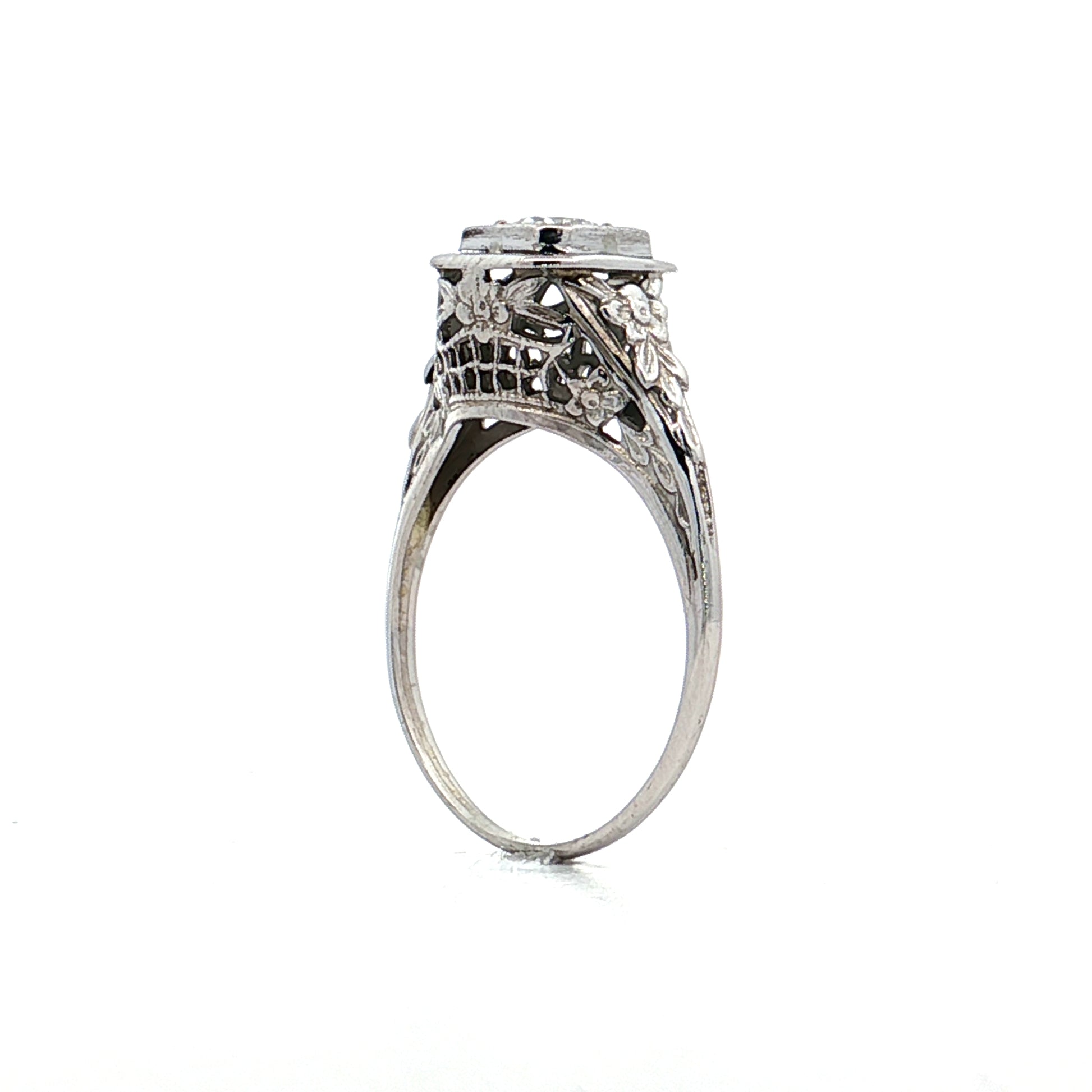 Old European cuts have larger facets and a smaller table than modern brilliants, creating a softer, more romantic play of light characteristic of vintage stones. The diamond sits in a square head with intricate filigree mounting throughout, accented by flower motifs and a milgrain bezel border that adds textured detailing. The geometric square setting and decorative metalwork are typical of 1920s-1930s design.