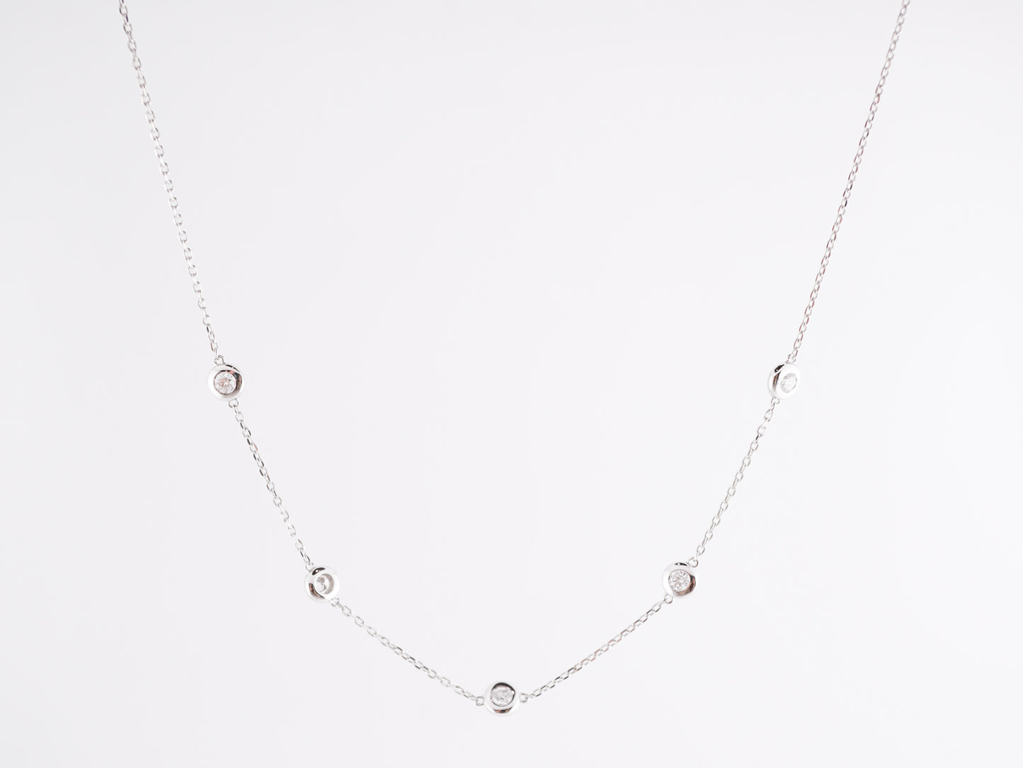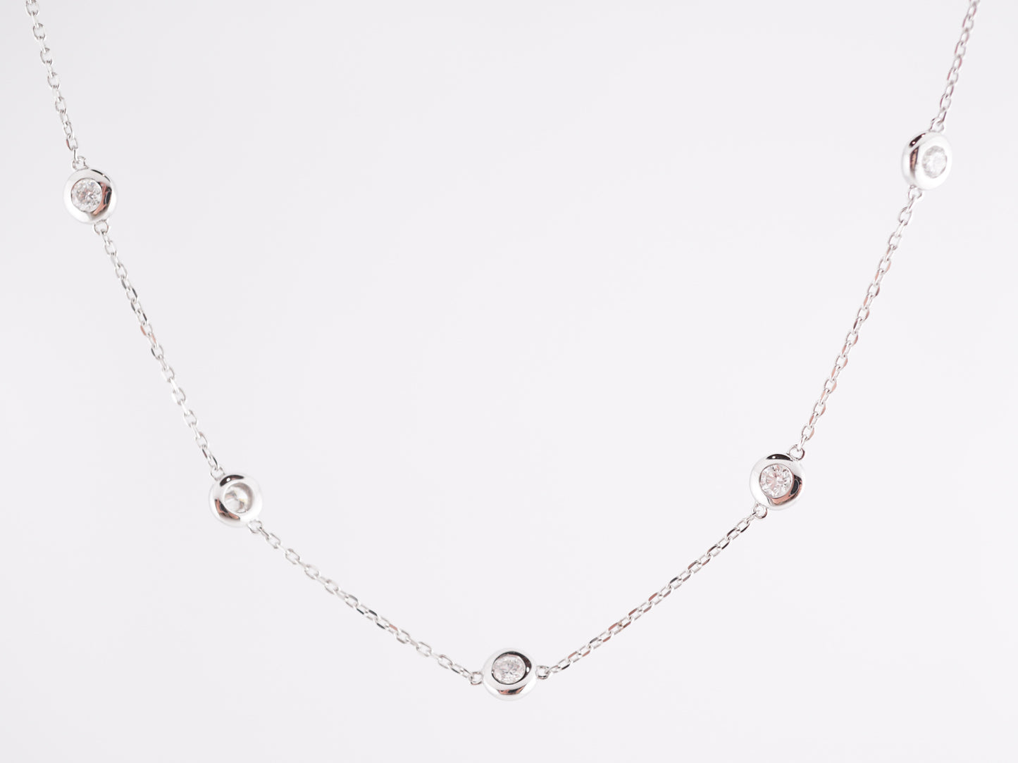 .30 Bezel Set Diamond Necklace in 14K White Gold. This 17” diamond necklace features .30 carat genuine natural diamonds in 14k white gold. The white gold chain securely holds the brilliant diamonds in bezel settings that punctuate throughout. The arrangement and design of this piece is timeless. This necklace will make a terrific gift for any loved one!