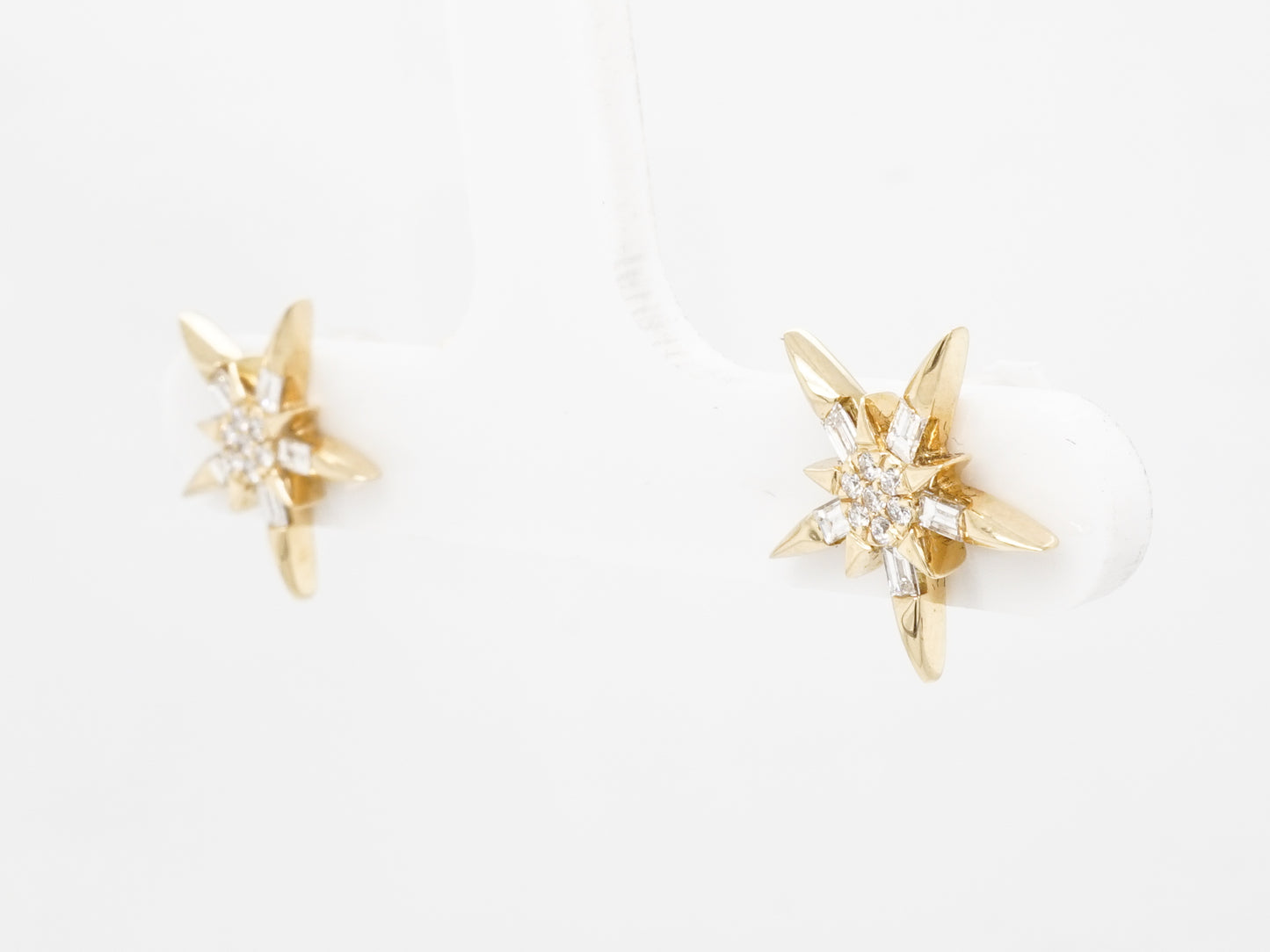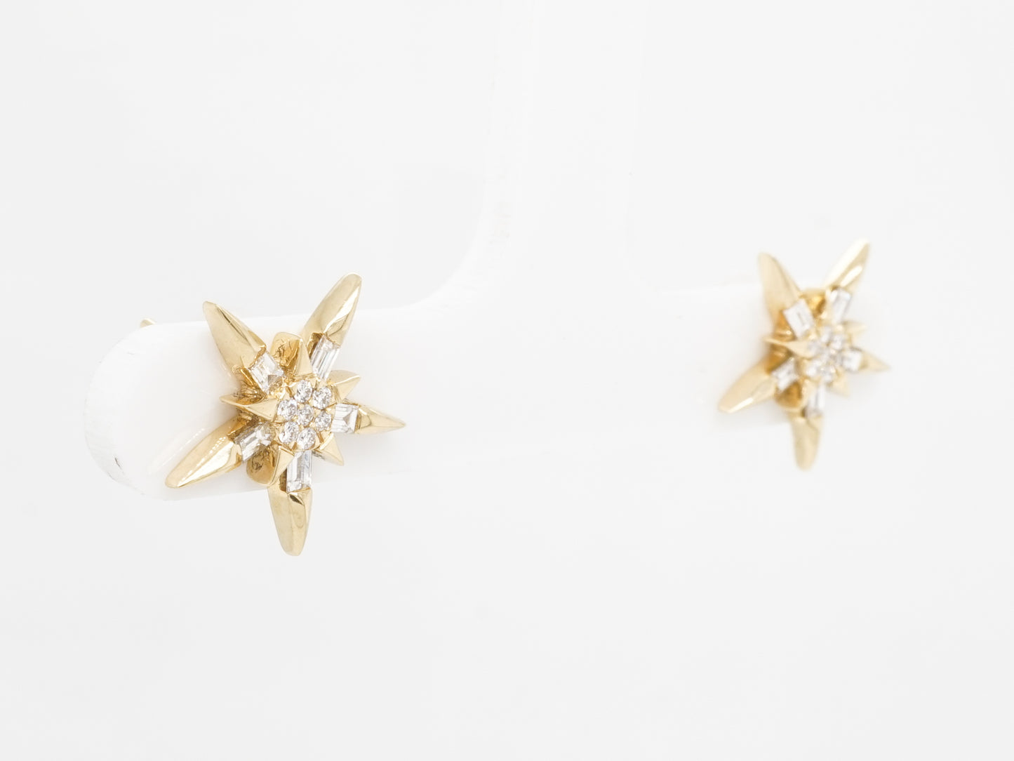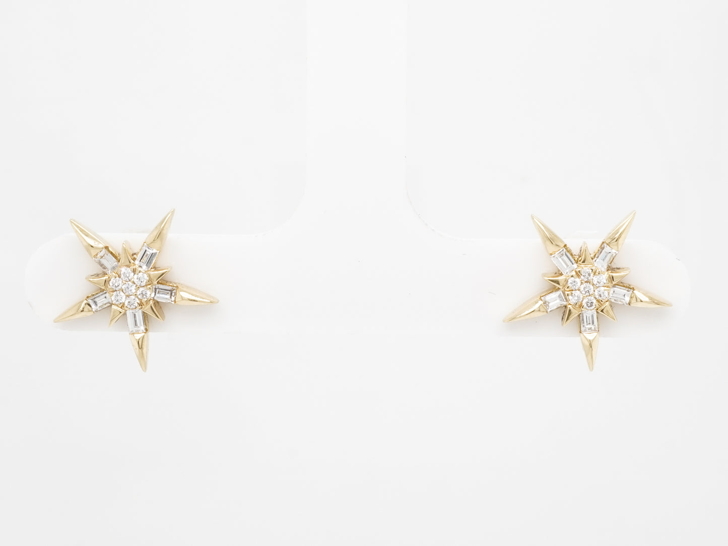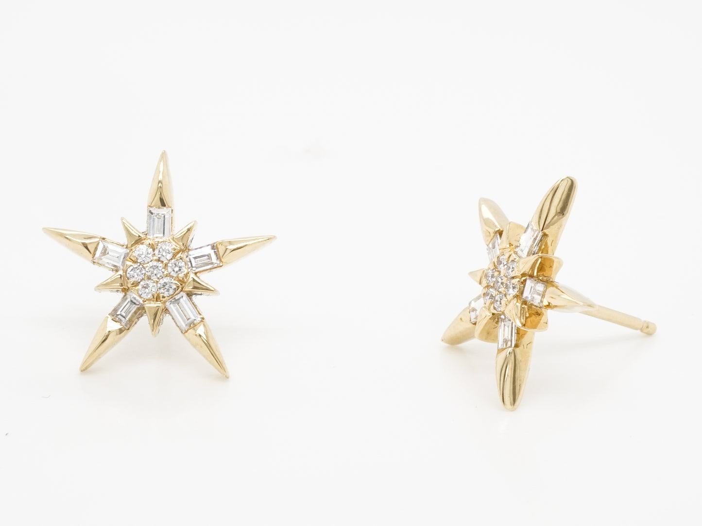 .30 Carat Diamond Starburst Earrings in 18k Yellow Gold. These mesmerizing stud earrings feature .30 carats of natural diamonds in 18k yellow gold. Fourteen round cut diamonds, each .005 carats, create the center point of the golden starburst design. Ten baguette diamonds accentuate the points of the star, each weighing .023 carats. For a set of earrings that will earn you some points for effortless glam, these diamond starburst earrings are the ones you need!