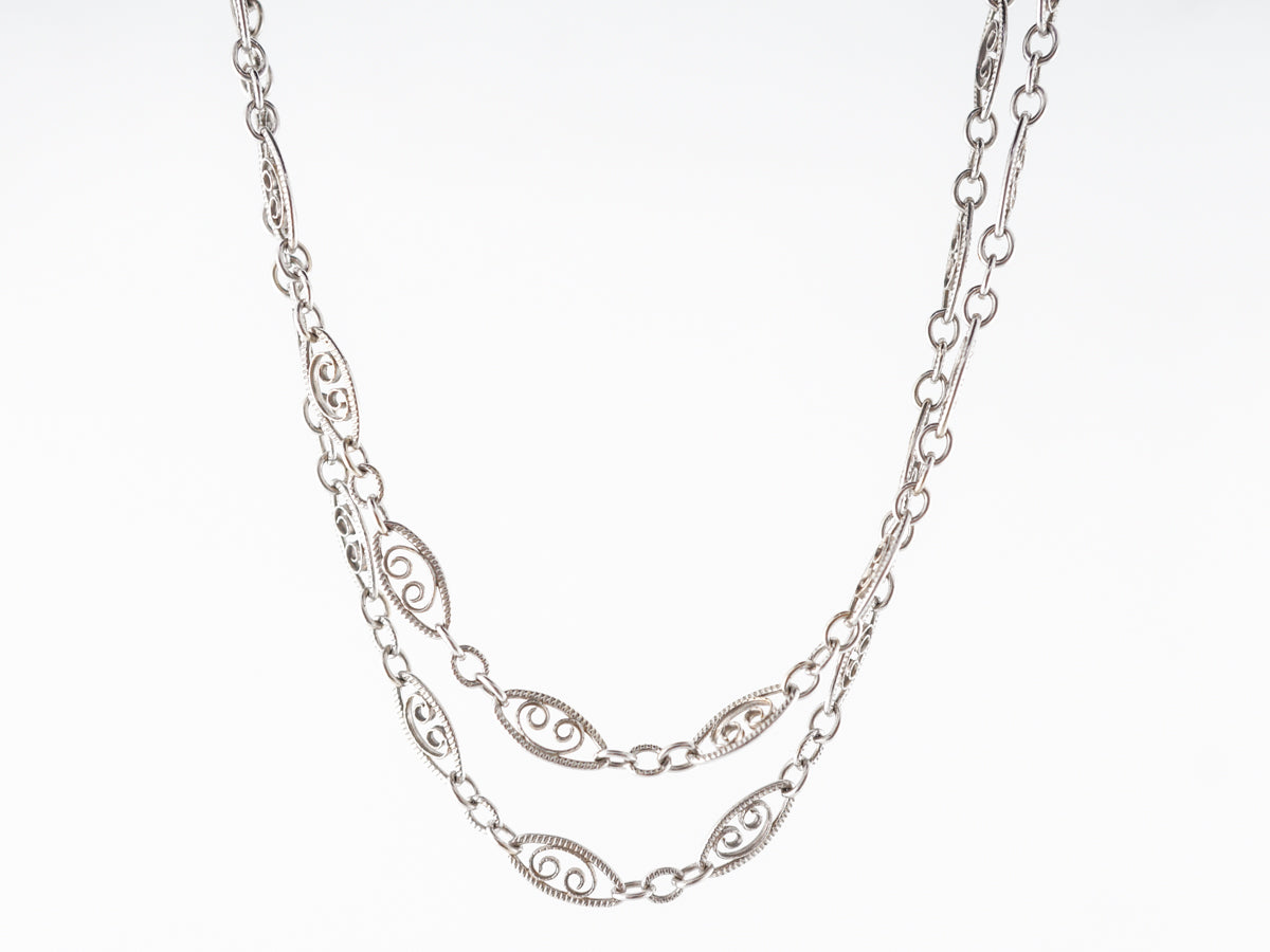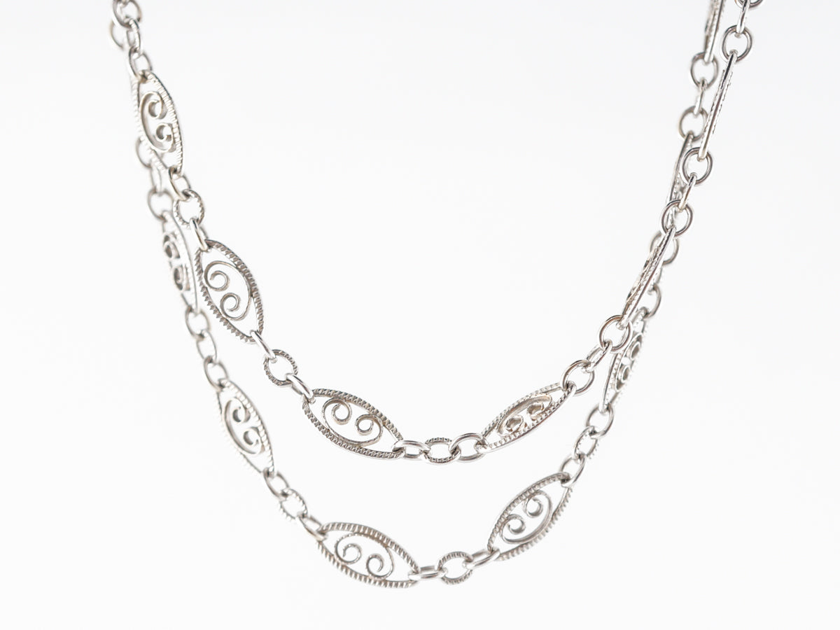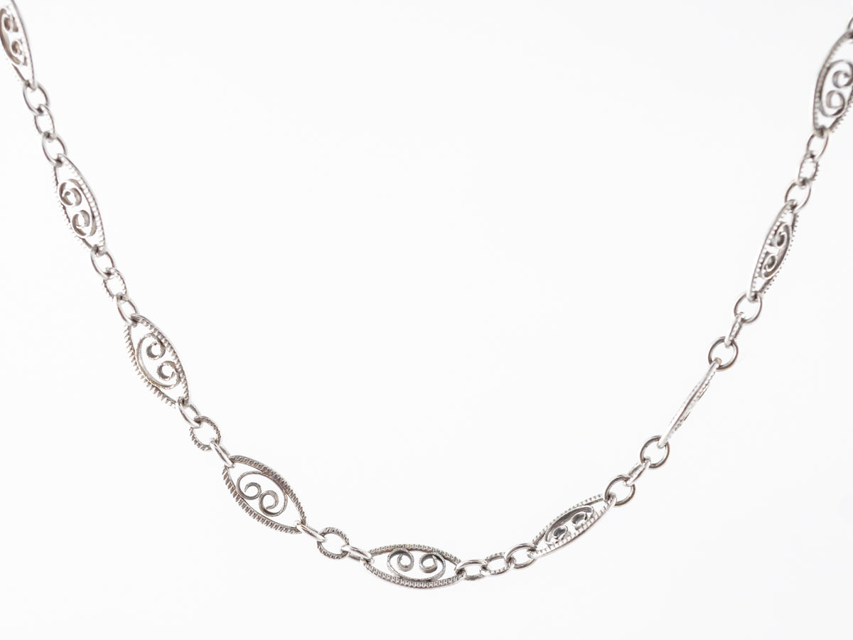 30 inch Mid-Century Chain w/ Filigree in White Gold. This mid-century chain is finished in 14 karat white gold. The chain measures 30 inches in length and features lovely filigree metalwork twisting inside of the larger links. This would be a stylish necklace worn as is, or could look great holding the right pendant.