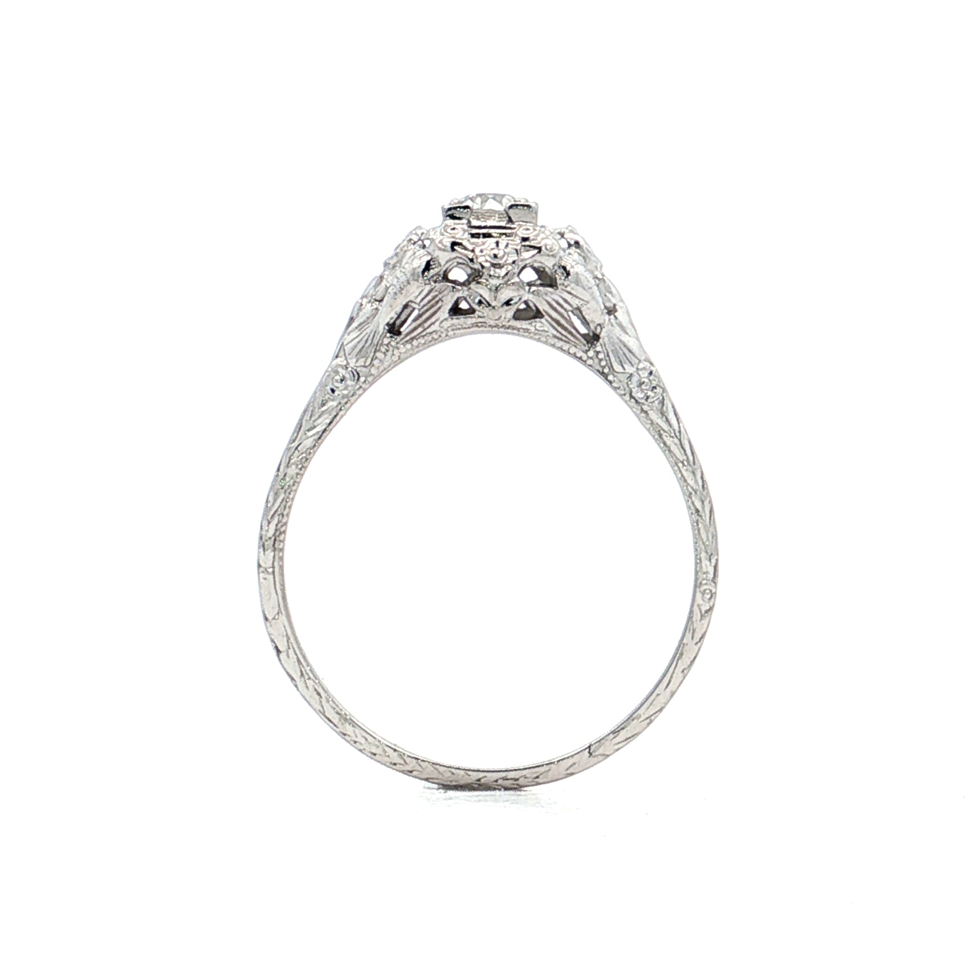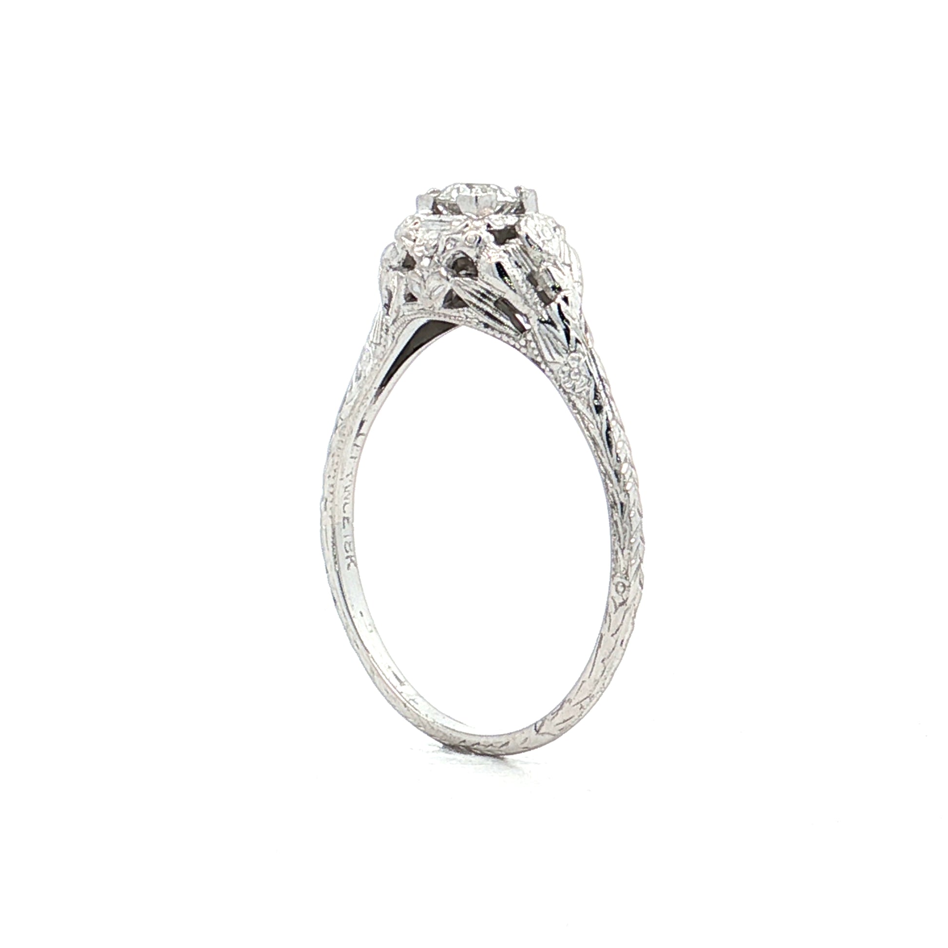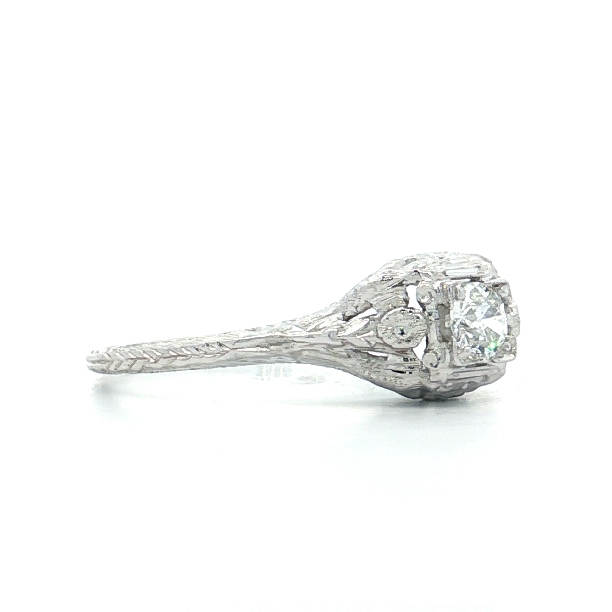 This Art Deco solitaire engagement ring features a .30 carat round brilliant cut diamond with H color and VS2 clarity, held in a four-prong setting made from 18 karat white gold. The intricate metalwork creates delicate patterns around the diamond setting while maintaining the solitaire's focus on the center stone. The white gold construction provides a neutral backdrop that highlights the diamond's natural brilliance and fire.