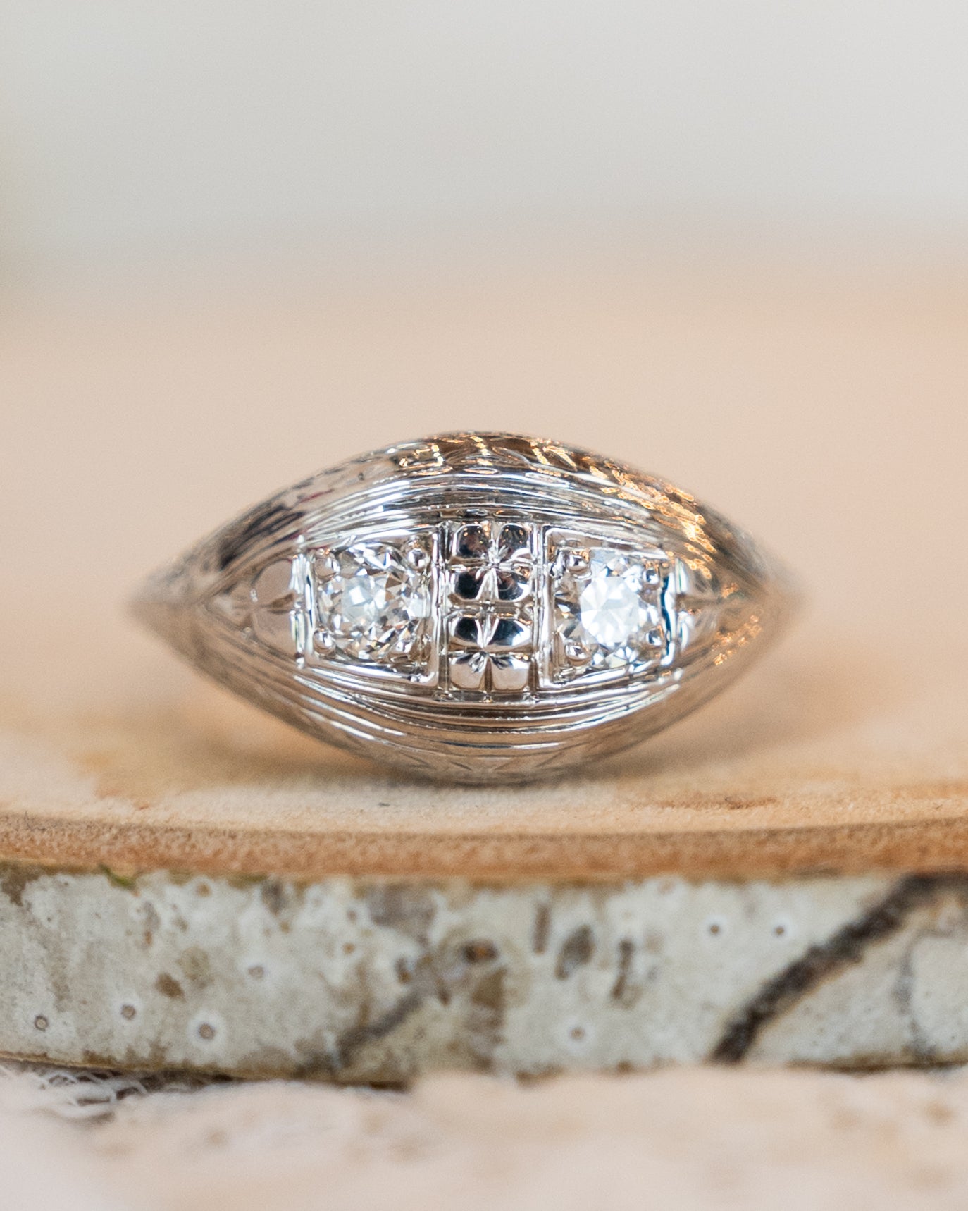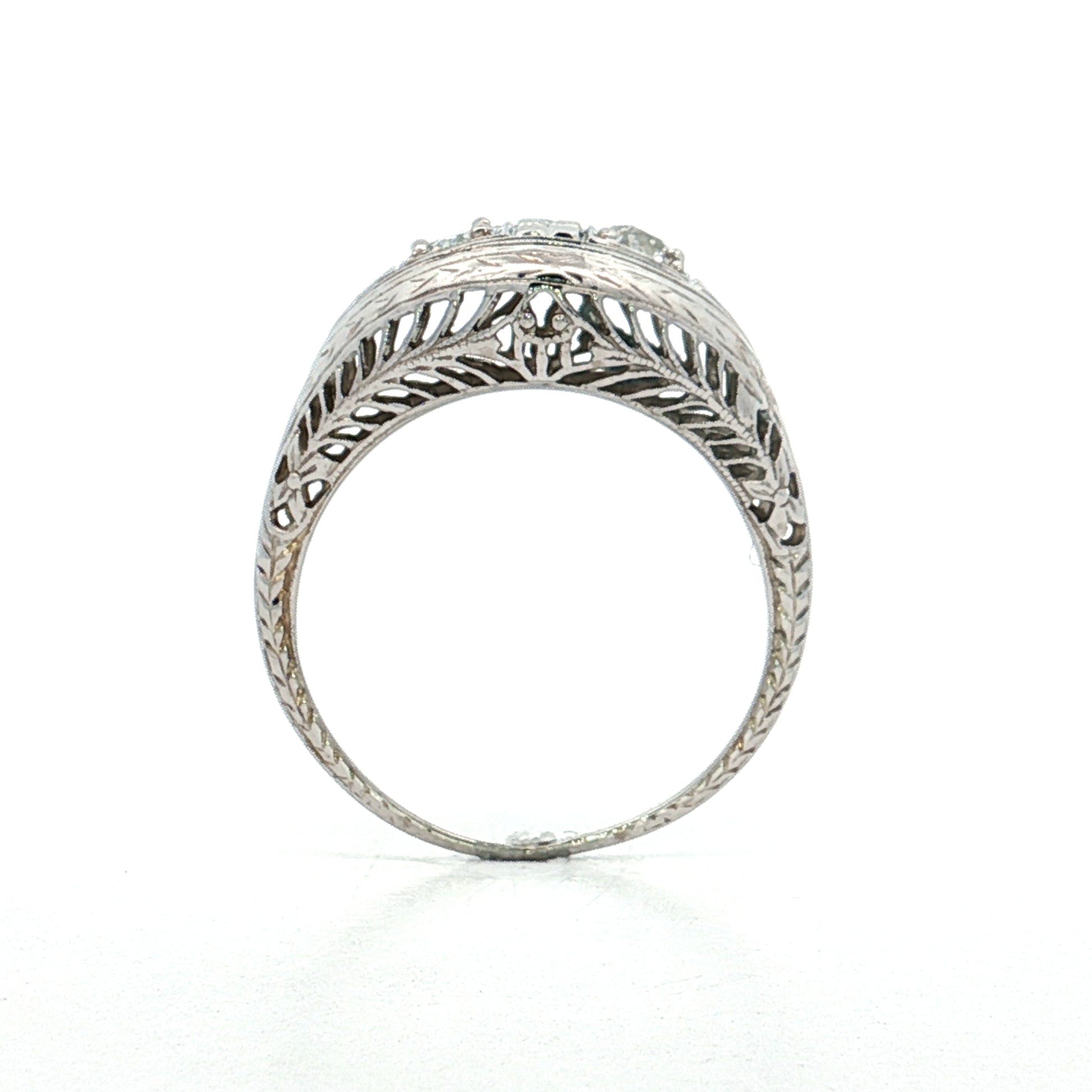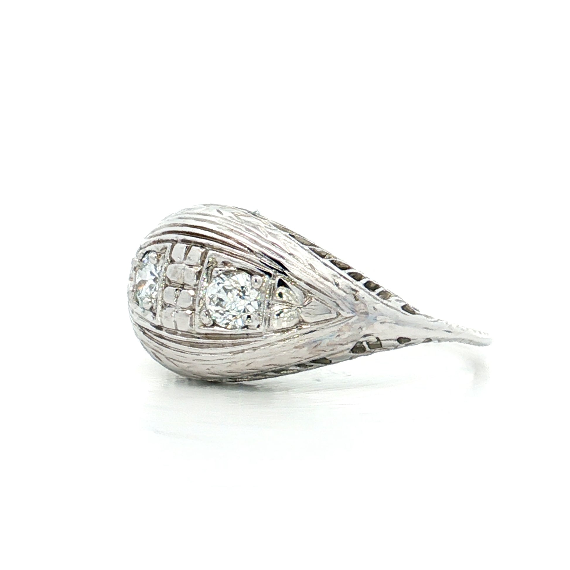 This Art Deco engagement ring features two old European cut diamonds totaling .30 carats with VS2 and SI1 clarity grades and H and I color grades respectively. The diamonds sit in an intricate filigree mounting made from 18 karat white gold. The band displays chevron engraving that complements the Art Deco styling from the 1920s-1930s era. The Toi Et Moi design places the two diamonds side by side, symbolizing two souls coming together in the French romantic tradition.