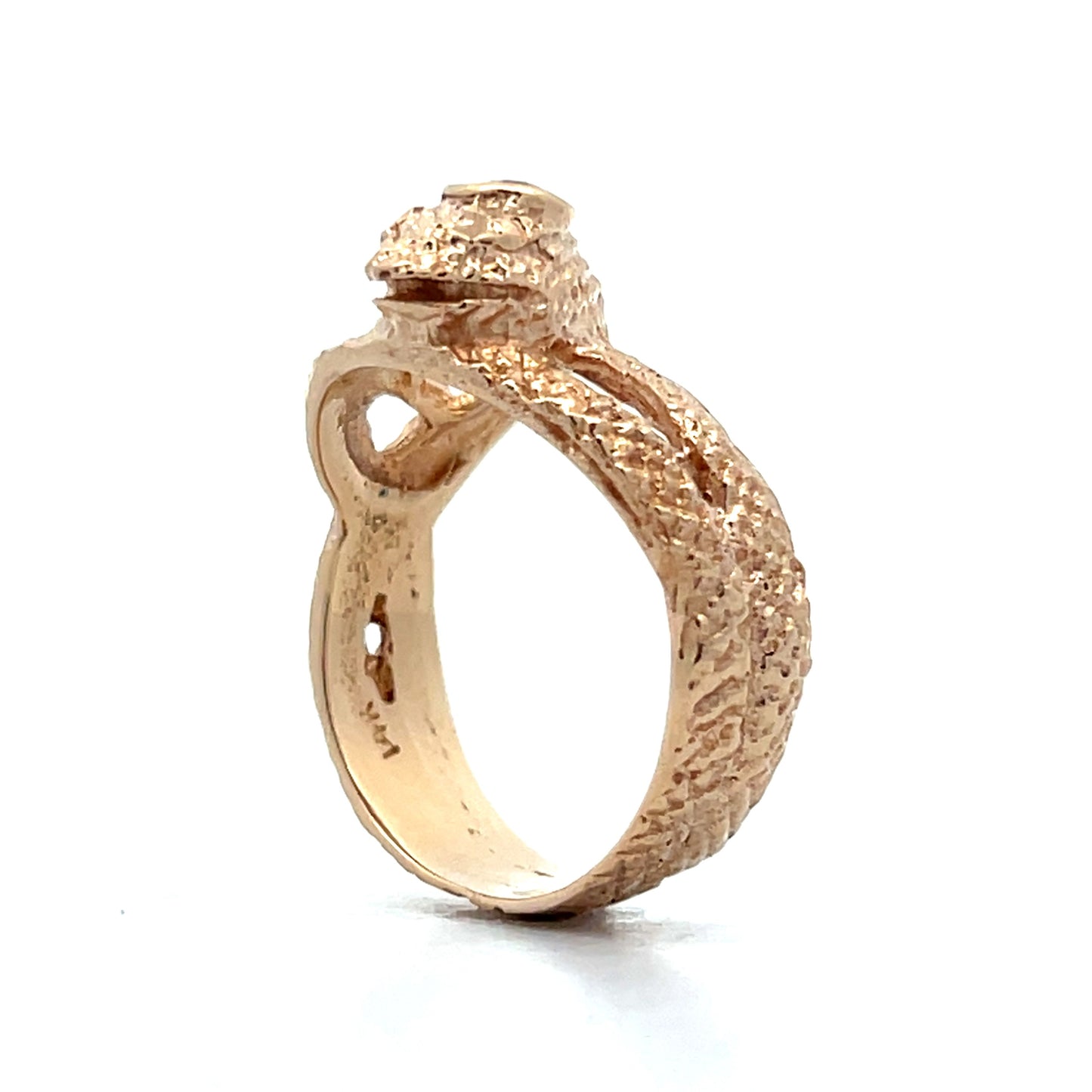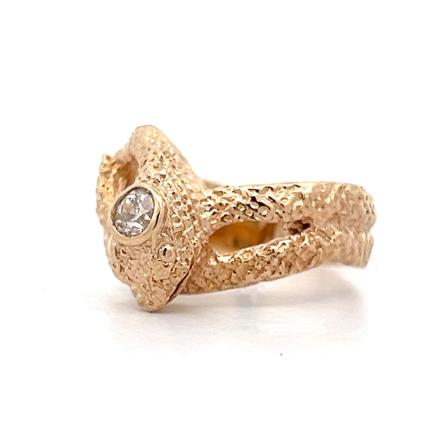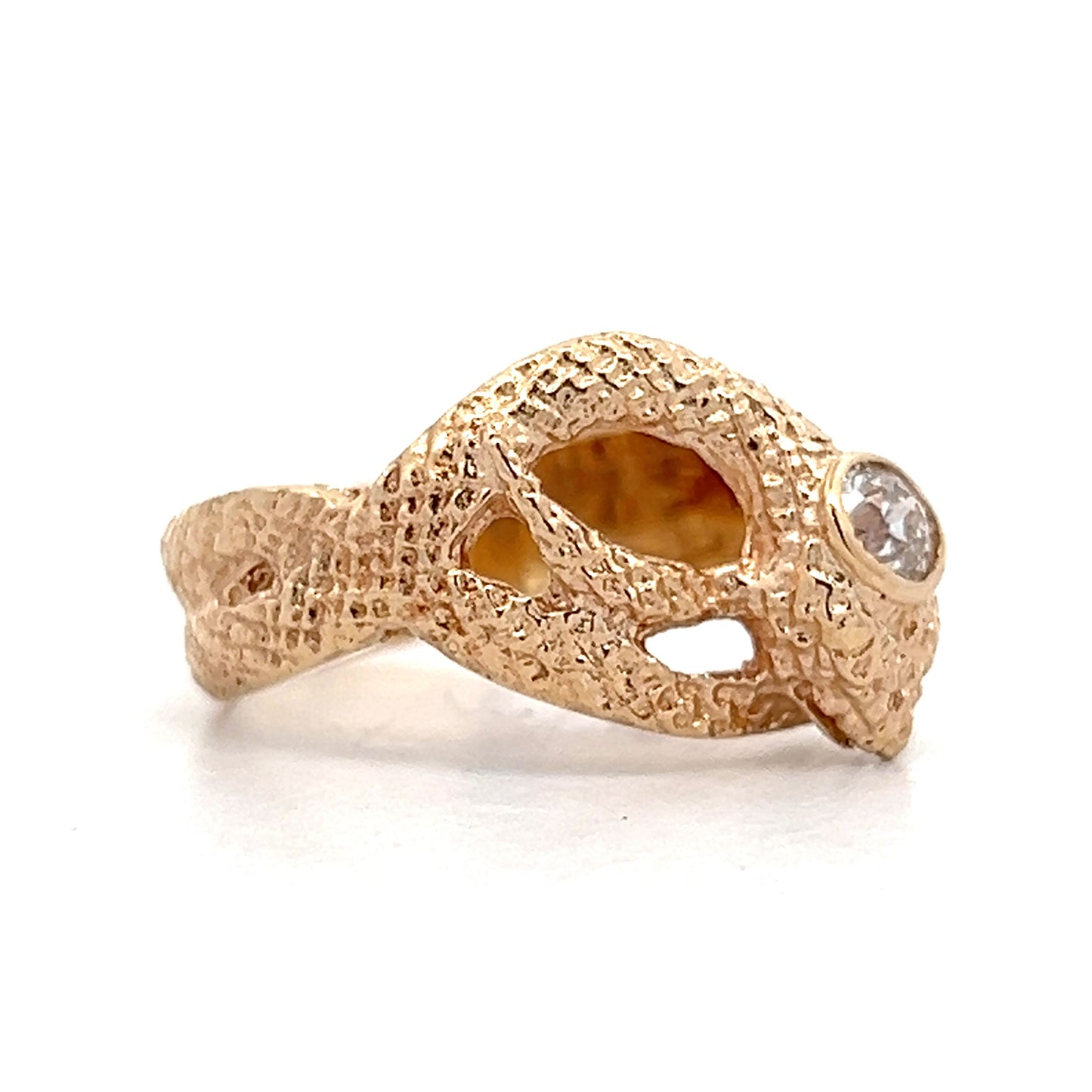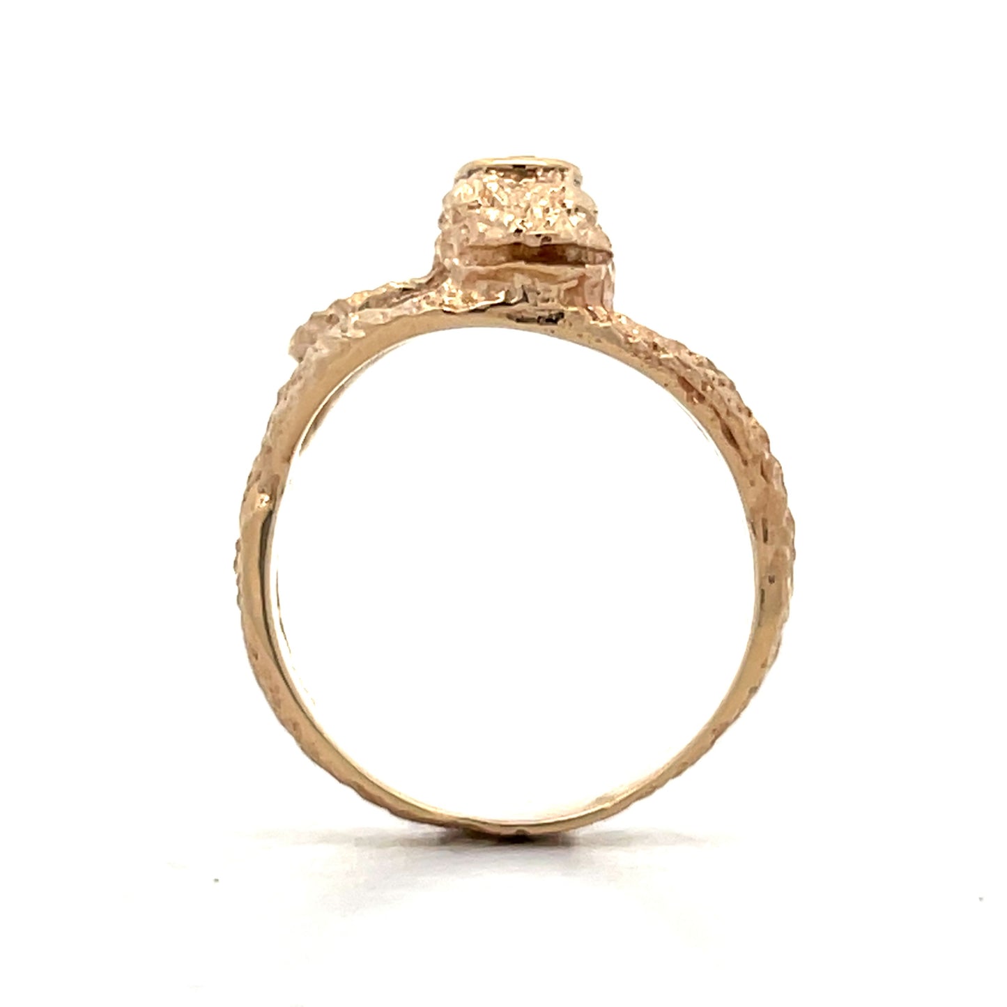This vintage snake cocktail ring is crafted in 14 karat yellow gold and brings mid-century style to life with its intricately textured scales and lifelike design. At the serpent's head is a .30 carat Old Mine cut diamond. A unique statement piece, this ring blends mysterious serpentine motifs with vintage charm, making it a standout addition to any collection.