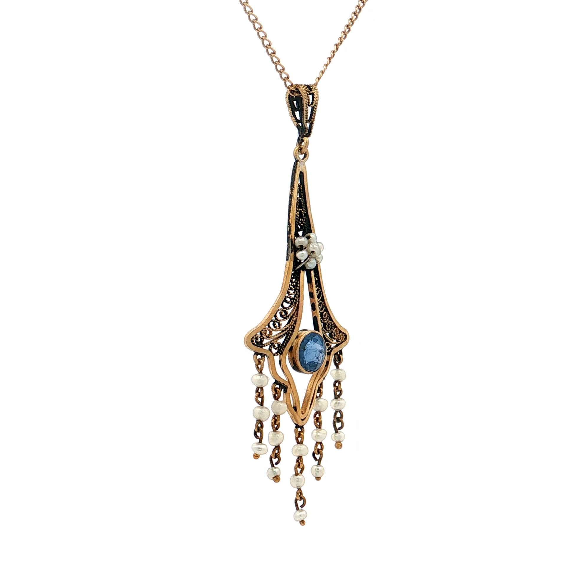 The sapphire displays the deep blue color characteristic of this gemstone, and the round cut maximizes its color saturation. Seed pearls dangle from the pendant in a chandelier arrangement, creating movement and adding their soft, iridescent luster to the design.