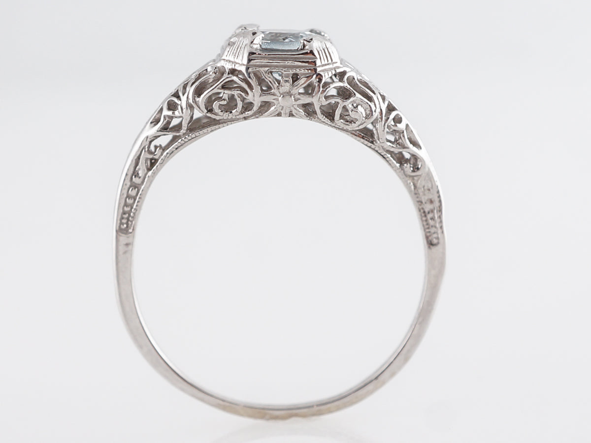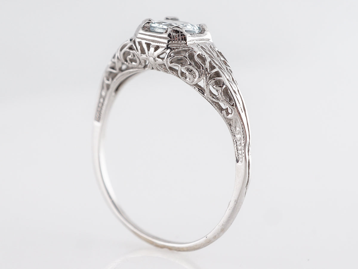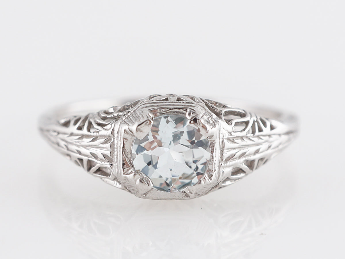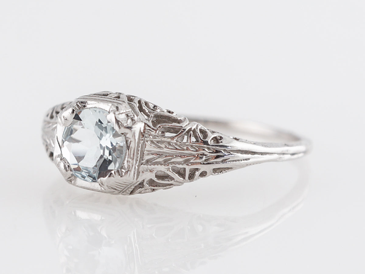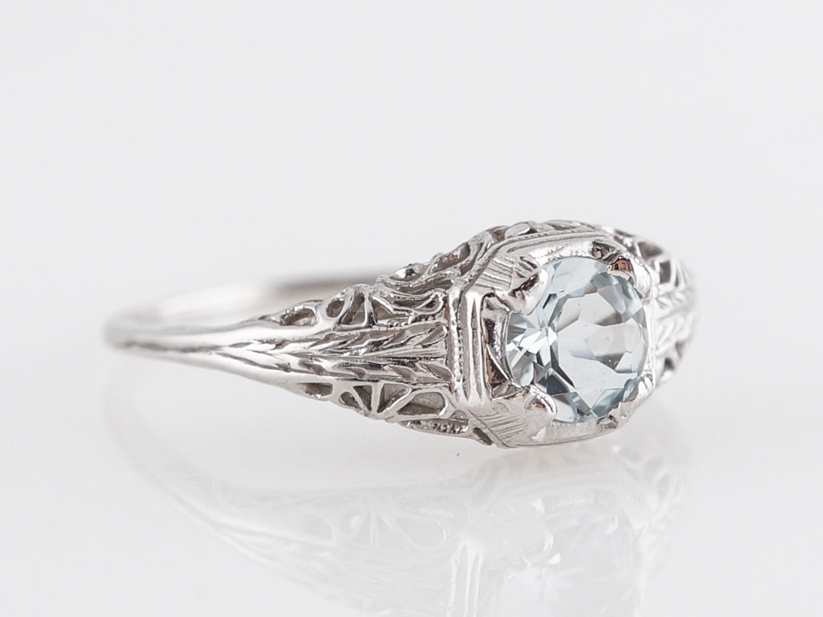 .31 Art Deco Aquamarine Engagement Ring in White Gold. This beautiful Art Deco engagement ring features a .31 carat round cut aquamarine set in 14 karat white gold. Full of filigree engravings, this ring has beautiful lines running down the shoulder. The aquamarine is held by four (4) flat prongs in a smooth octagonal section. This is a very special vintage ring for someone looking for an alternative gemstone to a diamond.