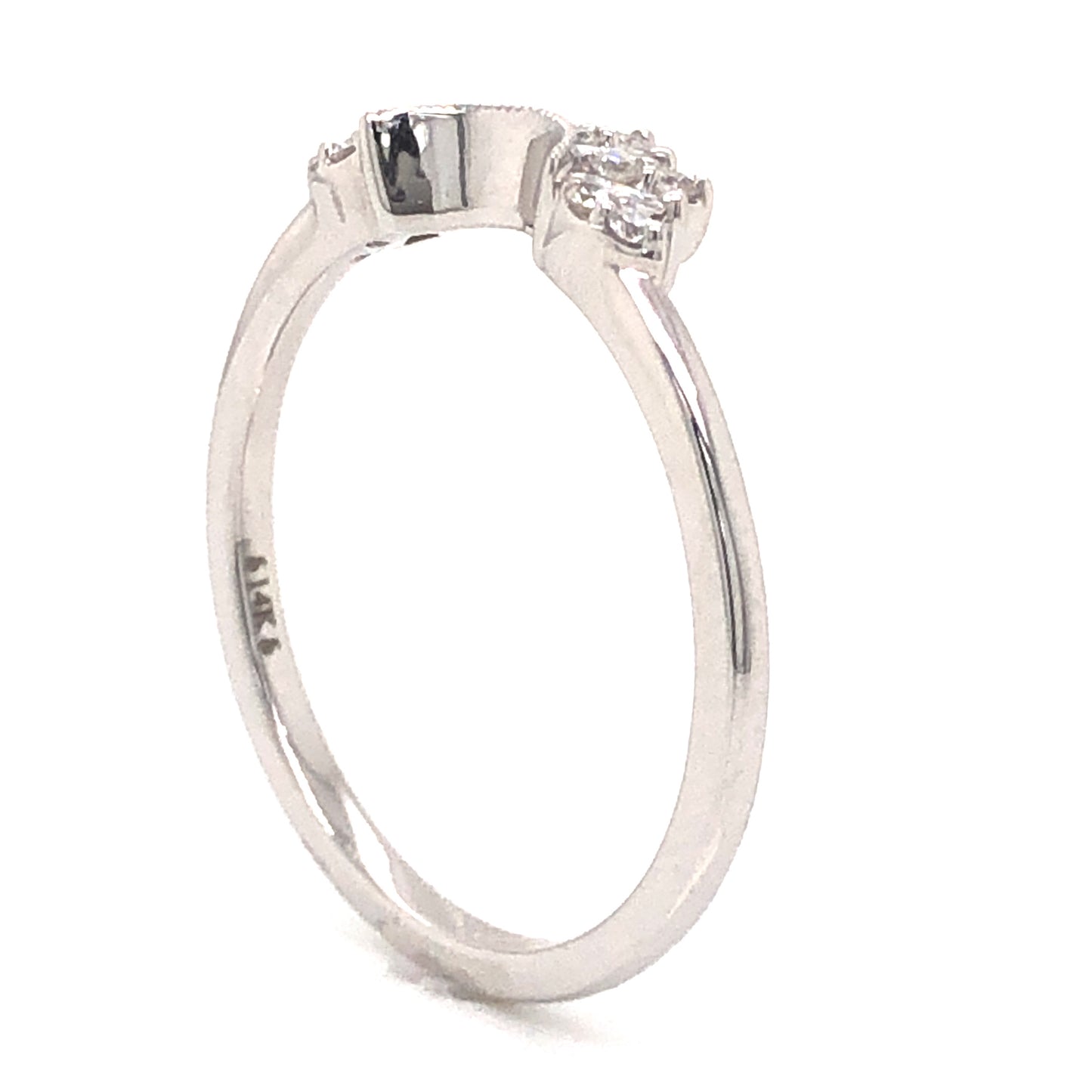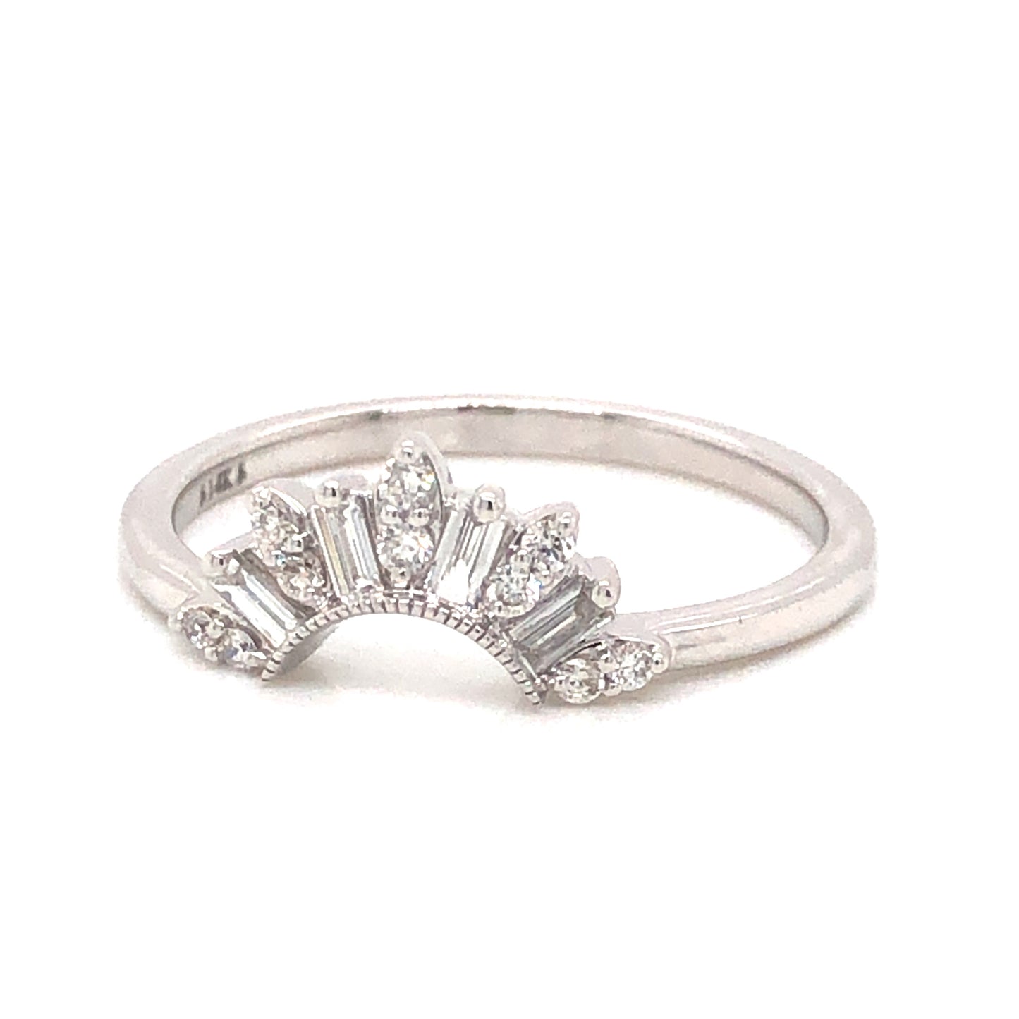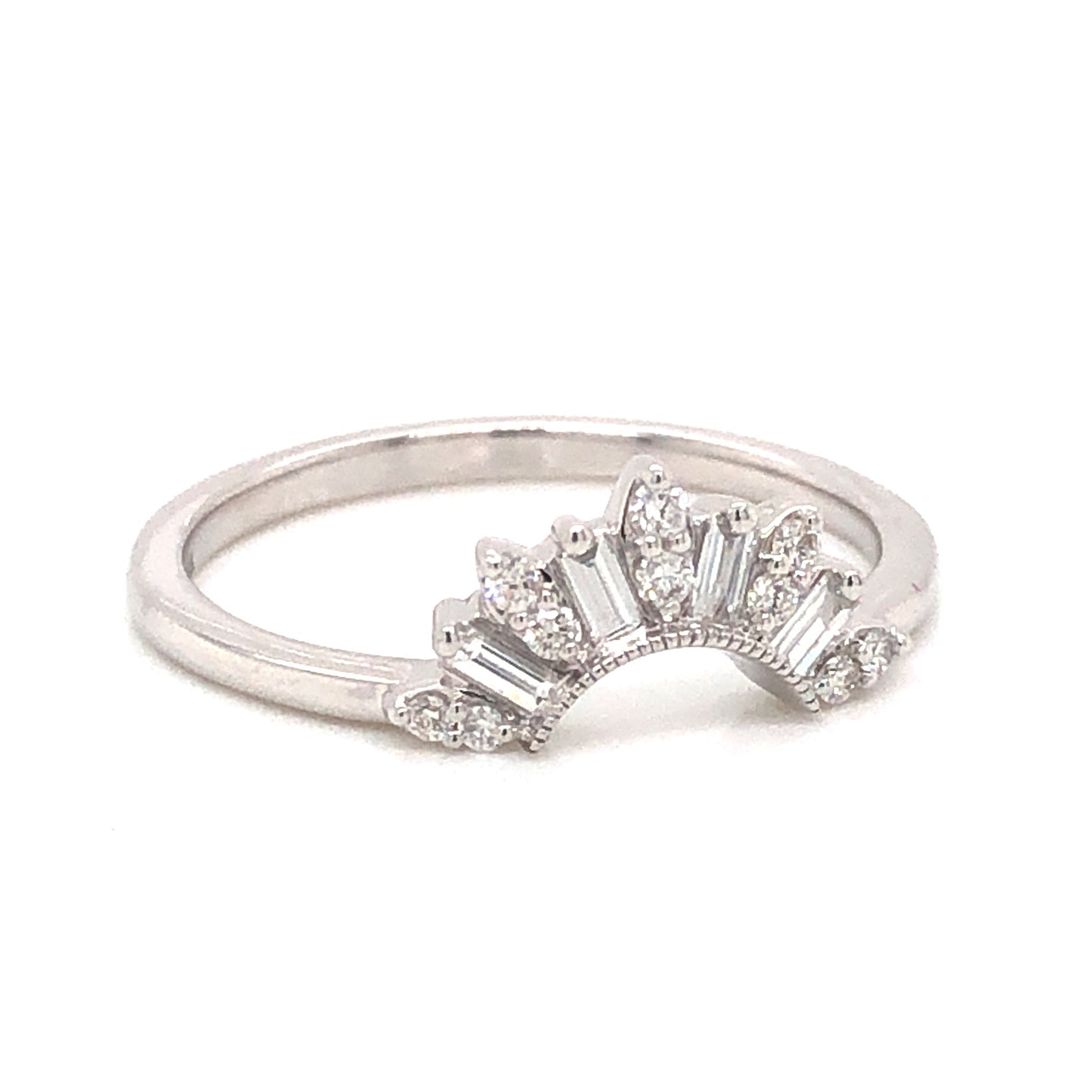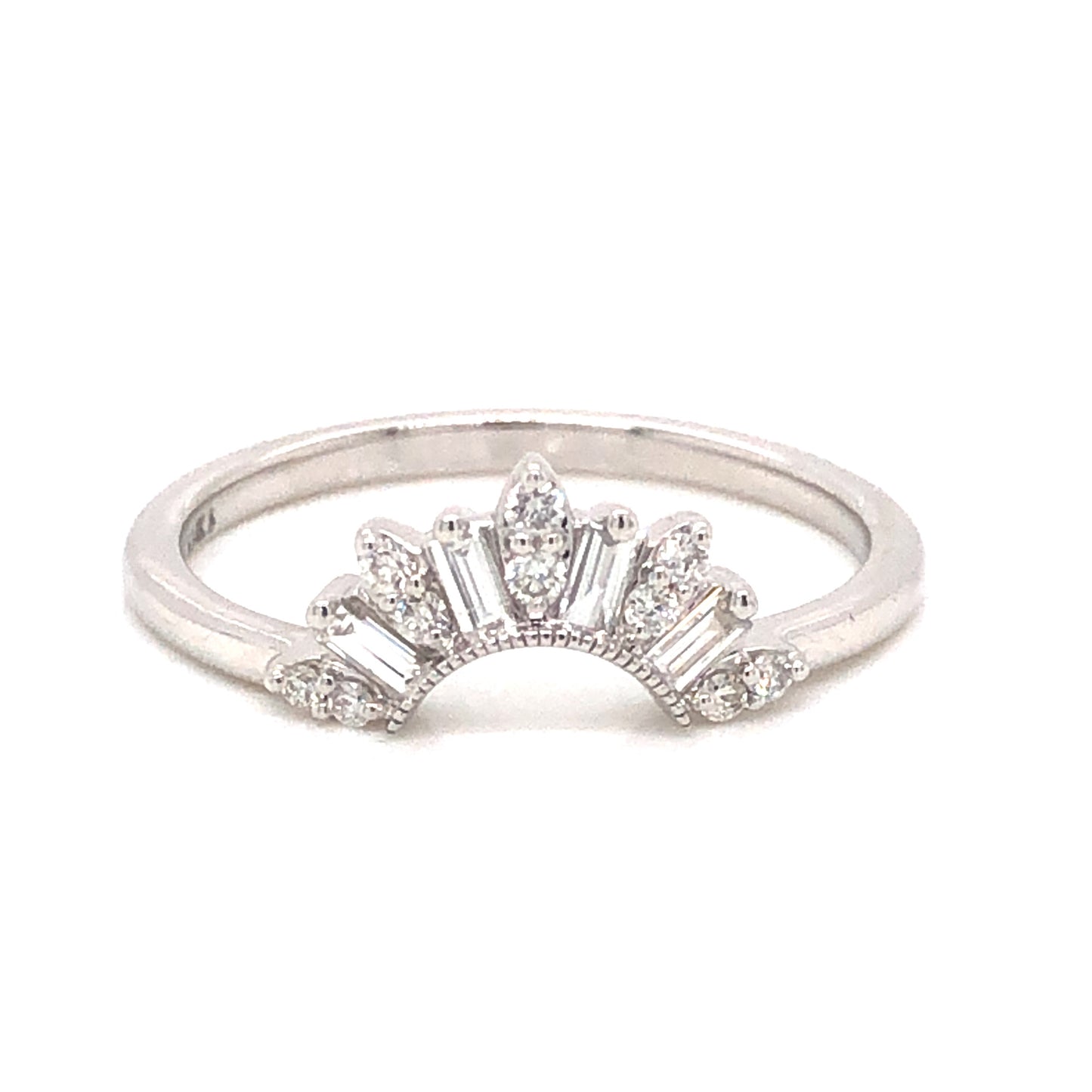 .31 Diamond Contour Wedding Band in 14k White Gold. This dazzling wedding band features .31 carats of diamonds finished in 14 karat white gold. Four (4) .04 carat baguette diamonds are set in between ten (10) .015 carat single cut diamonds. The collection of diamonds are nearly colorless with an impressive, eye clean clarity. The smaller diamonds are nestled in pairs inside of marquise-shaped mountings. The contour of the band feature milgrain engravings, finished on a polished 14k white gold band. The tiara form of this wedding band leaves room for the stone of a solitaire engagement ring or can be a stylish choice for a right hand stack.