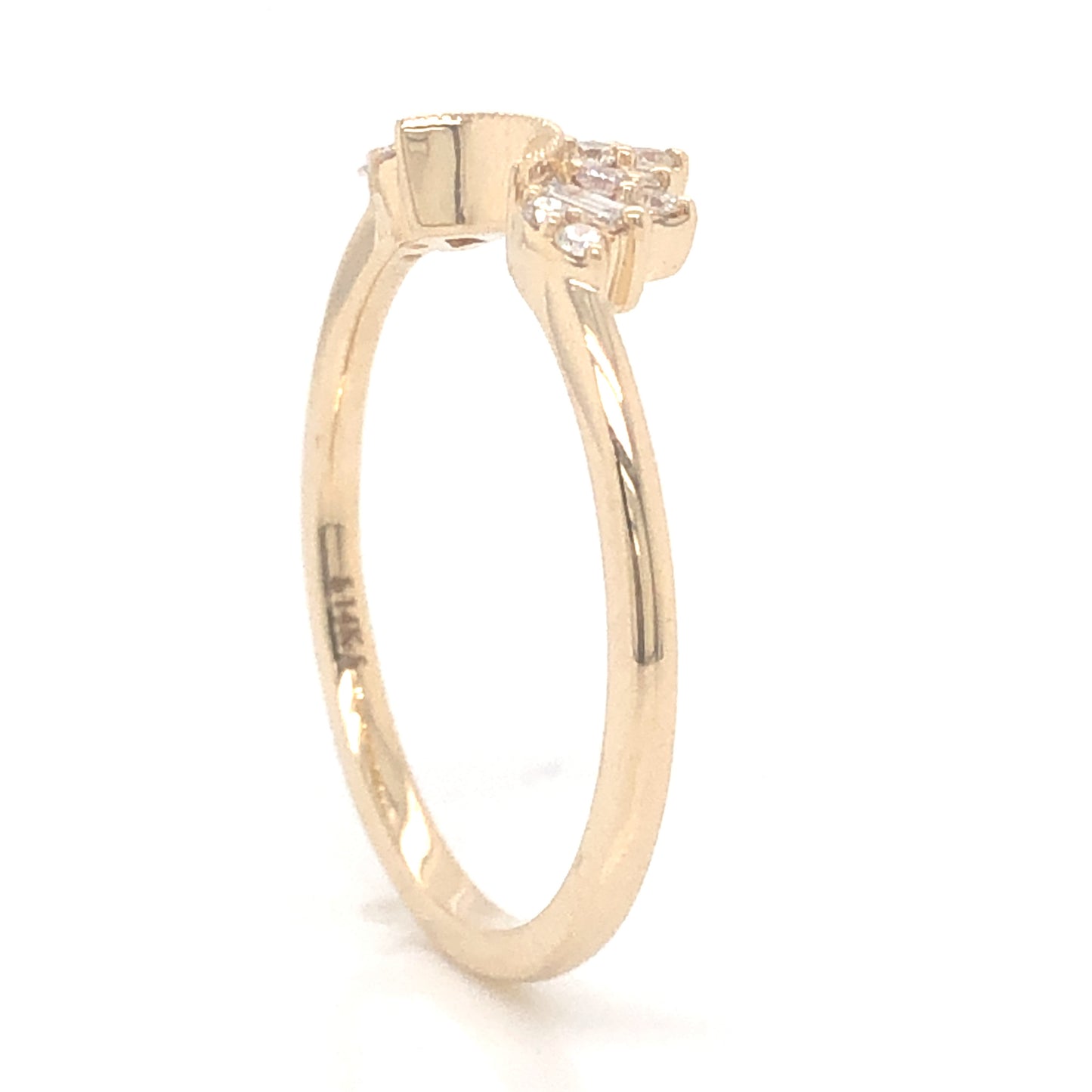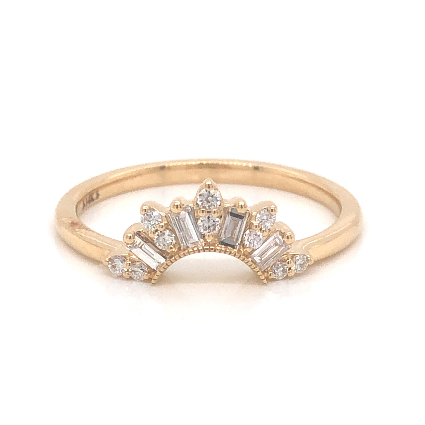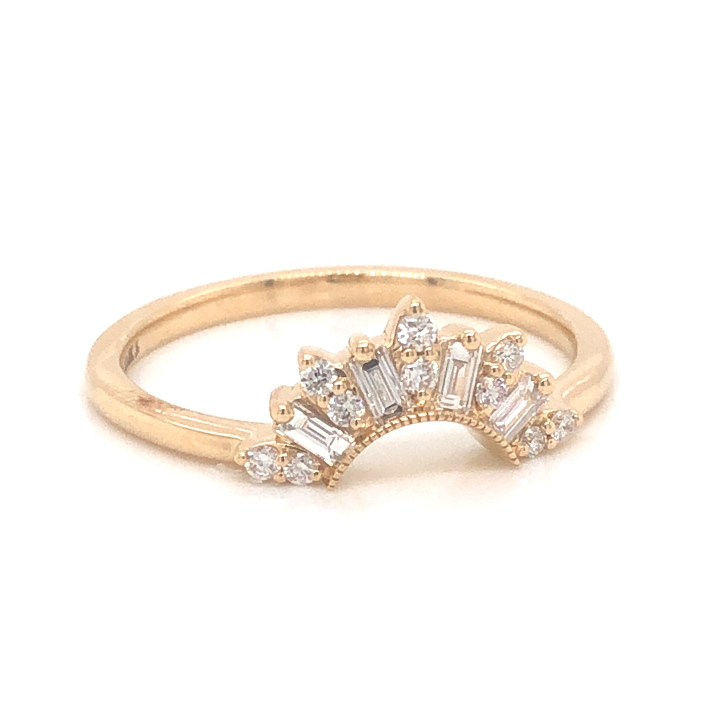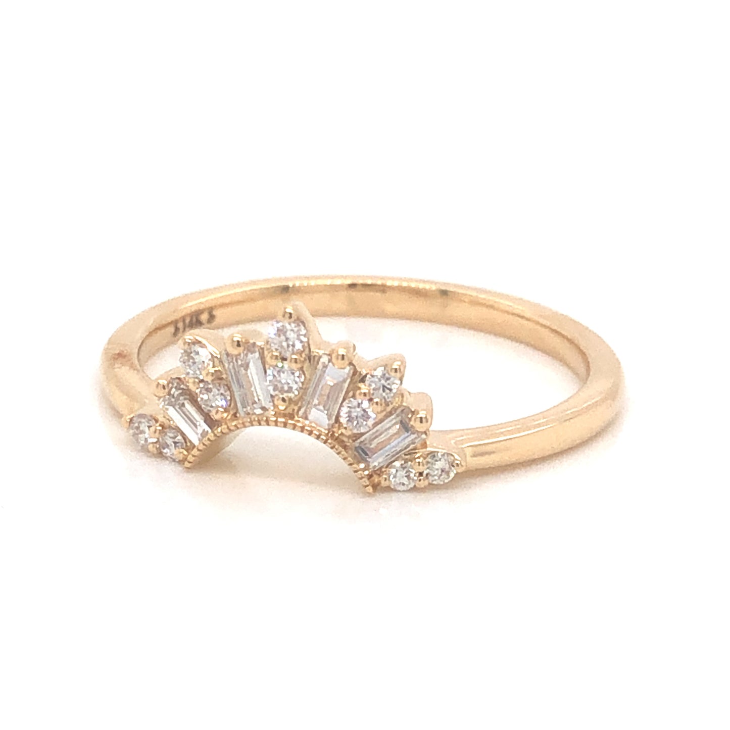 .31 Diamond Curved Wedding Band in 14k Yellow Gold. This dazzling tiara wedding band features .31 carats of diamonds in 14 karat yellow gold. Four (4) baguette diamonds and ten (10) Round Brilliant cut diamonds set in pairs create a lovely crown design. The curve of the band features fine milgrain engravings in highly polished 14k yellow gold. The band is comfortable to wear and pairs well with most engagement rings.