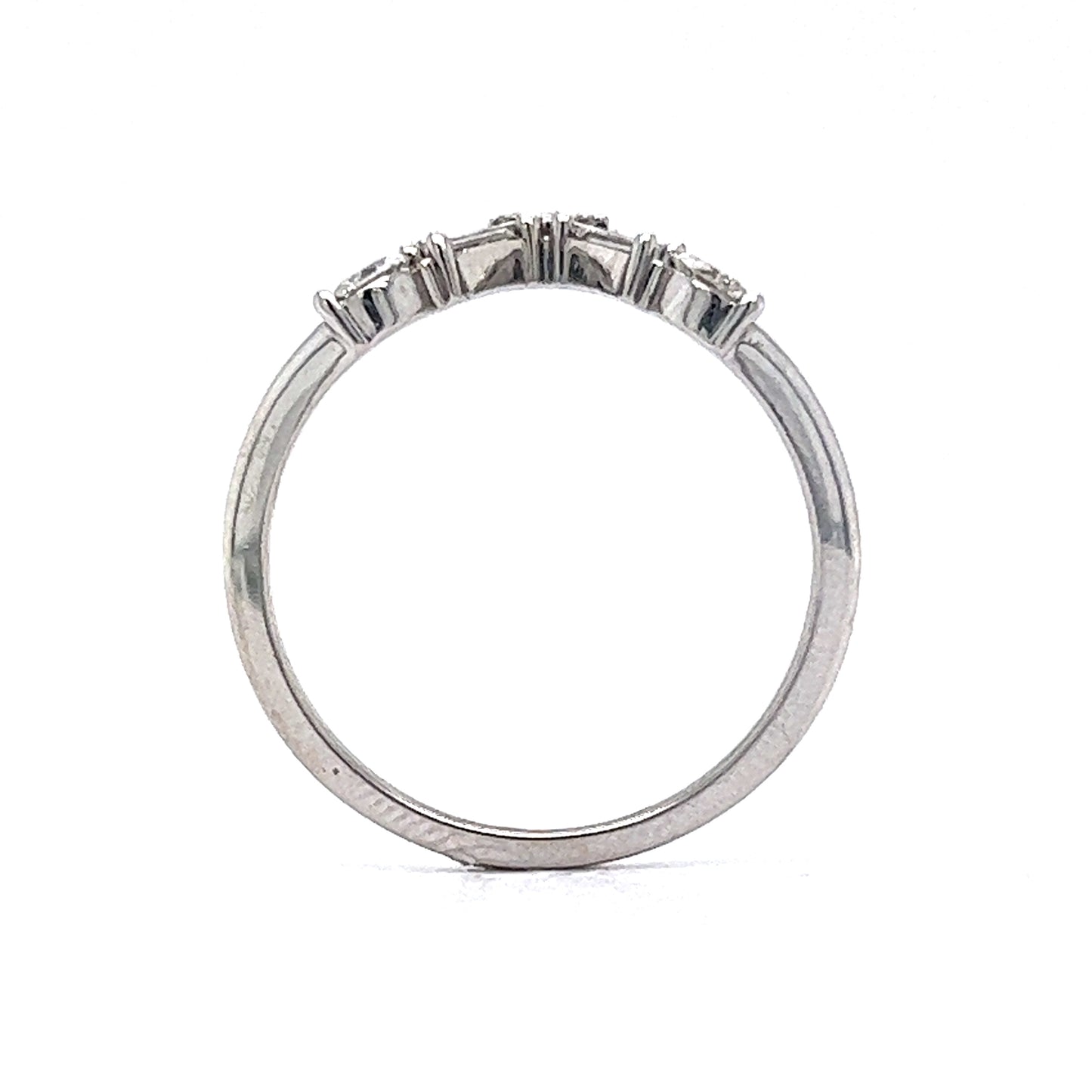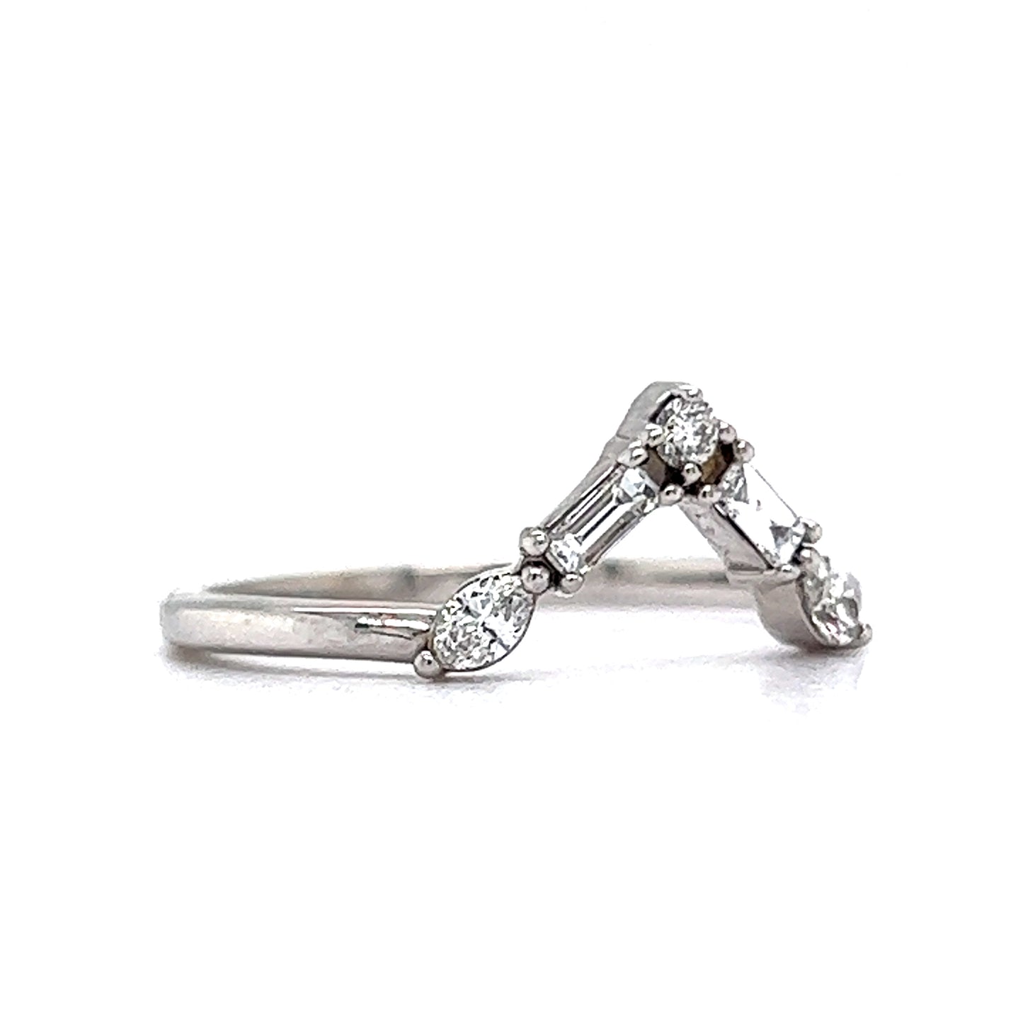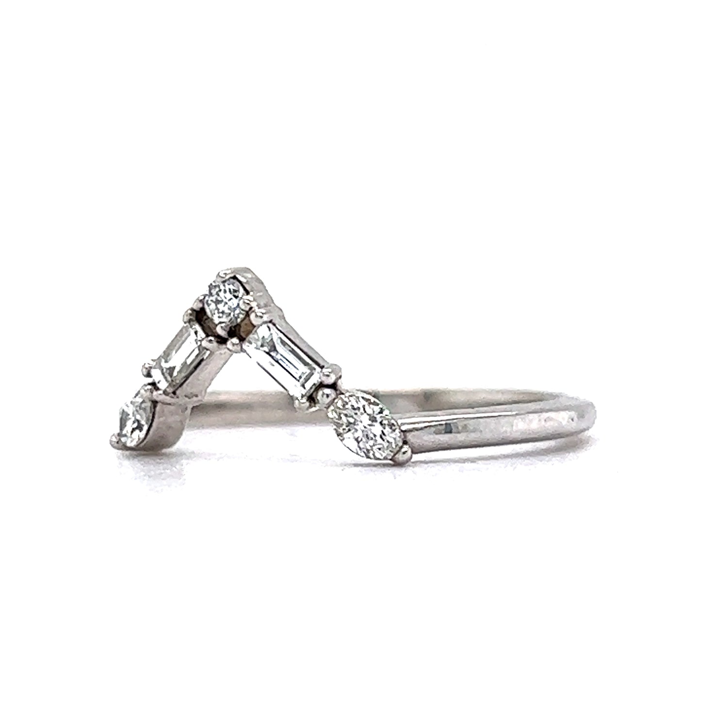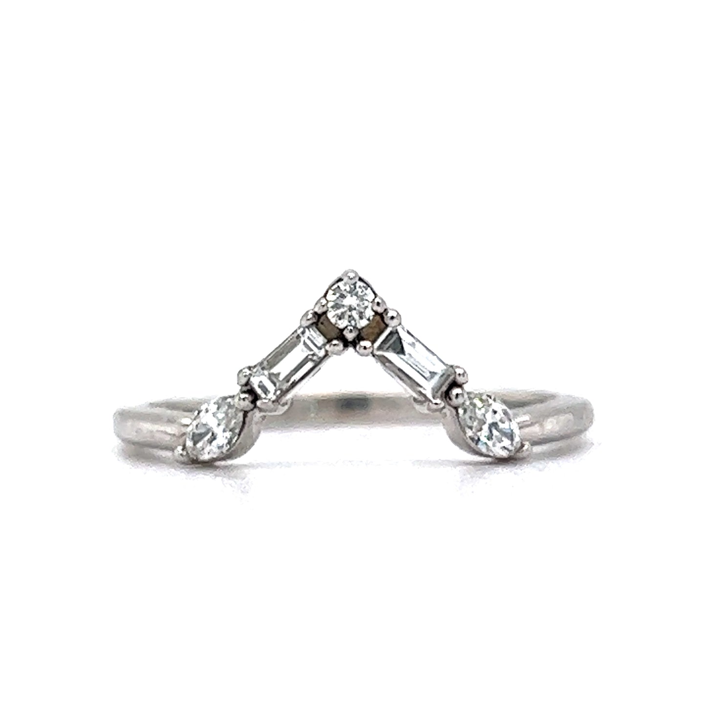 .31 Diamond V Shape Wedding Band in 14k White Gold. This modern V-shaped wedding band features .31 carats of brilliant diamonds finished in shimmering 14 karat white gold. The primary diamond weighs .03 carats and is set at the point of the notched wedding band. Two (2) .07 carat marquise cut diamonds and two (2) .07 carat baguette diamonds decorate the head of the ring. The gorgeous variety of diamond cuts brings an elegant texture and dimension to the style of the ring. Finished in polished 14k white gold, this wedding ring would make a perfect pair with a solitaire engagement ring or can be worn as an everyday stacking band!