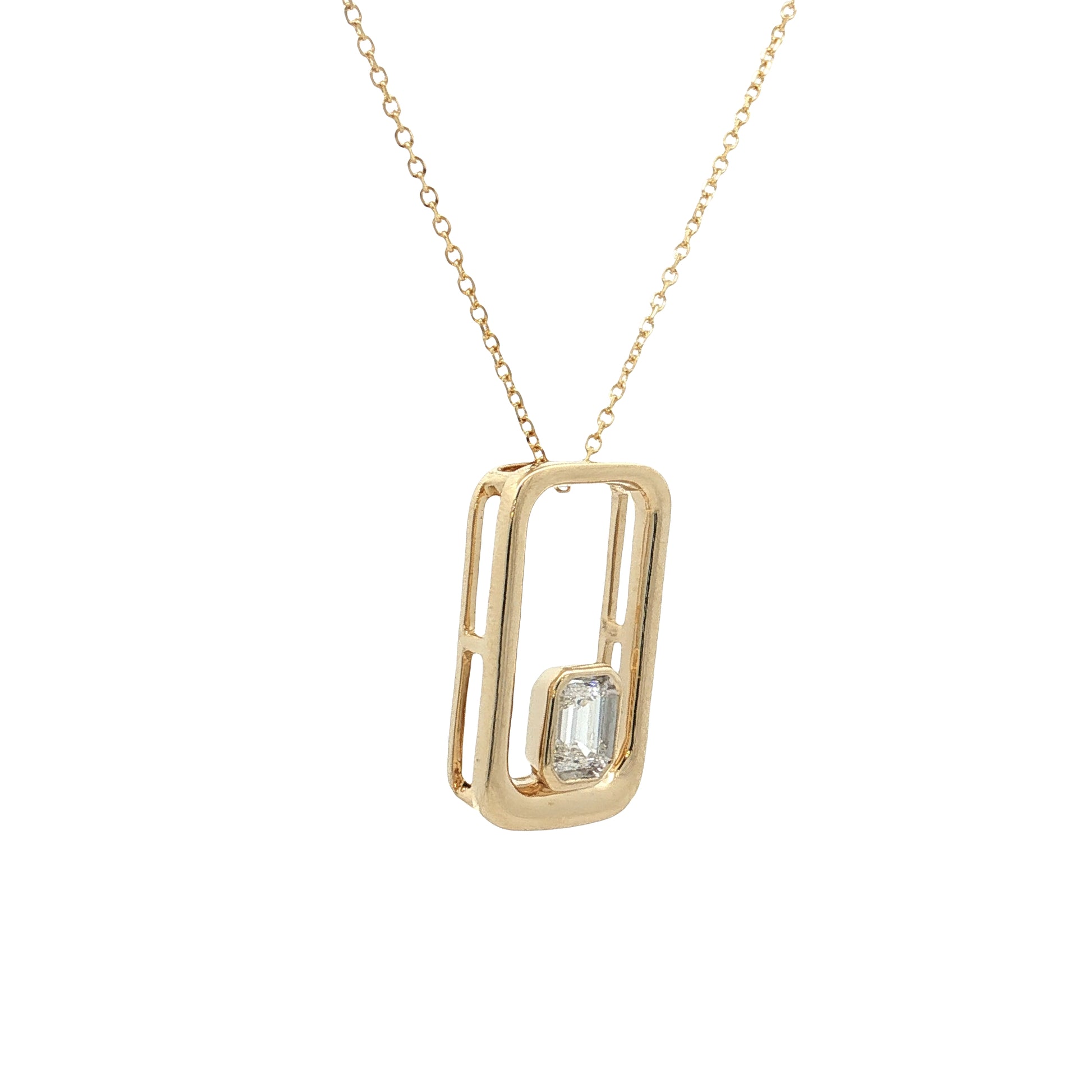 This 14 karat yellow gold pendant holds a .31 carat emerald cut diamond with H color and VS2 clarity in a collet setting. The H color means the diamond appears nearly white. At VS2 clarity, any inclusions are minor and invisible to the naked eye.